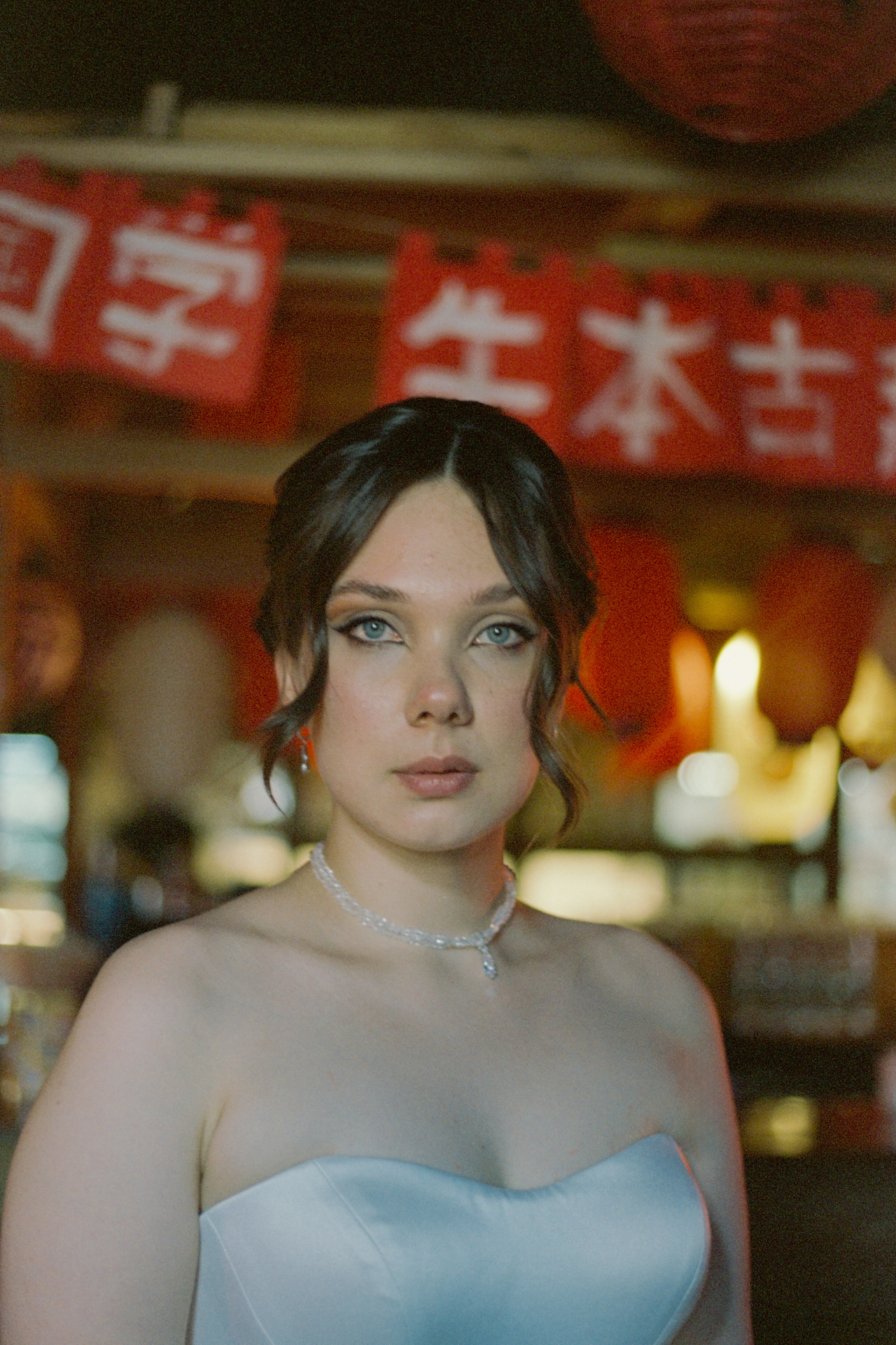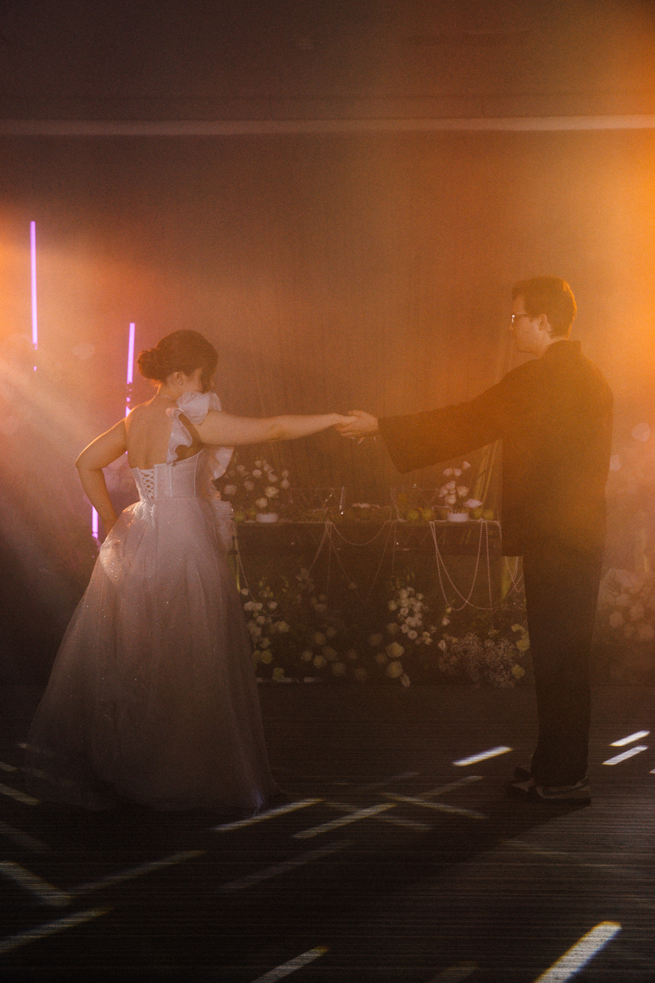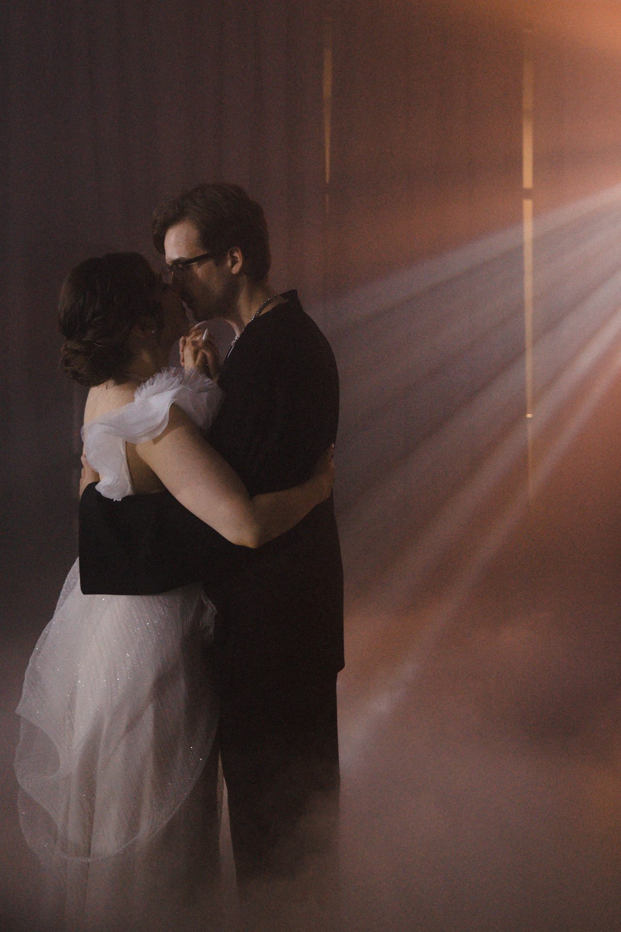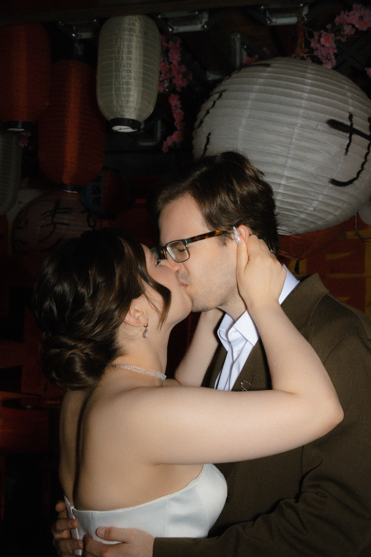 Мы решили объединить это всё воедино, и родилась идея разделить свадьбу на две части. Первая — элегантная и классическая, вторая — неформальная и тусовочная. Это разделение мы подчеркнули и в нашей фотосессии. Первая локация — это художественный музей, вторая — азиатский бар с неоновыми огнями.
