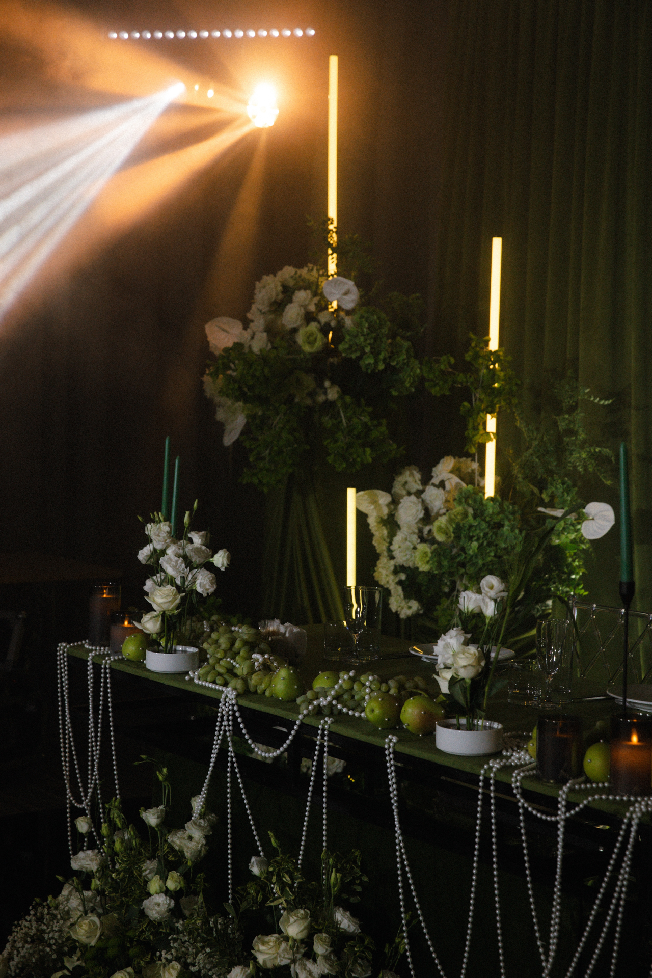 Исходя из этой концепции, палитру для декора мы сделали в природных зелёно-белых оттенках для первой части, а во второй добавили неоновые светодиоды. А ещё мне с самого начала хотелось настоящего шоу в момент выноса торта. Мы подумали и решили добавить буквально немного огня — и подожгли наш свадебный торт! Это было просто потрясающе и незабываемо.