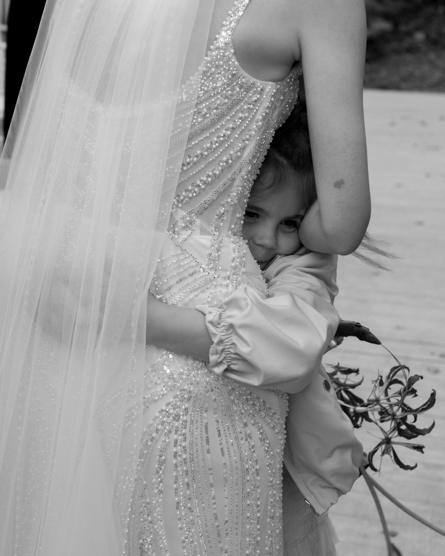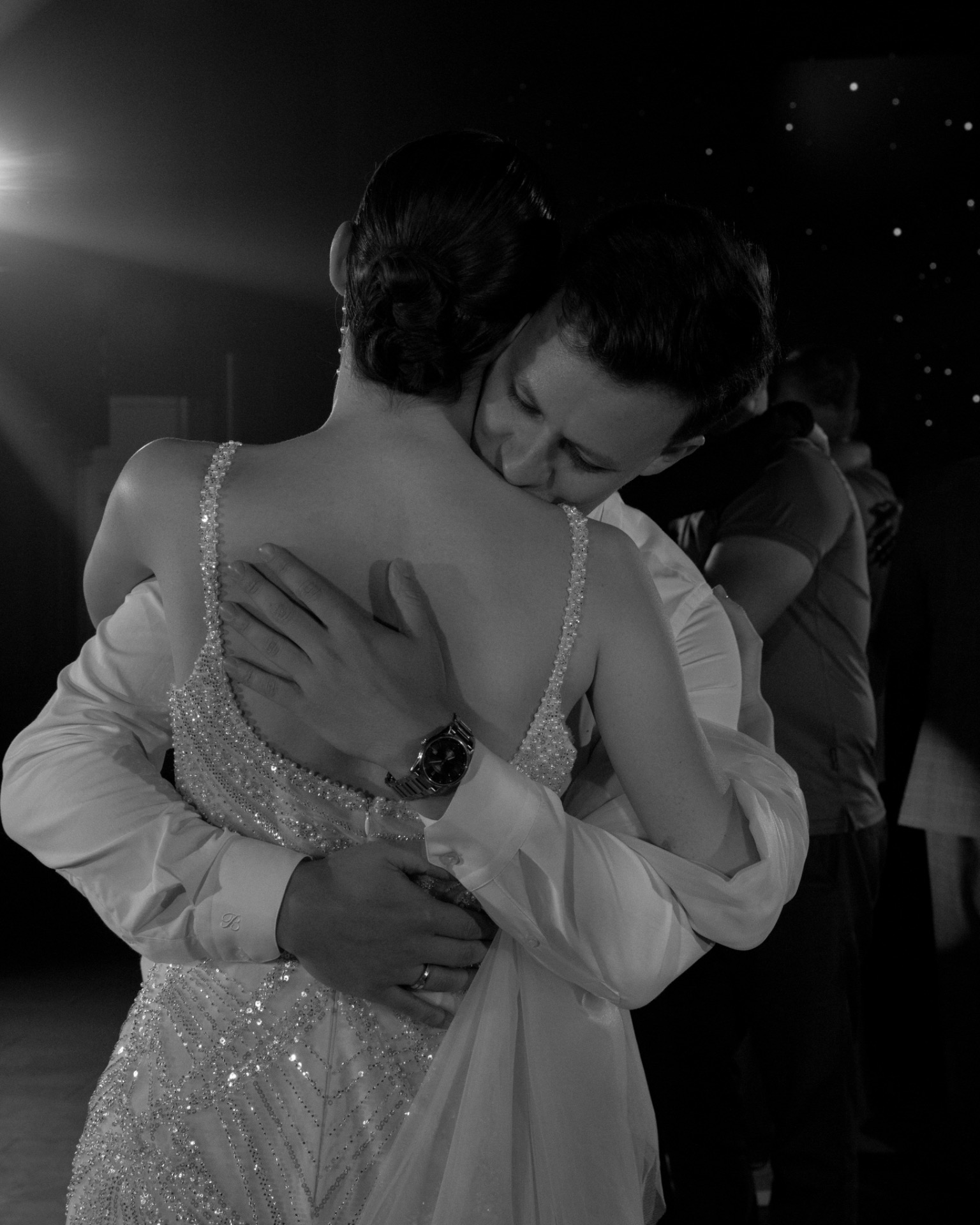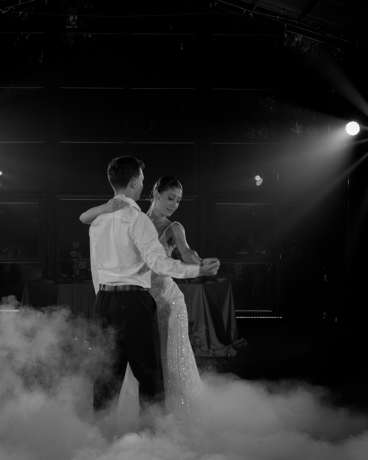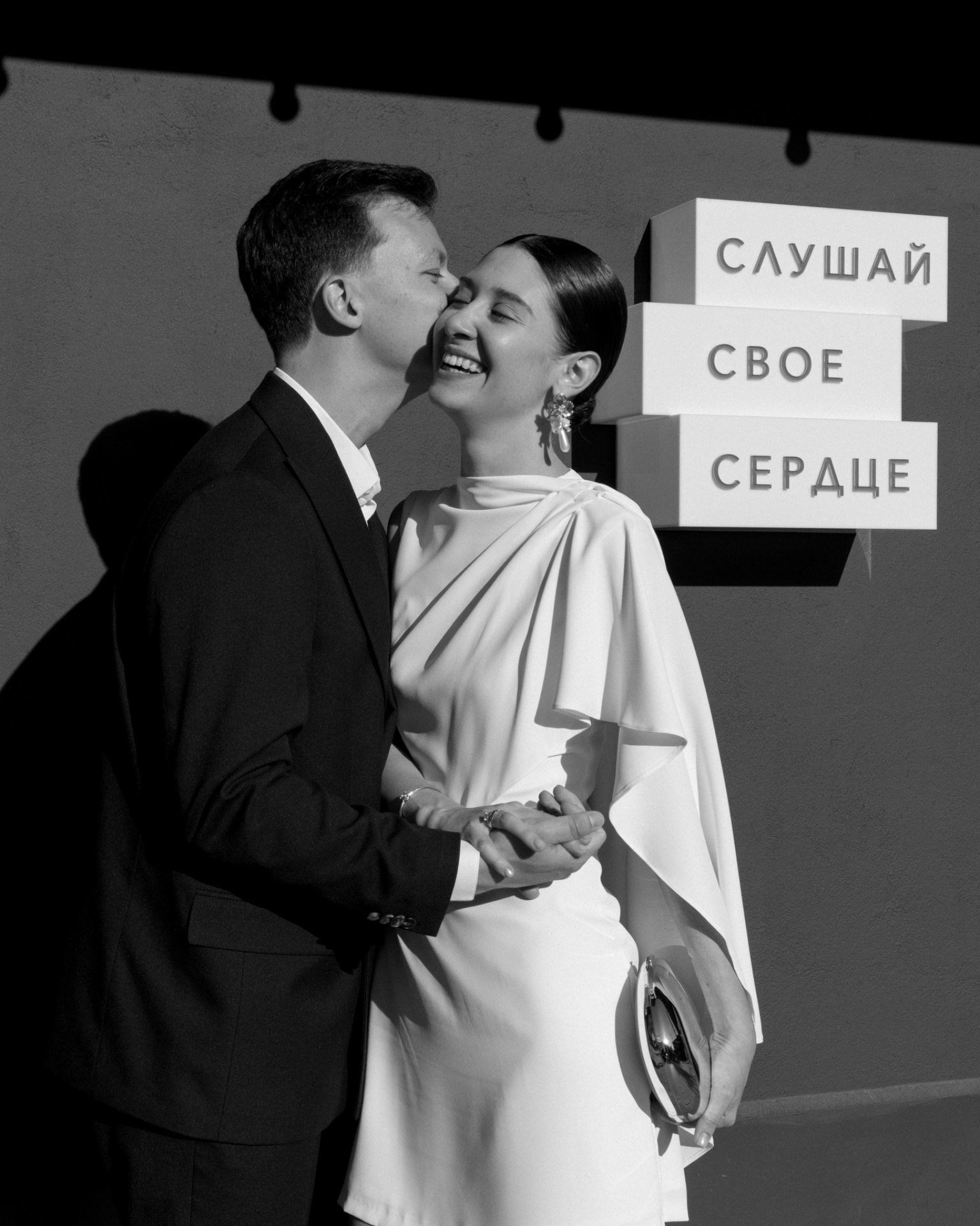 Для себя я выбрала молочное платье прямого силуэта в пол, расшитое жемчугом и камнями. Оно подчеркнуло мою хрупкость и в сочетании с остальными элементами сделало мой образ нежным и выразительным на фоне наших декораций. А причёска и макияж добавили моему наряду «голливудского» настроения. Мне было важно выглядеть одновременно нежно и ярко.