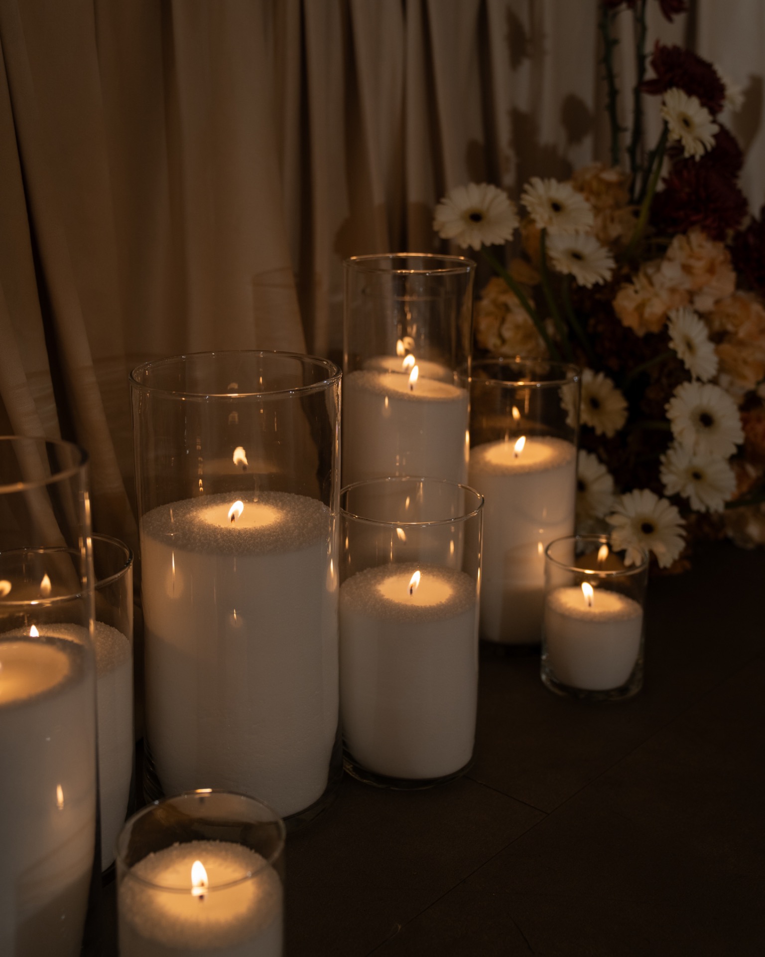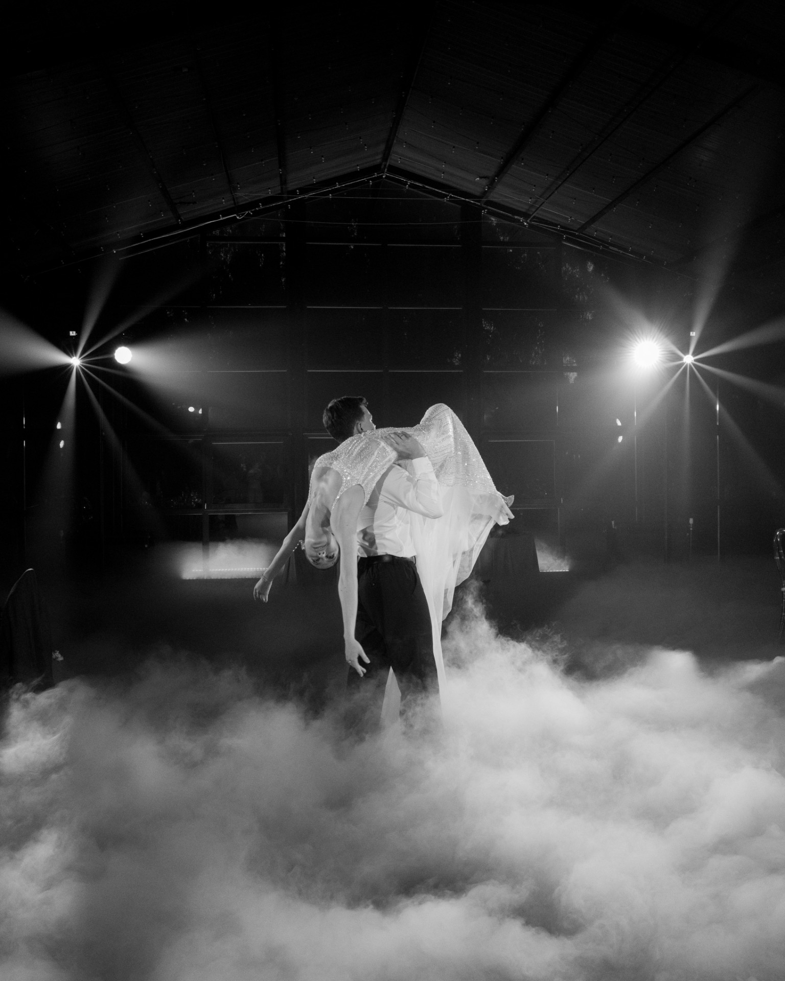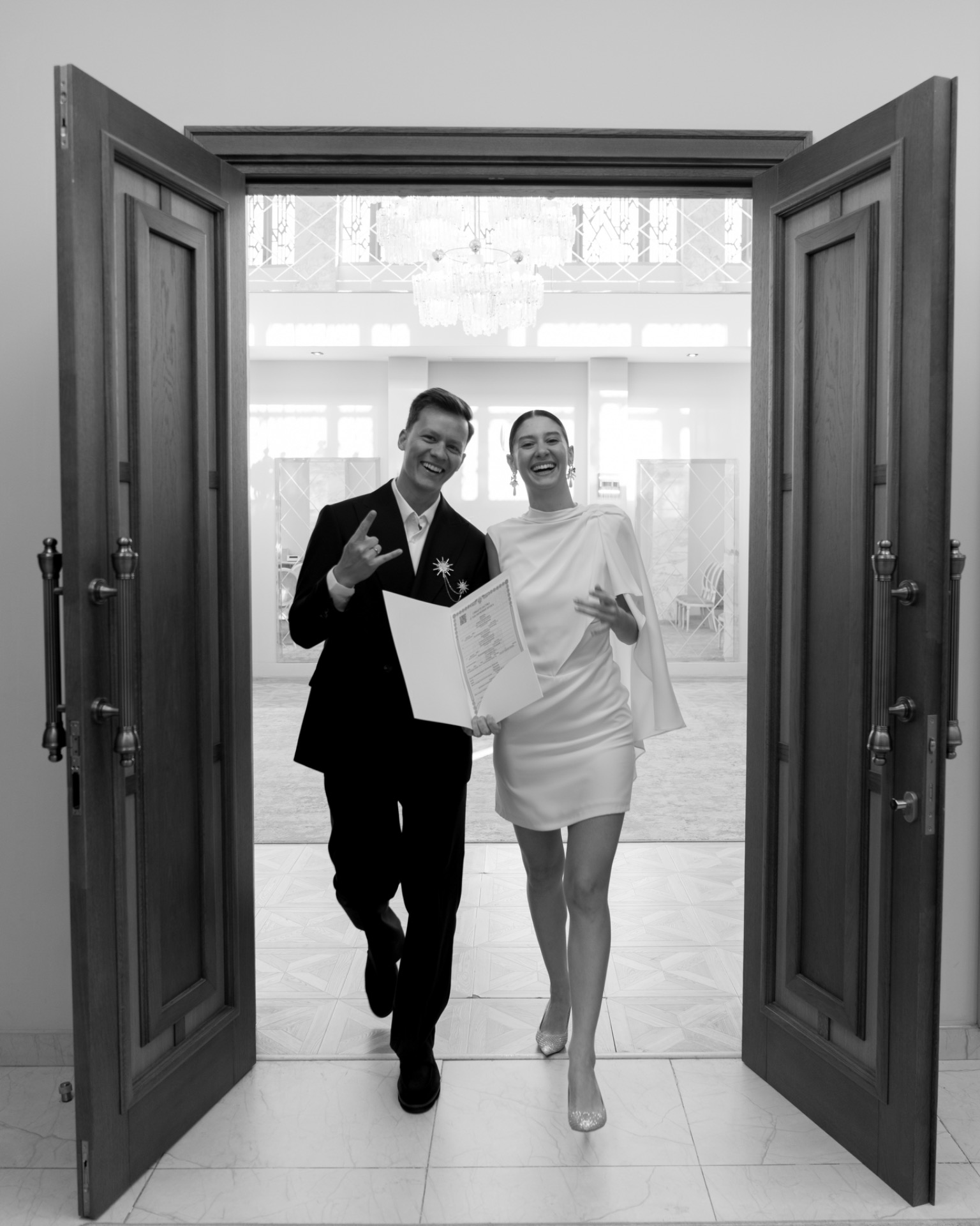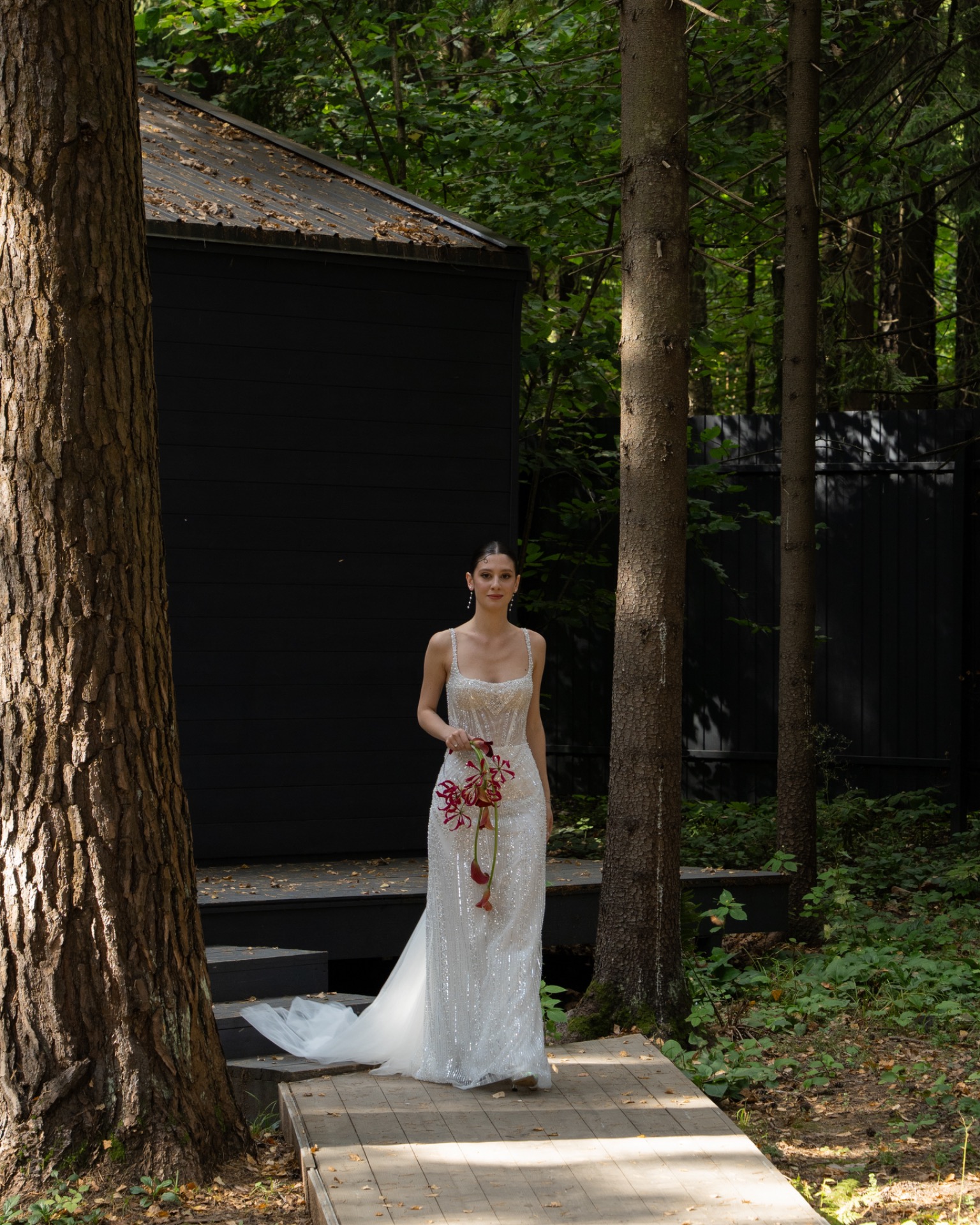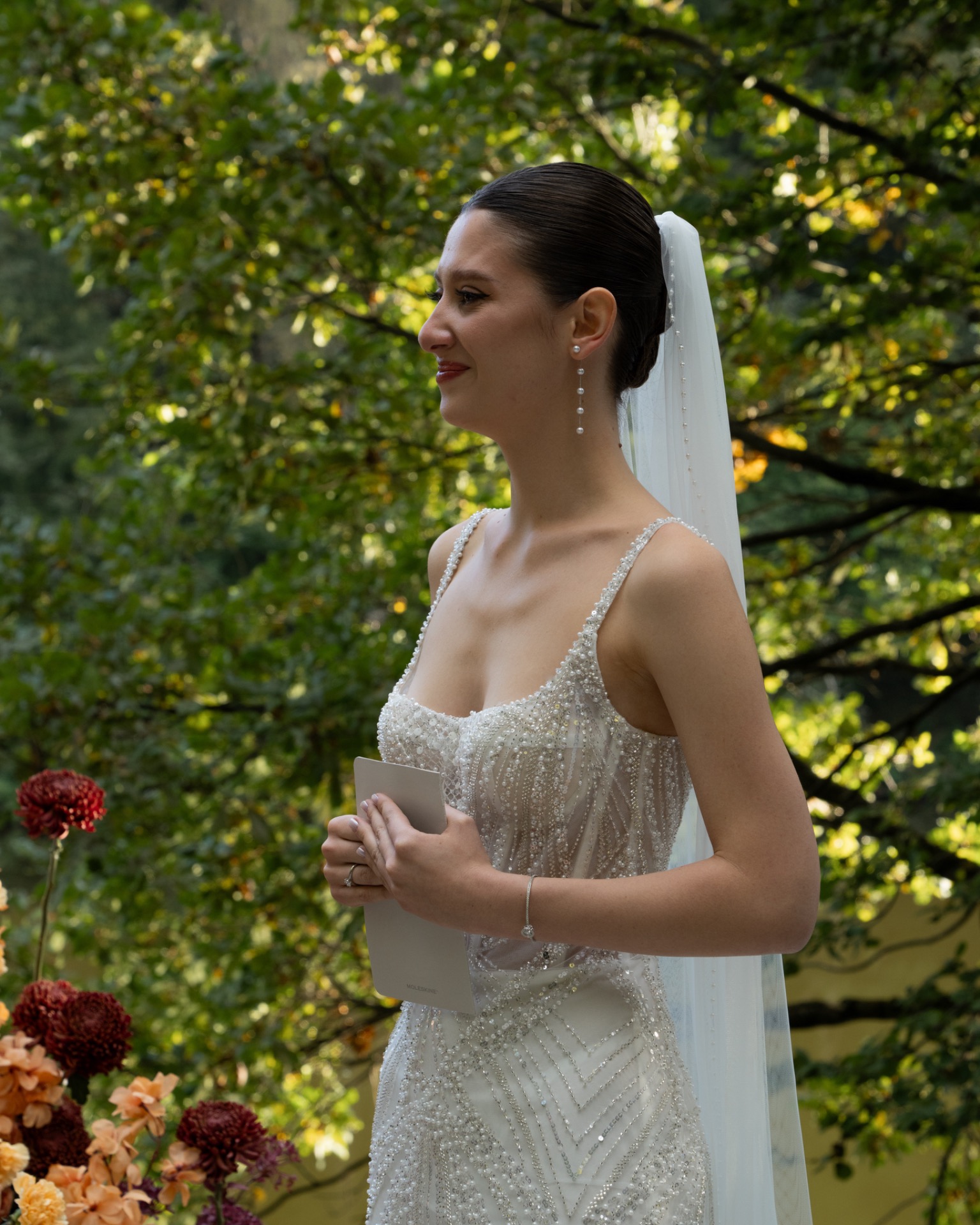 Для себя я выбрала молочное платье прямого силуэта в пол, расшитое жемчугом и камнями. Оно подчеркнуло мою хрупкость и в сочетании с остальными элементами сделало мой образ нежным и выразительным на фоне наших декораций. А причёска и макияж добавили моему наряду «голливудского» настроения. Мне было важно выглядеть одновременно нежно и ярко.