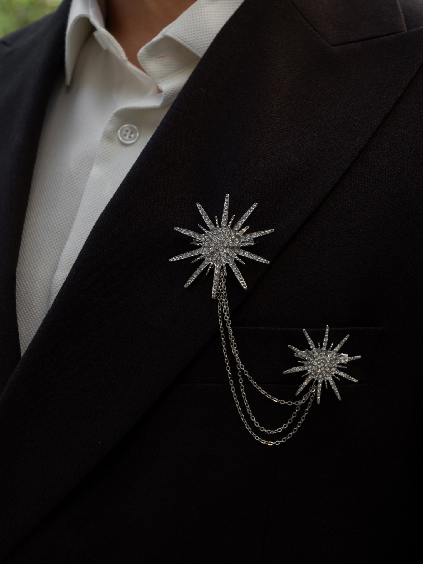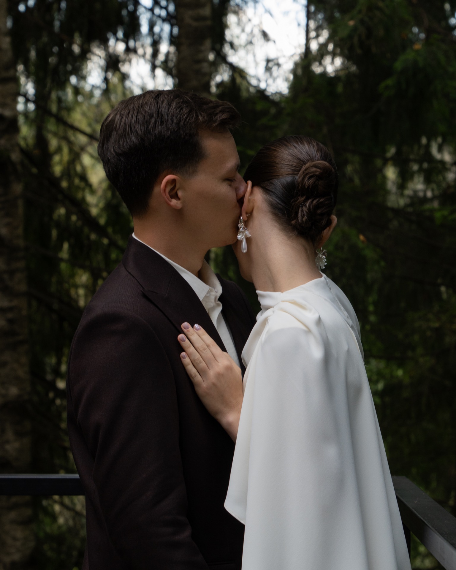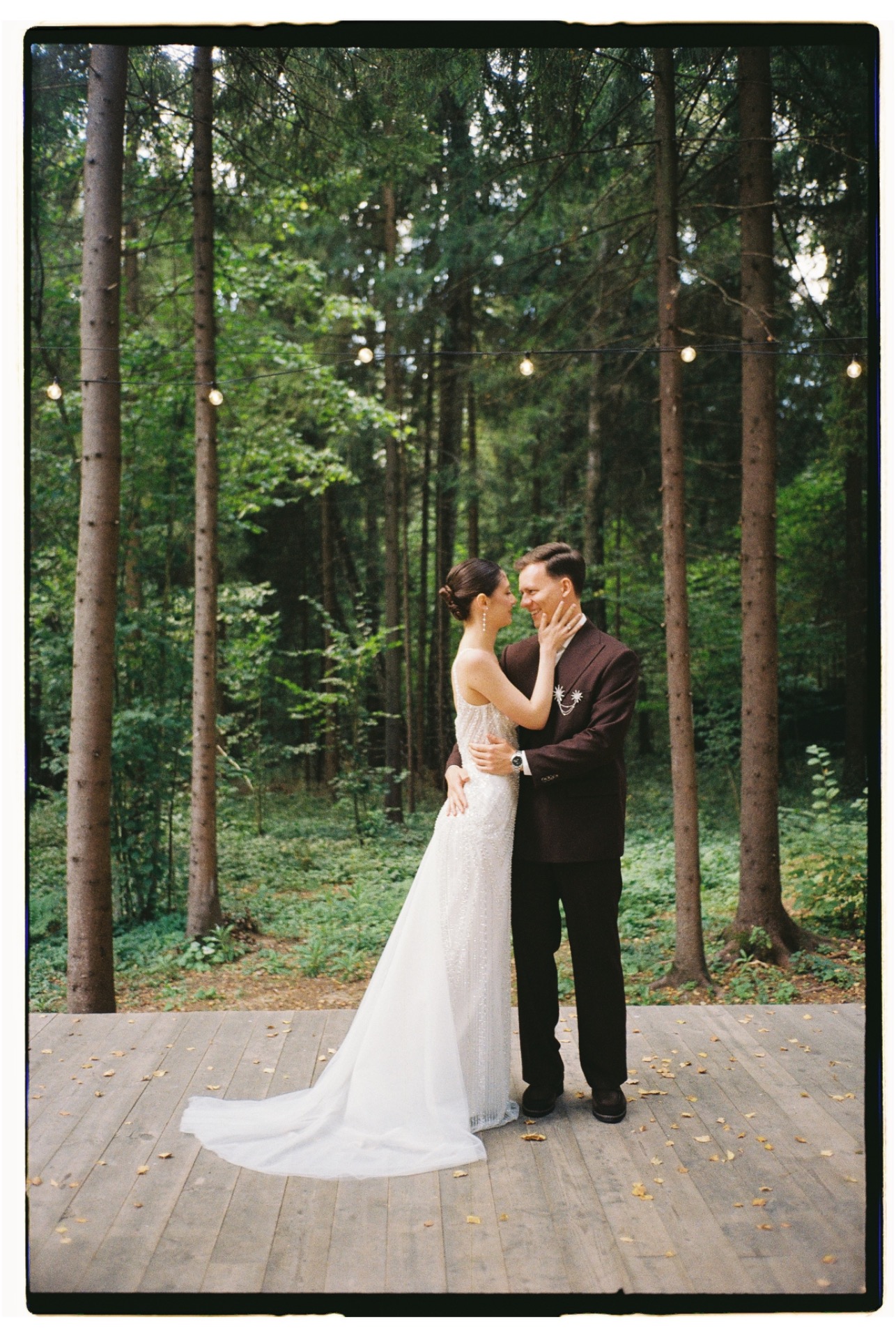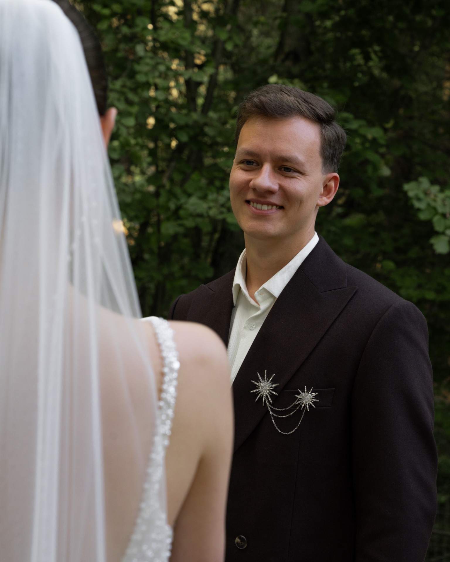Для Андрея мы выбрали костюм тёмно-шоколадного цвета, который идеально подходил к оттенку его кожи и концепции нашей свадьбы. Мы доработали образ лоферами того же оттенка из замши и брошью на лацкане, которая заменила традиционную бутоньерку. Рубашек у Андрея было две, подходившие к моему первому платью и второму. Оттенки платьев были разные, а нам было важно выдержать стиль во всём. Поэтому на свадьбе переодевалась не только я, но и он.