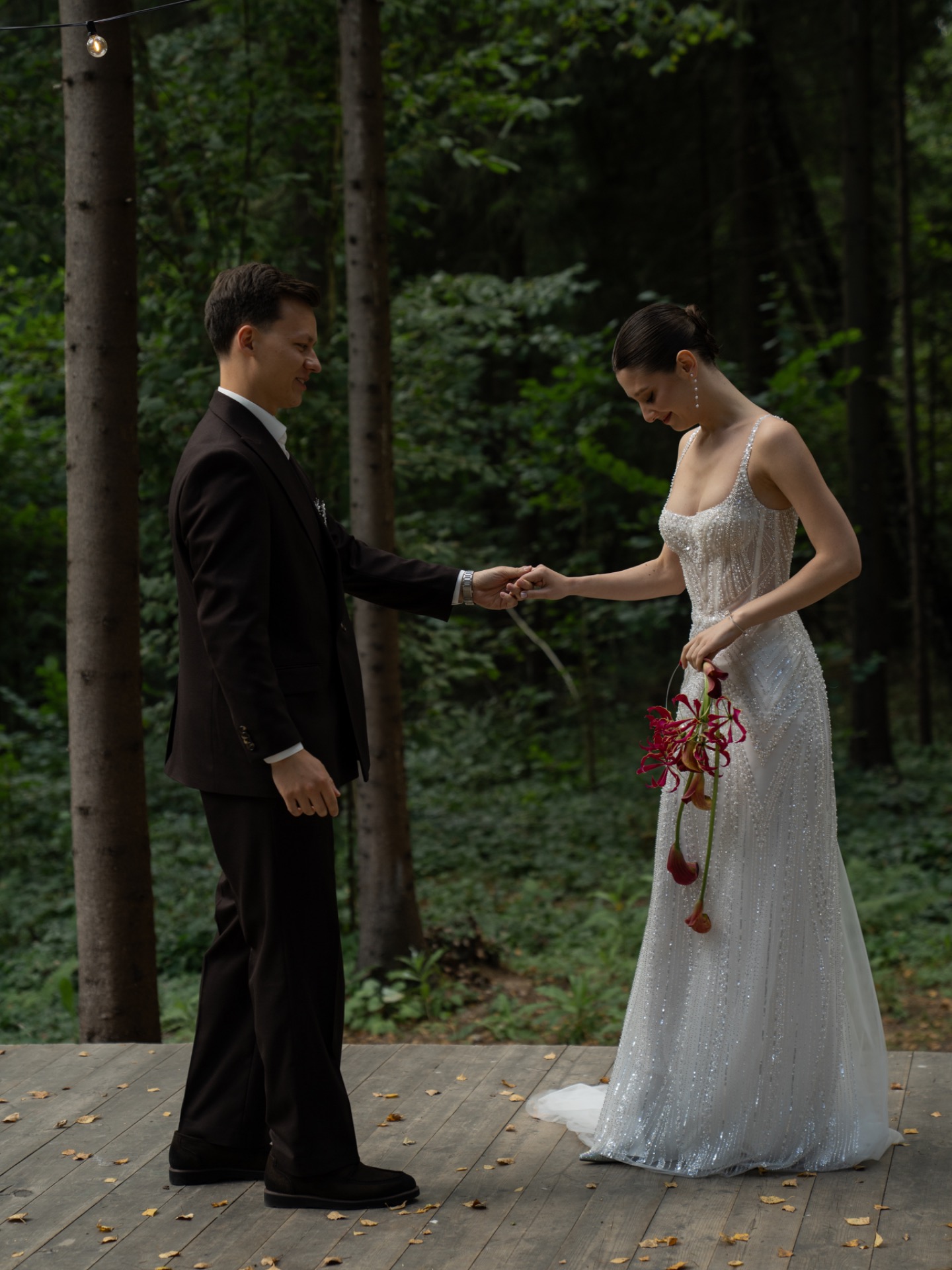 Особенно запомнились нам первая встреча в образах, волнительный выход на церемонию и искренние клятвы друг для друга. Трепета добавлял факт того, что при всём этом присутствовали наши самые родные люди, которые искренне радовались за наш союз.