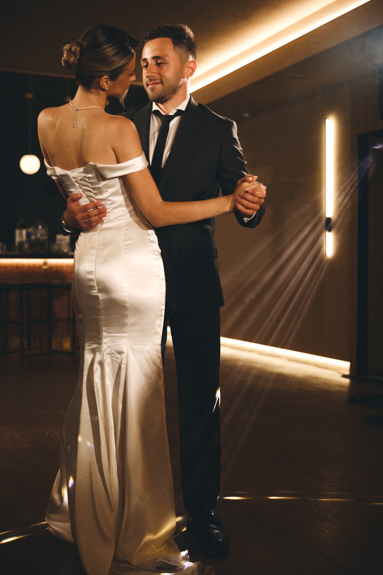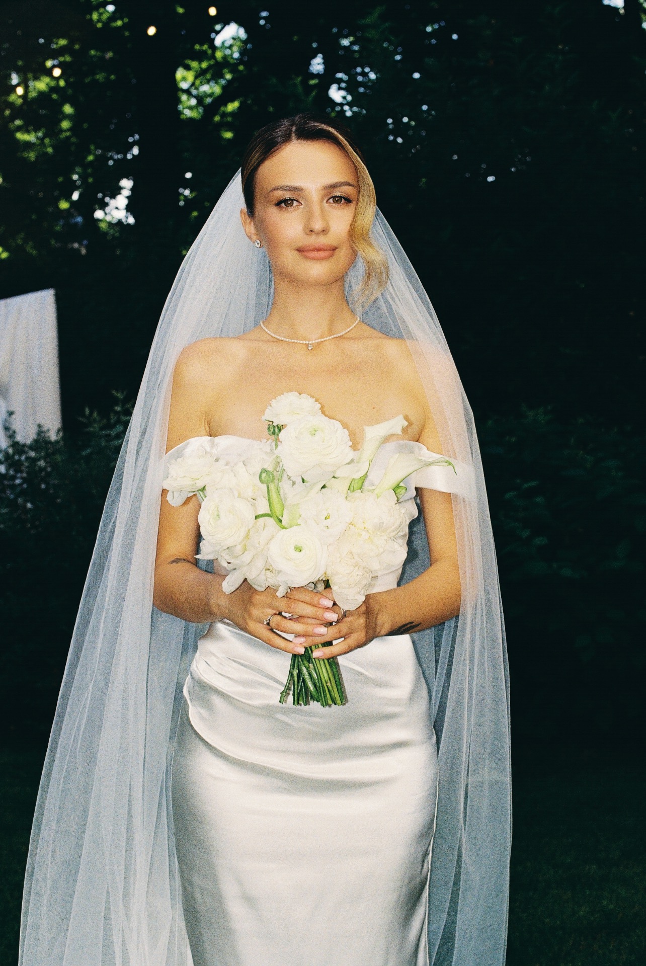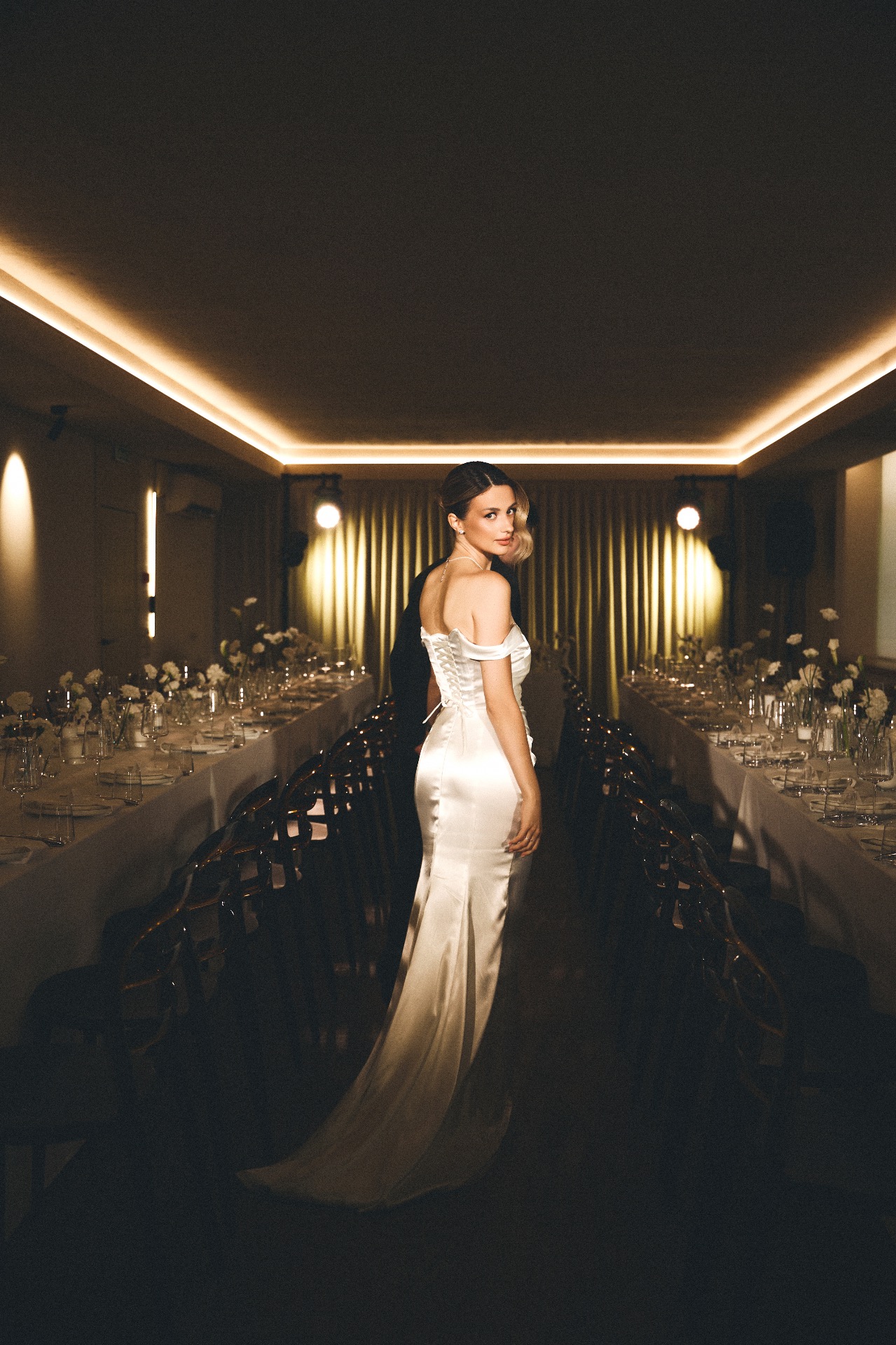 Первое платье — длинное, сшитое на заказ. Я изначально знала, что не хочу пышную юбку и классический фасон. Мне хотелось, чтобы мой наряд был элегантным и утончённым, и чтобы он хорошо вписывался в нашу концепцию.