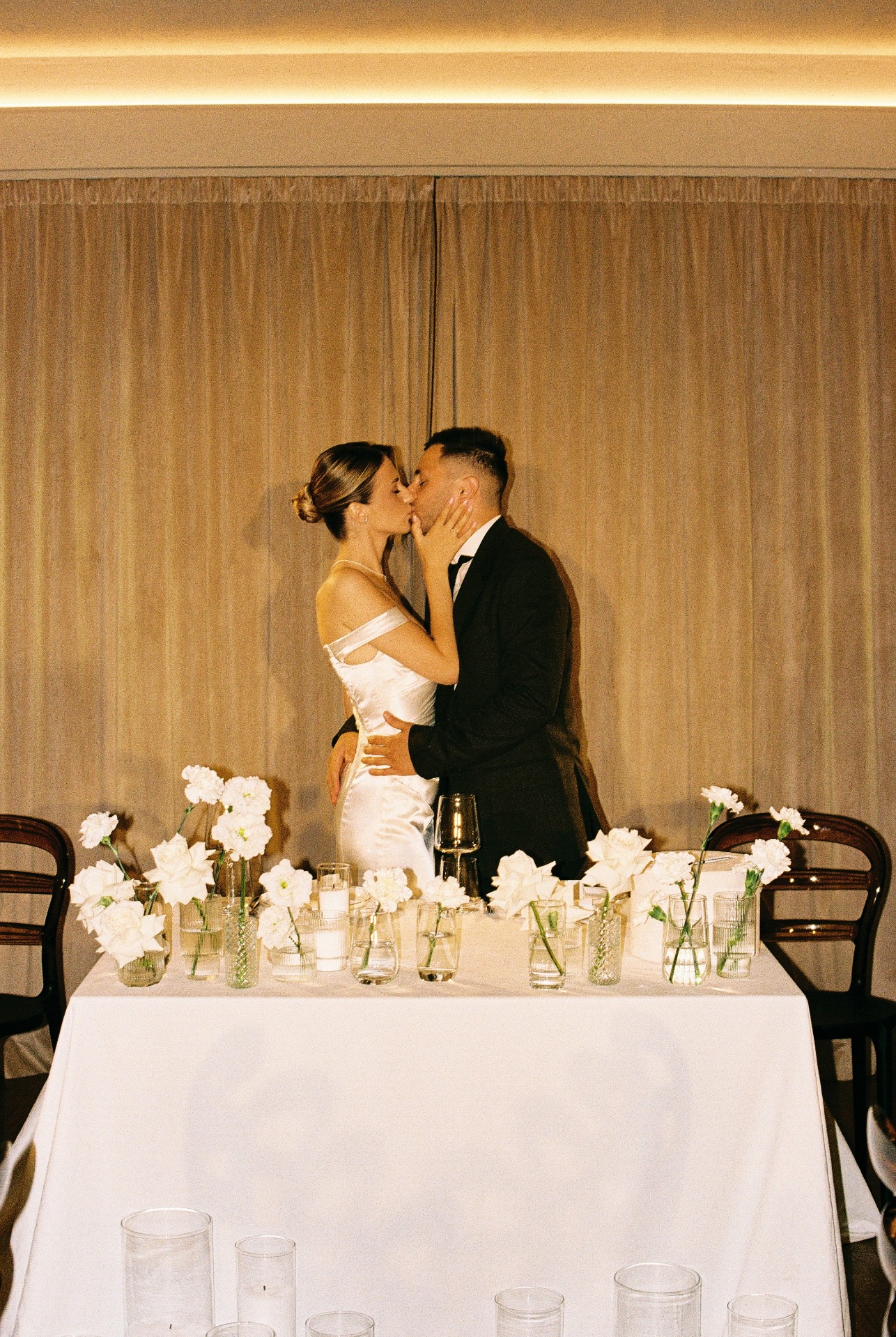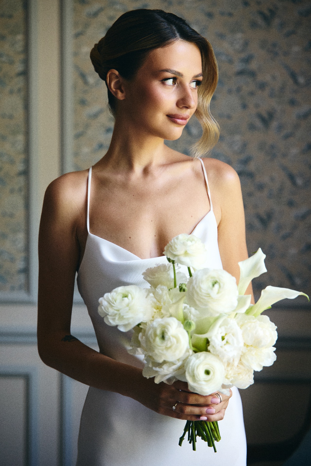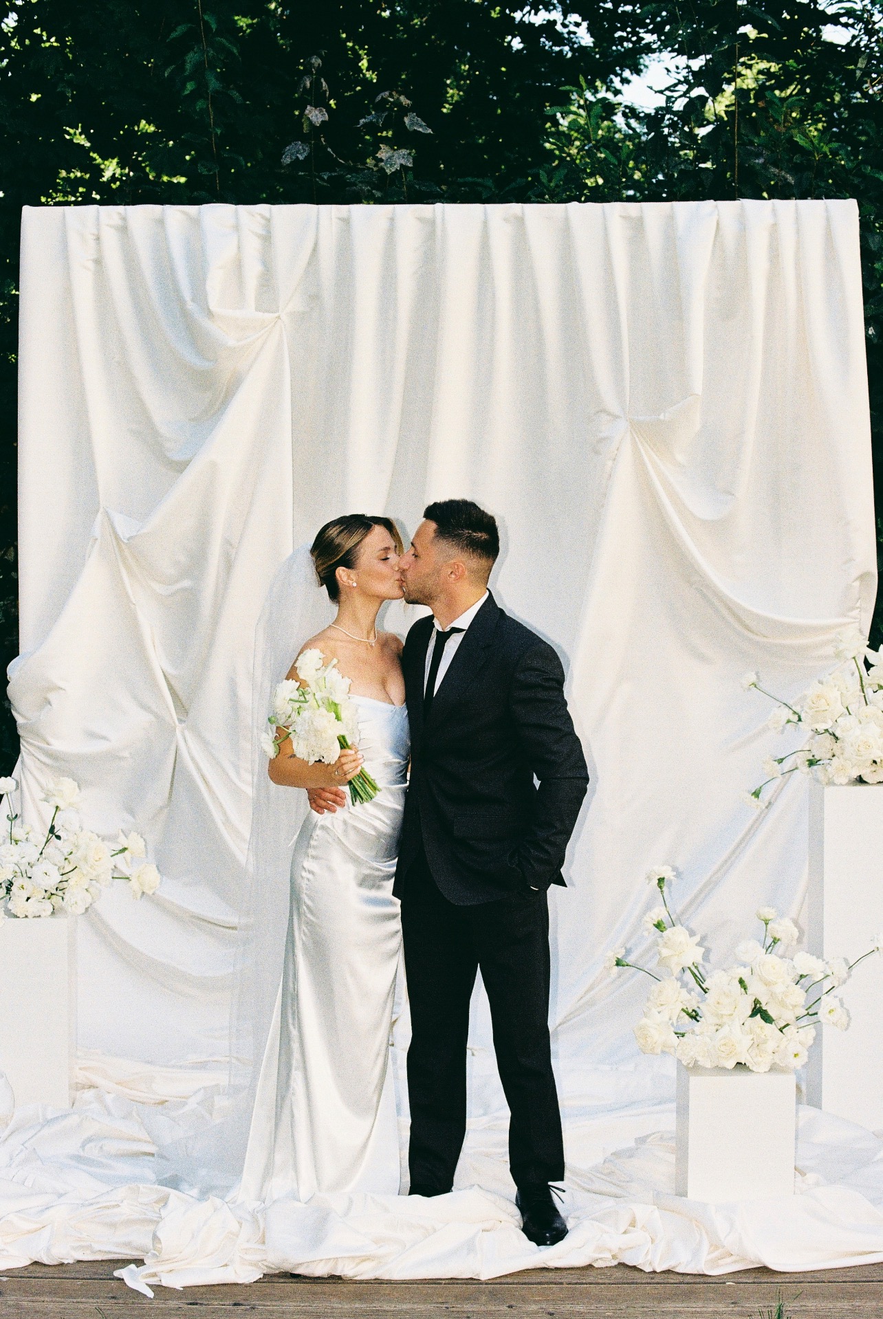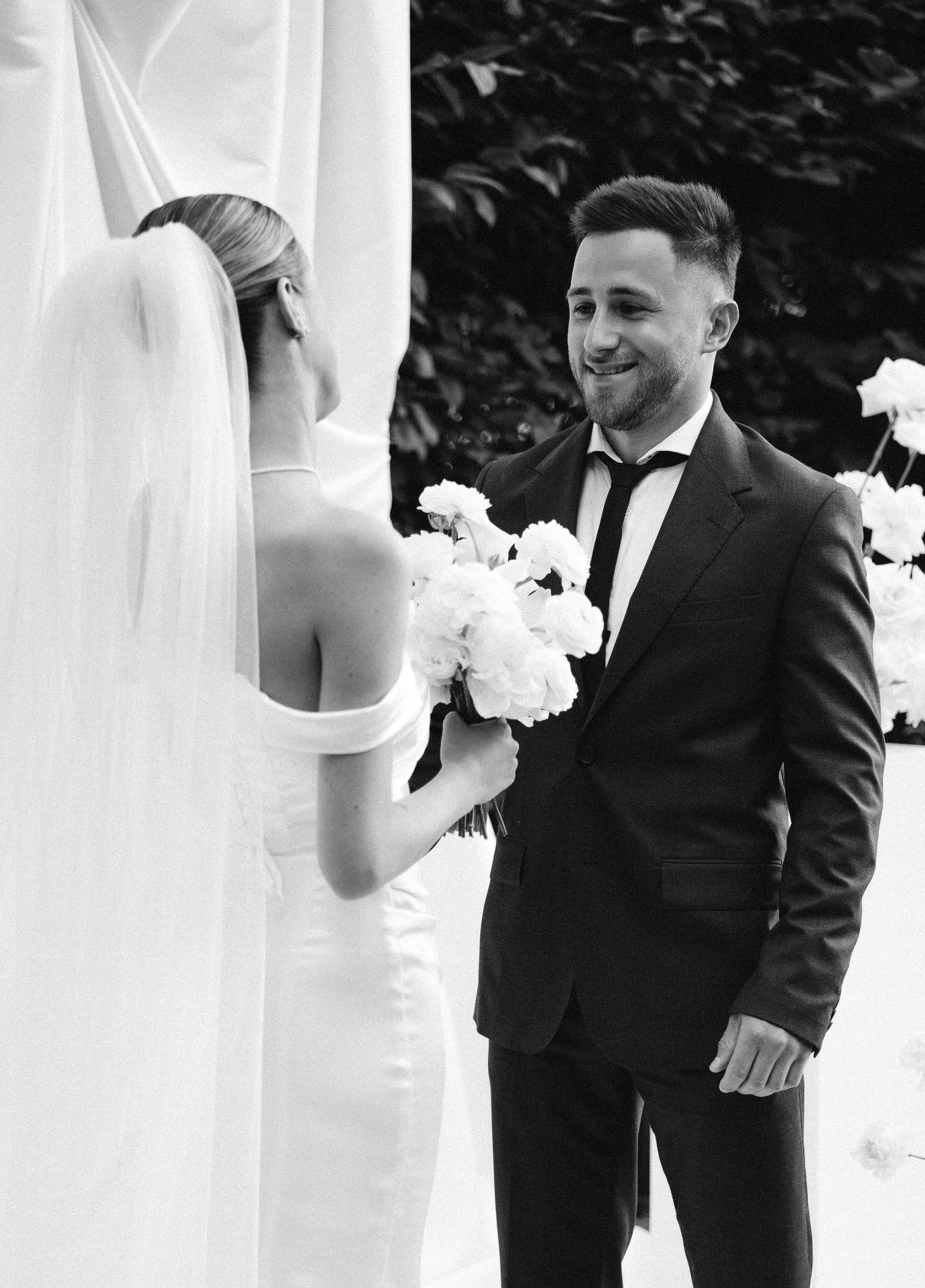 Первое платье — длинное, сшитое на заказ. Я изначально знала, что не хочу пышную юбку и классический фасон. Мне хотелось, чтобы мой наряд был элегантным и утончённым, и чтобы он хорошо вписывался в нашу концепцию.