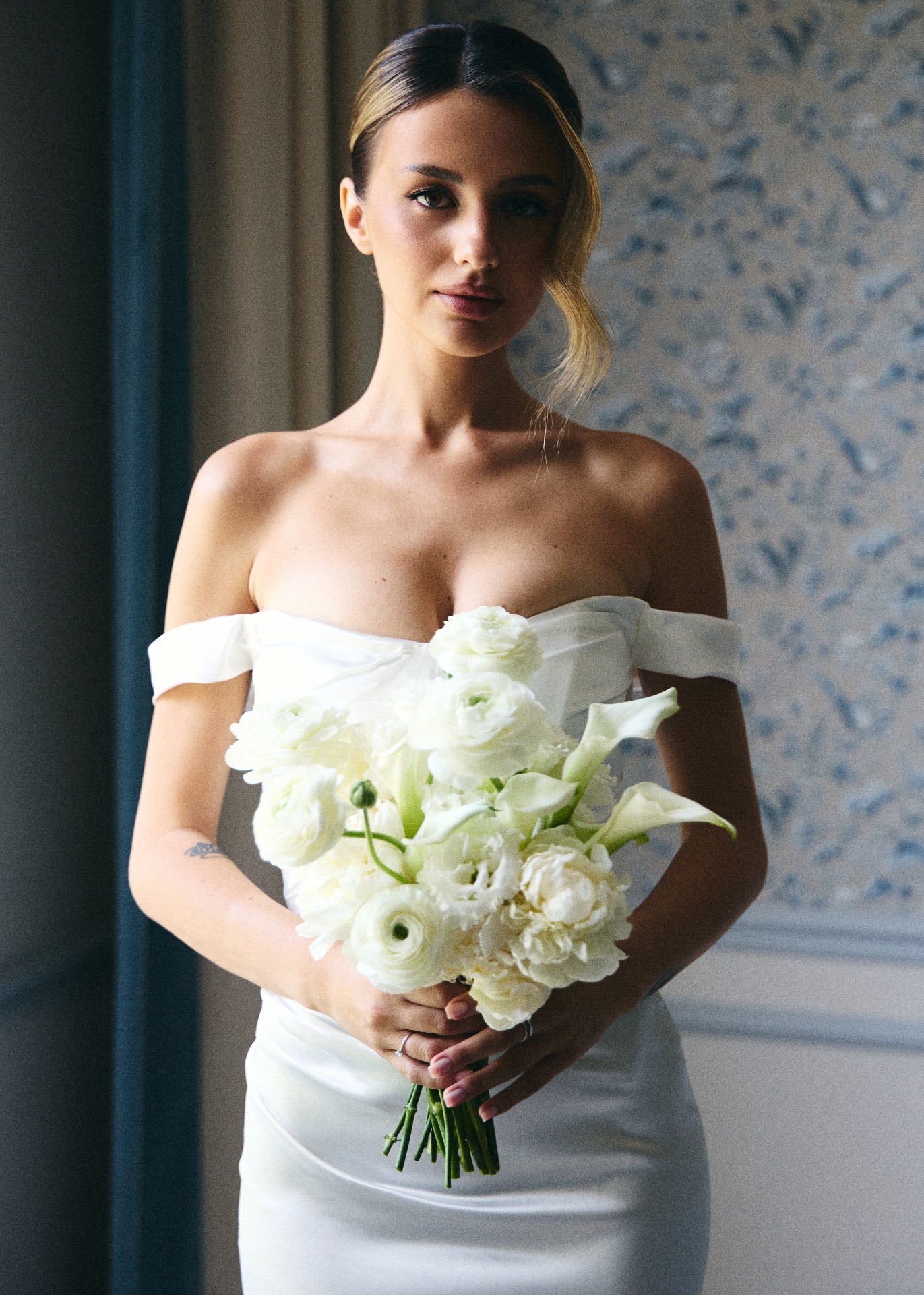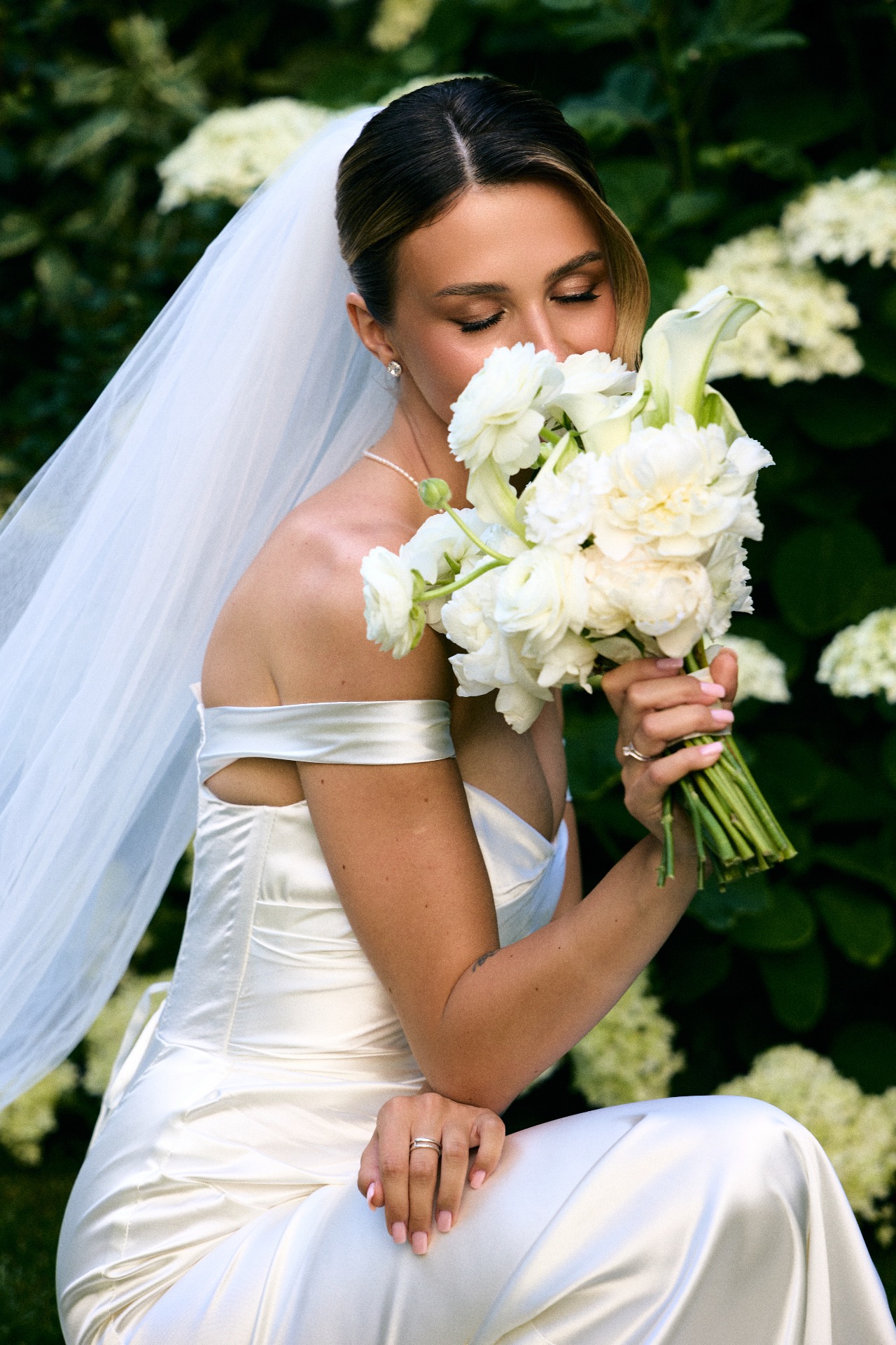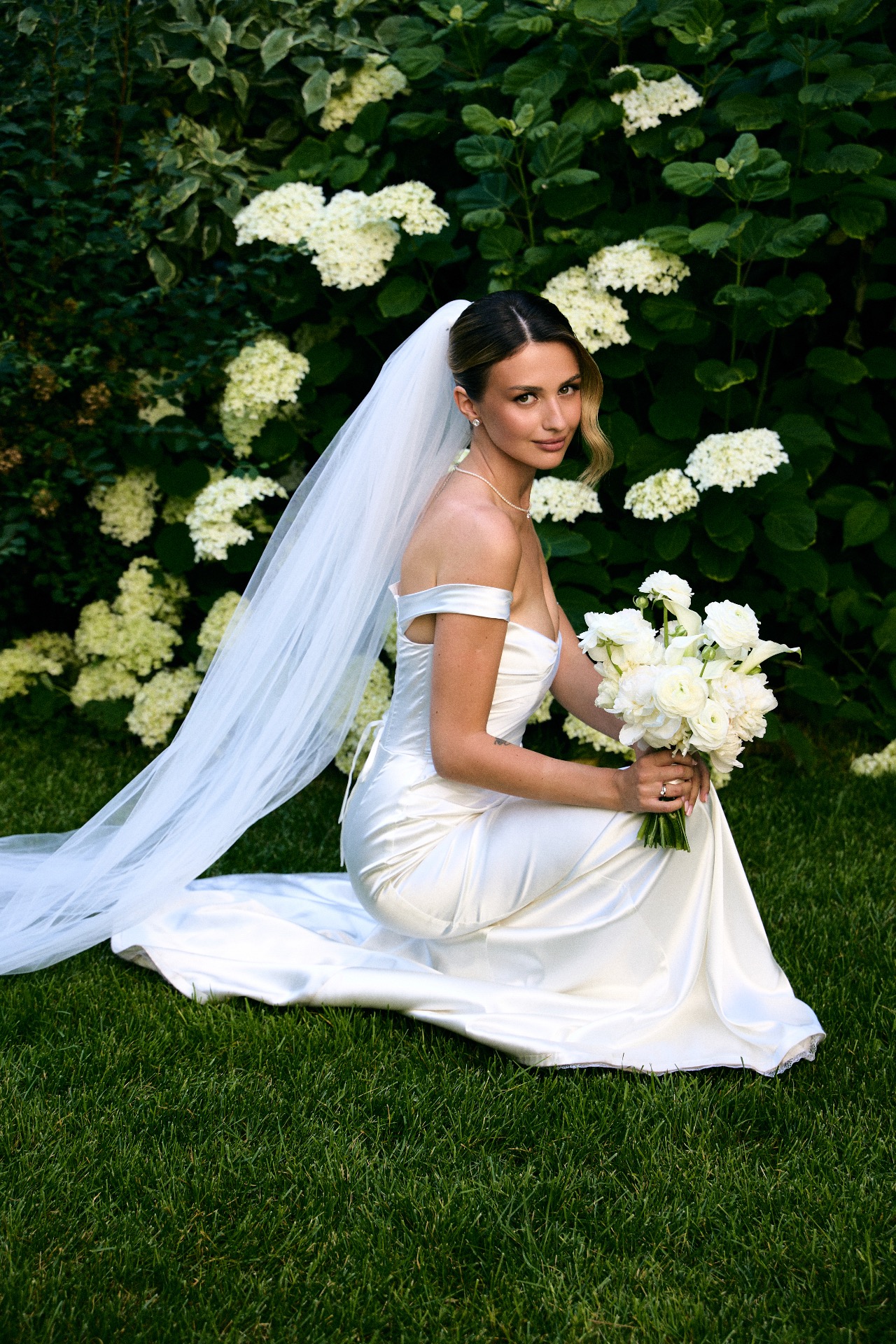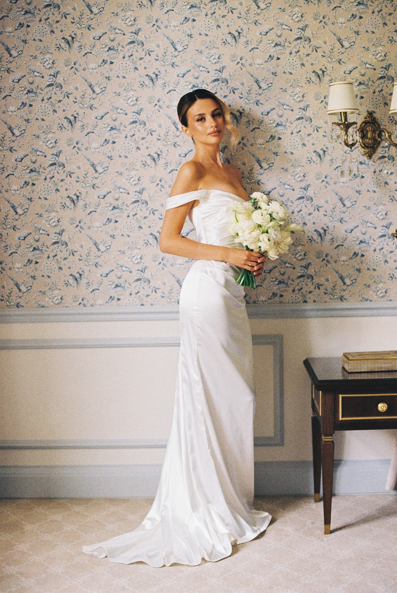 В конечном итоге я остановилась на силуэте «рыбка» с лёгким шлейфом и спущенными бретелями.