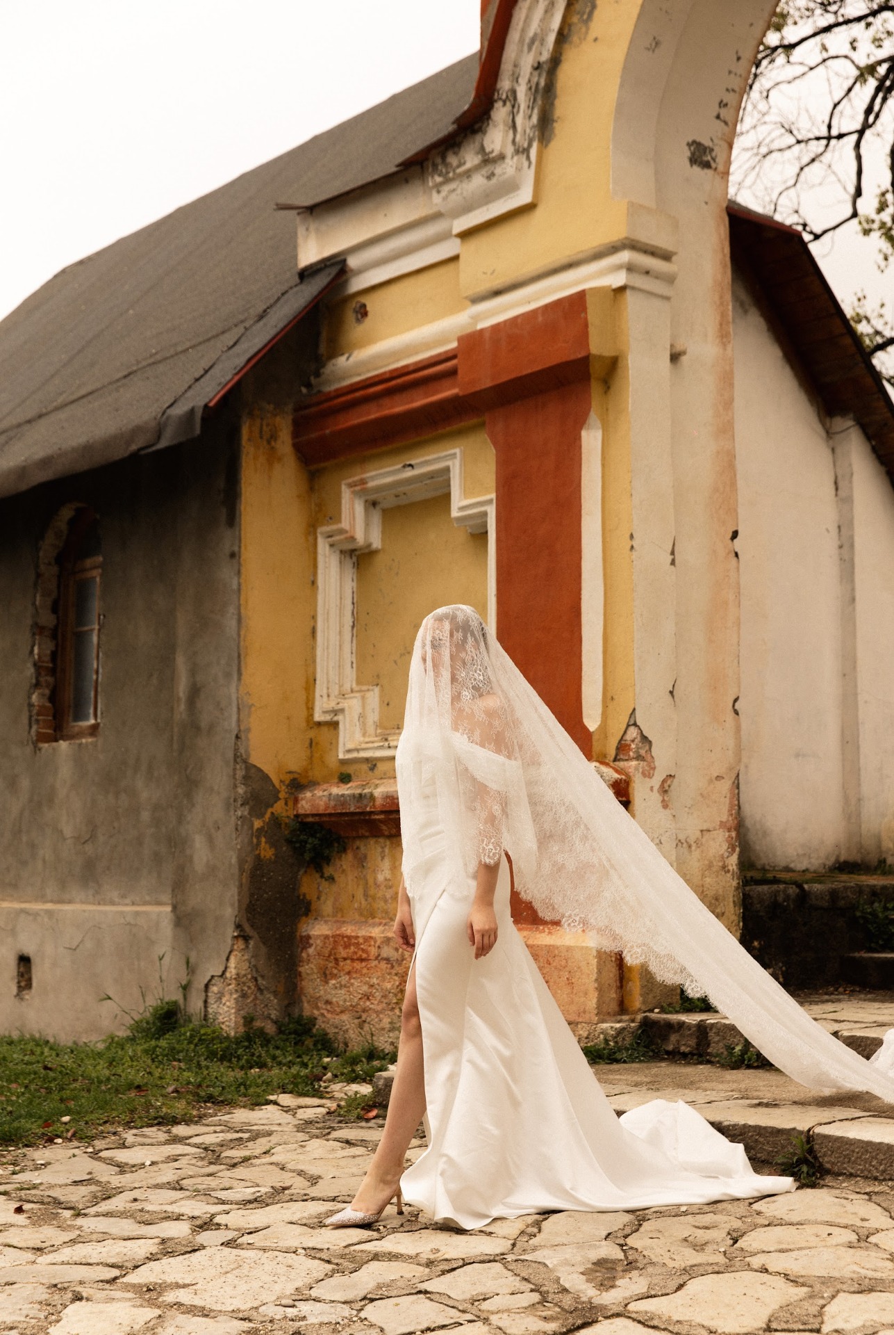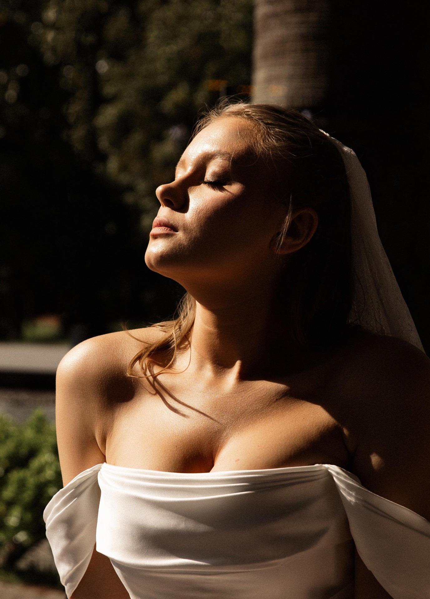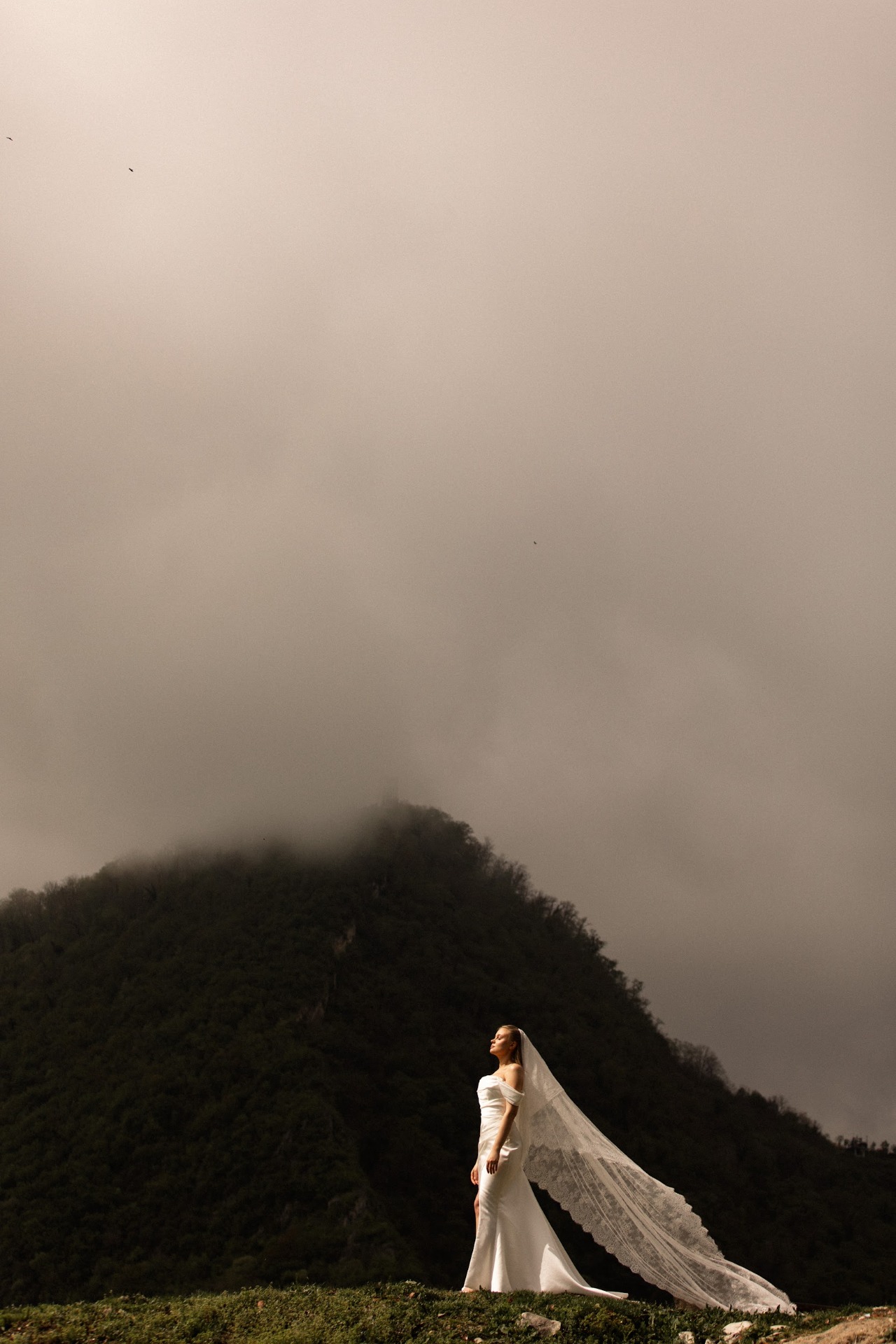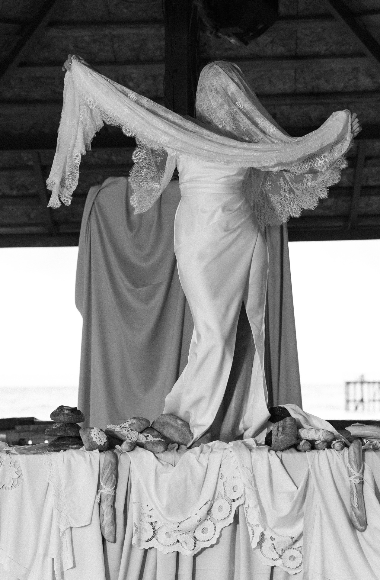 Я хотела платье в пол, которое подчеркнуло бы мою талию, но не смотрелось бы громоздко на нашей свадьбе у моря. В итоге я остановила свой выбор на элегантном платье с открытыми плечами, а мой образ идеально дополнила кружевная фата.
