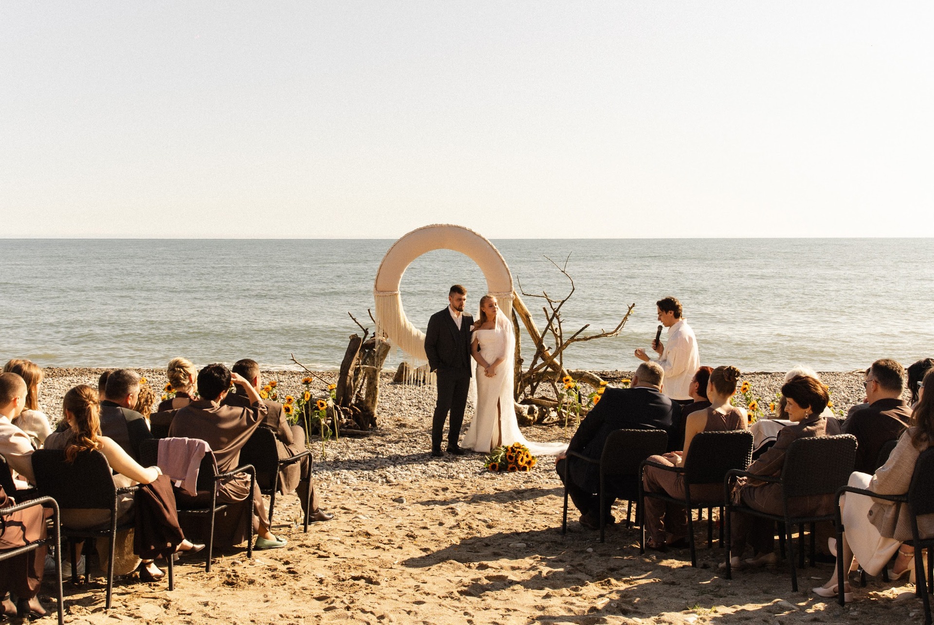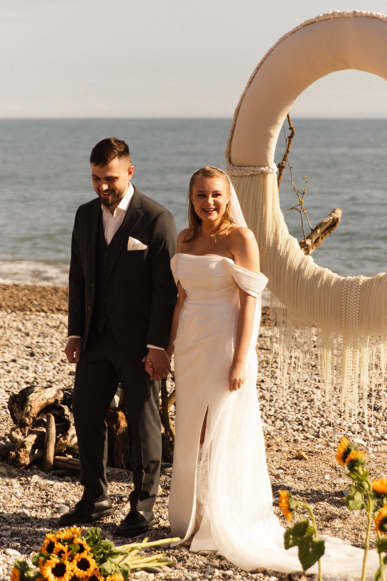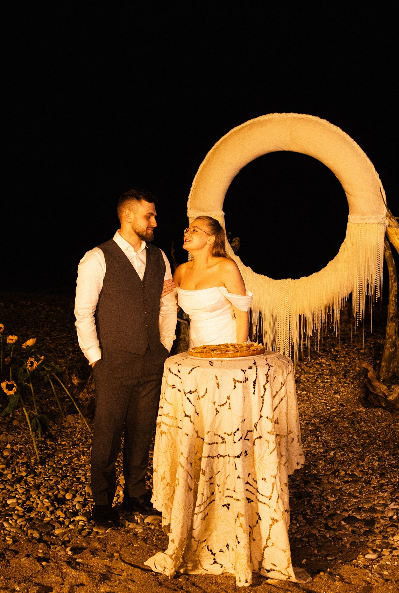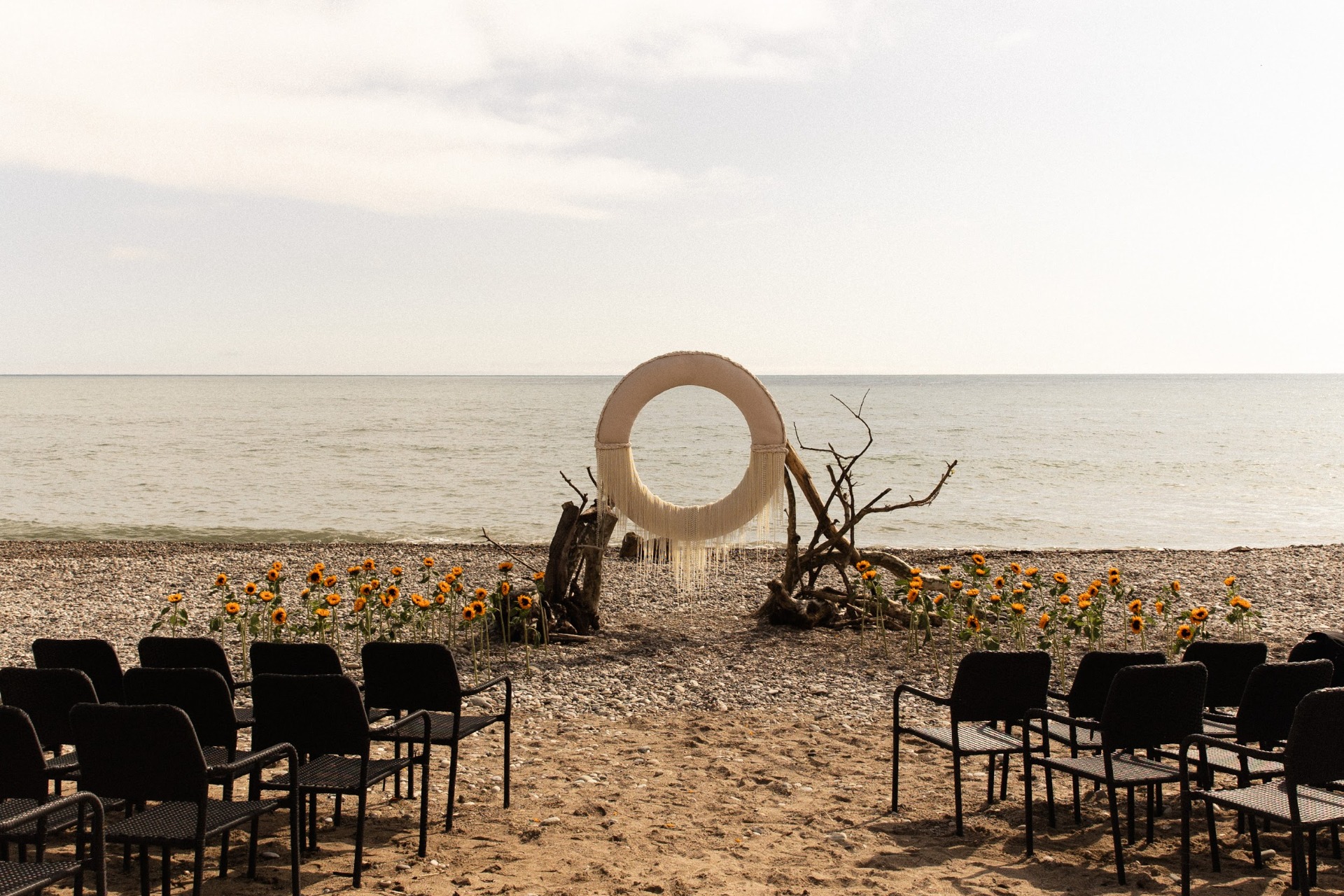 В зоне церемонии мы решили поставить солнечный круг, увешанный жемчугом, кружевом и косами. Особенной деталью нашего дня стали подсолнухи: ими был усыпан пляж в зоне церемонии. А чтобы поддержать концепцию свадьбы, я собрала из них свой букет невесты.