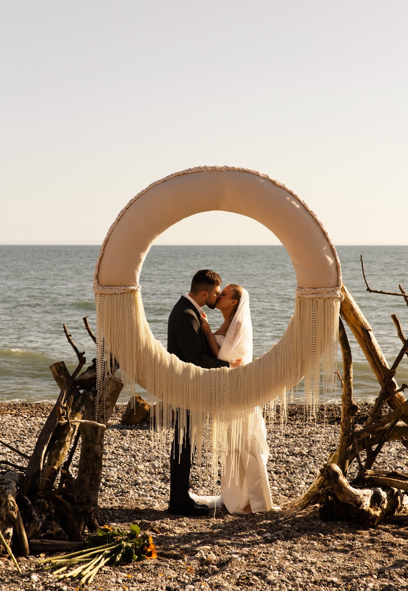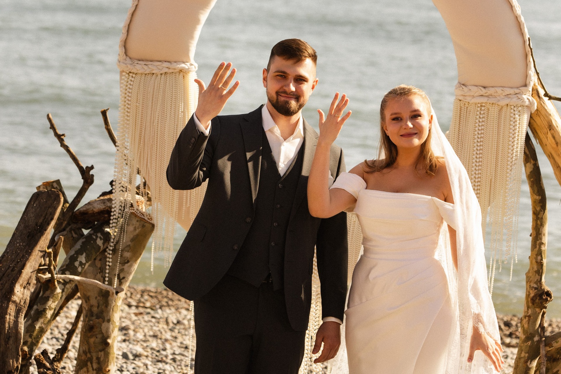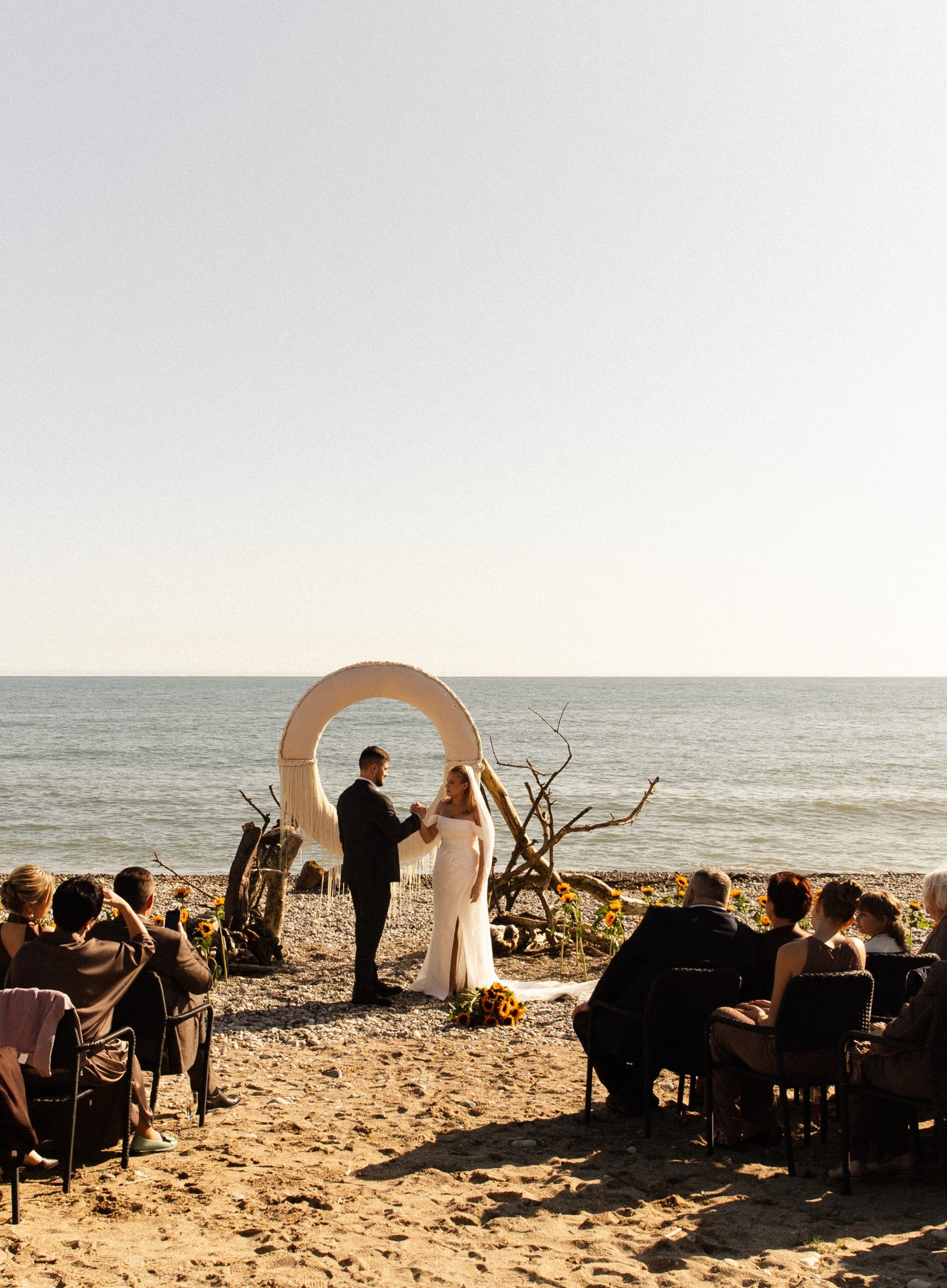 В зоне церемонии мы решили поставить солнечный круг, увешанный жемчугом, кружевом и косами. Особенной деталью нашего дня стали подсолнухи: ими был усыпан пляж в зоне церемонии. А чтобы поддержать концепцию свадьбы, я собрала из них свой букет невесты.