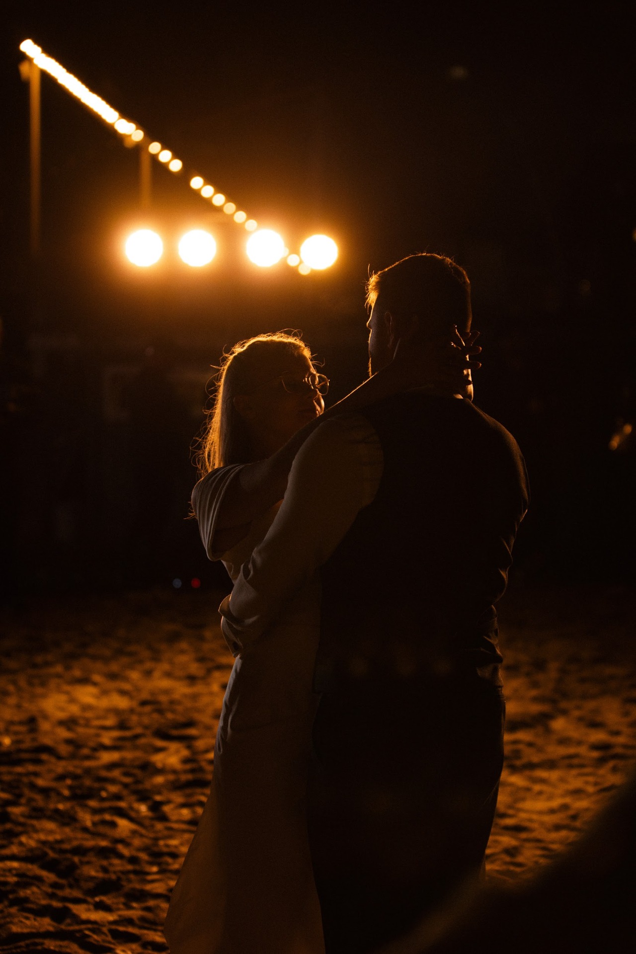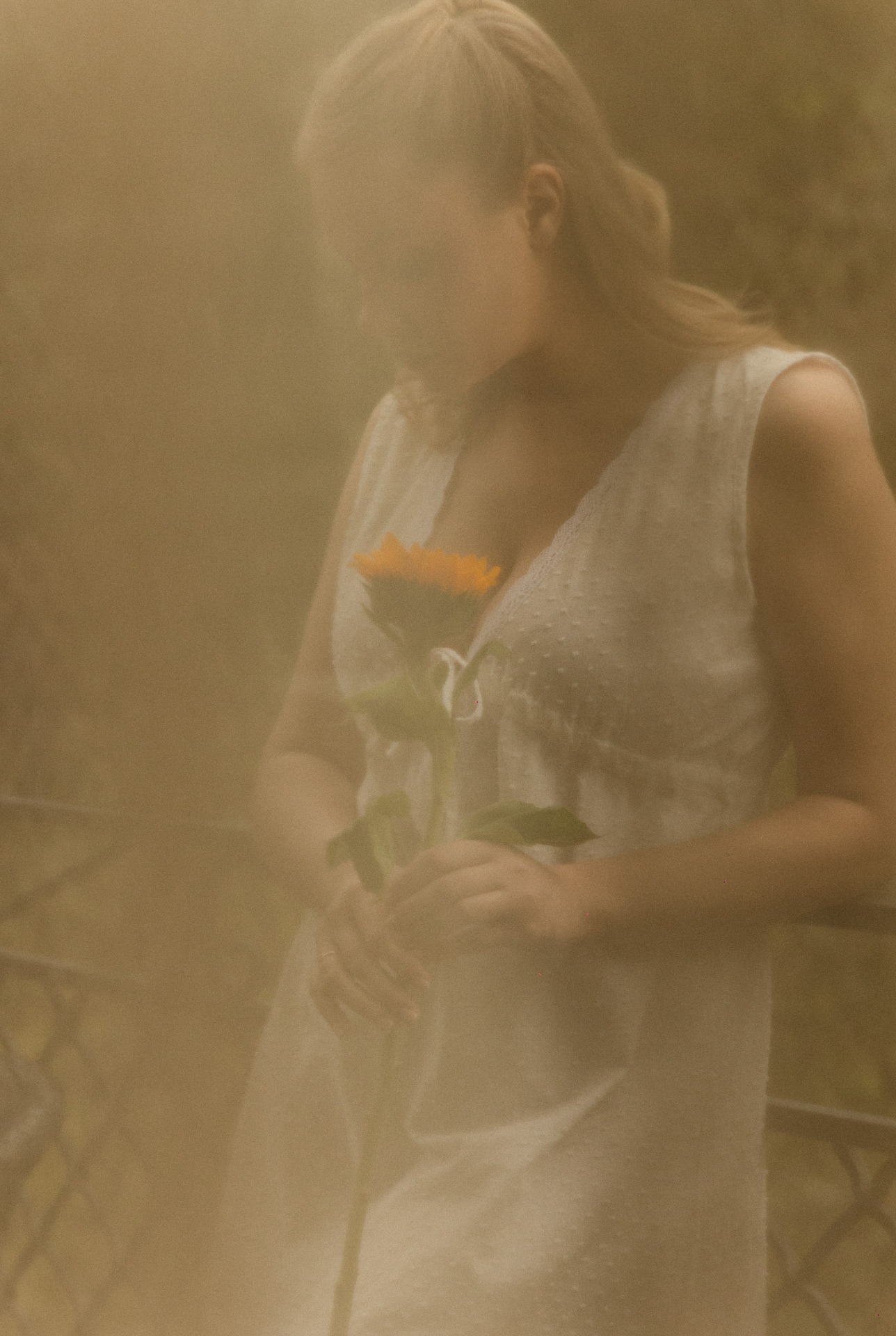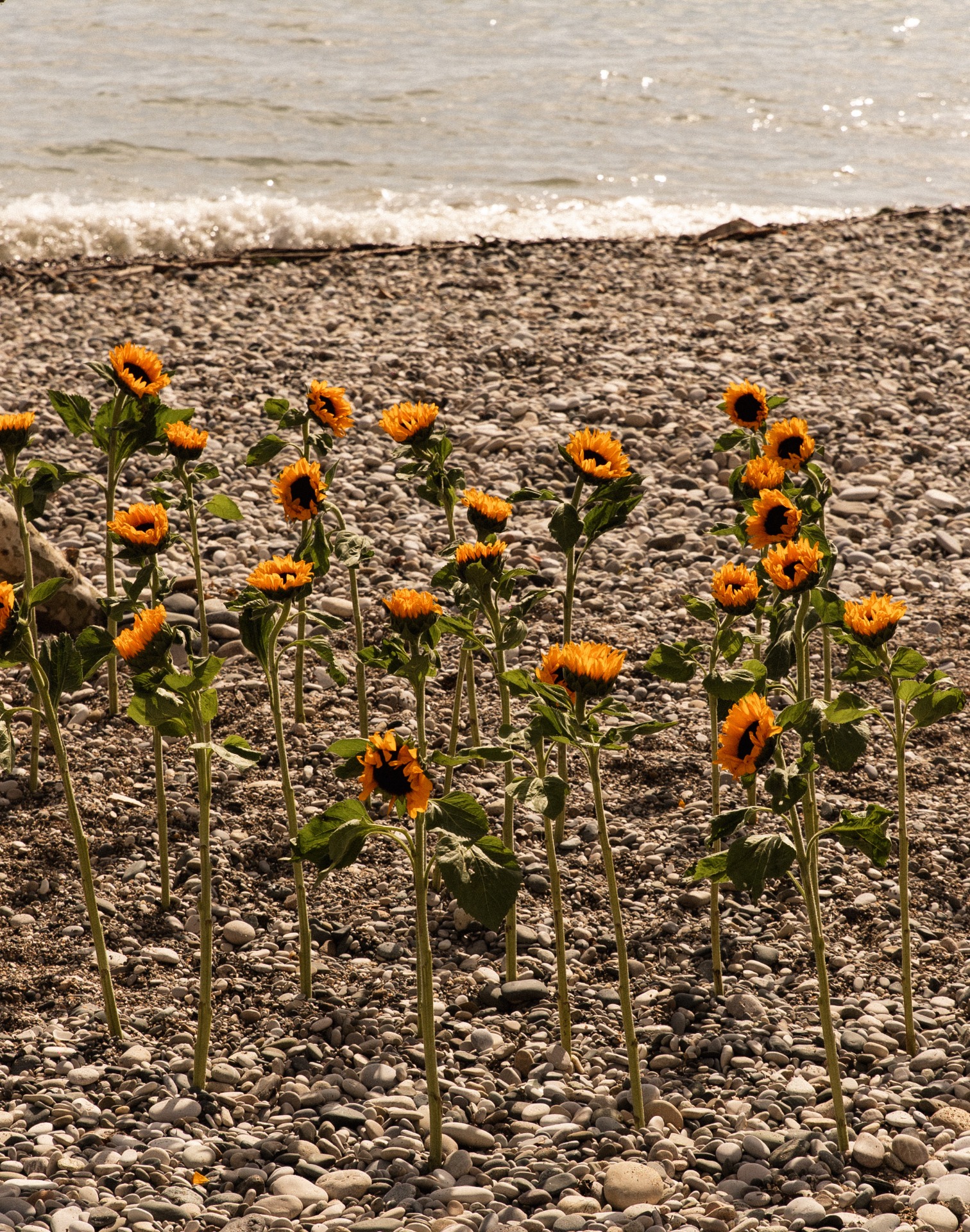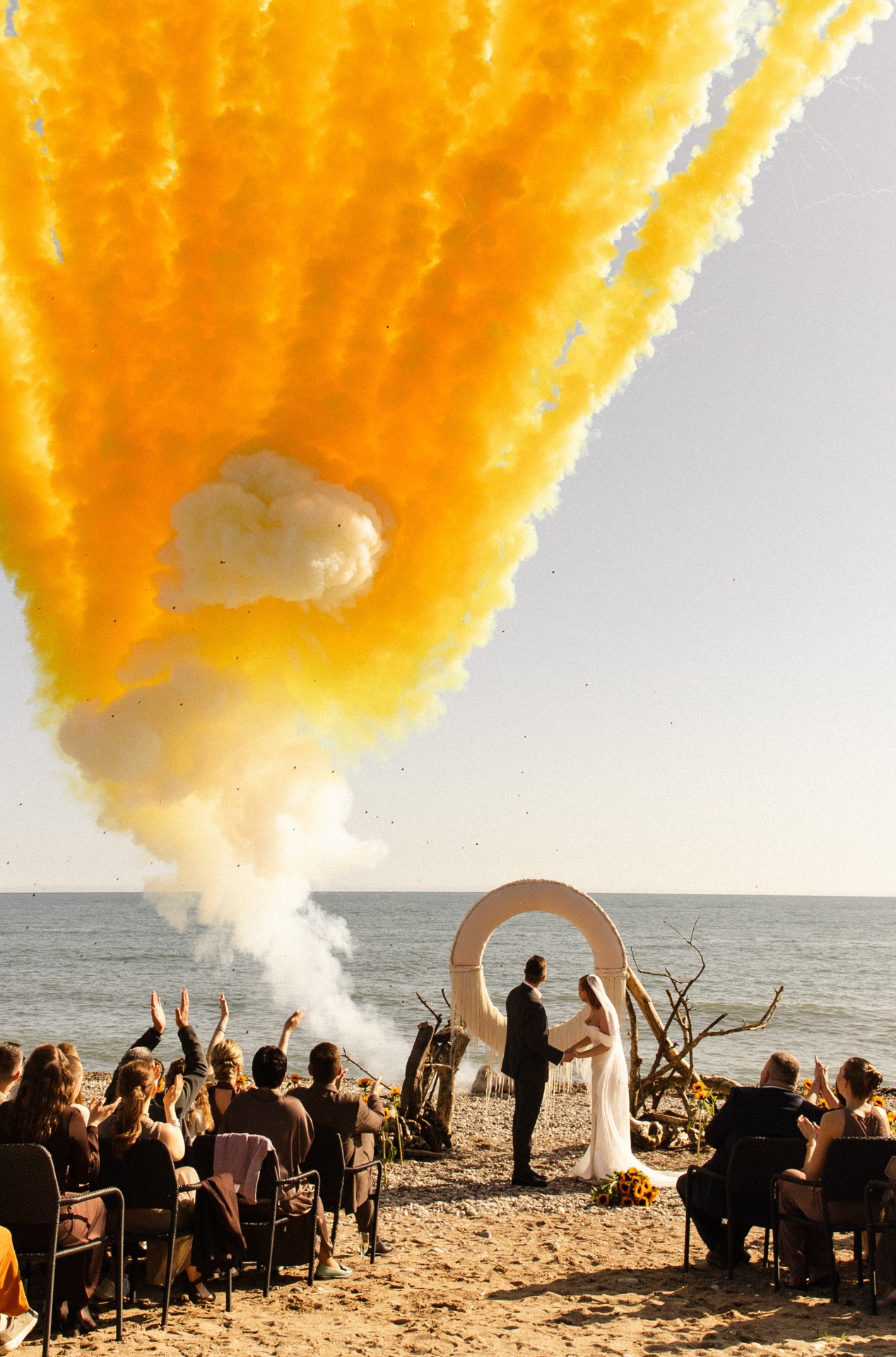 В зоне церемонии мы решили поставить солнечный круг, увешанный жемчугом, кружевом и косами. Особенной деталью нашего дня стали подсолнухи: ими был усыпан пляж в зоне церемонии. А чтобы поддержать концепцию свадьбы, я собрала из них свой букет невесты.