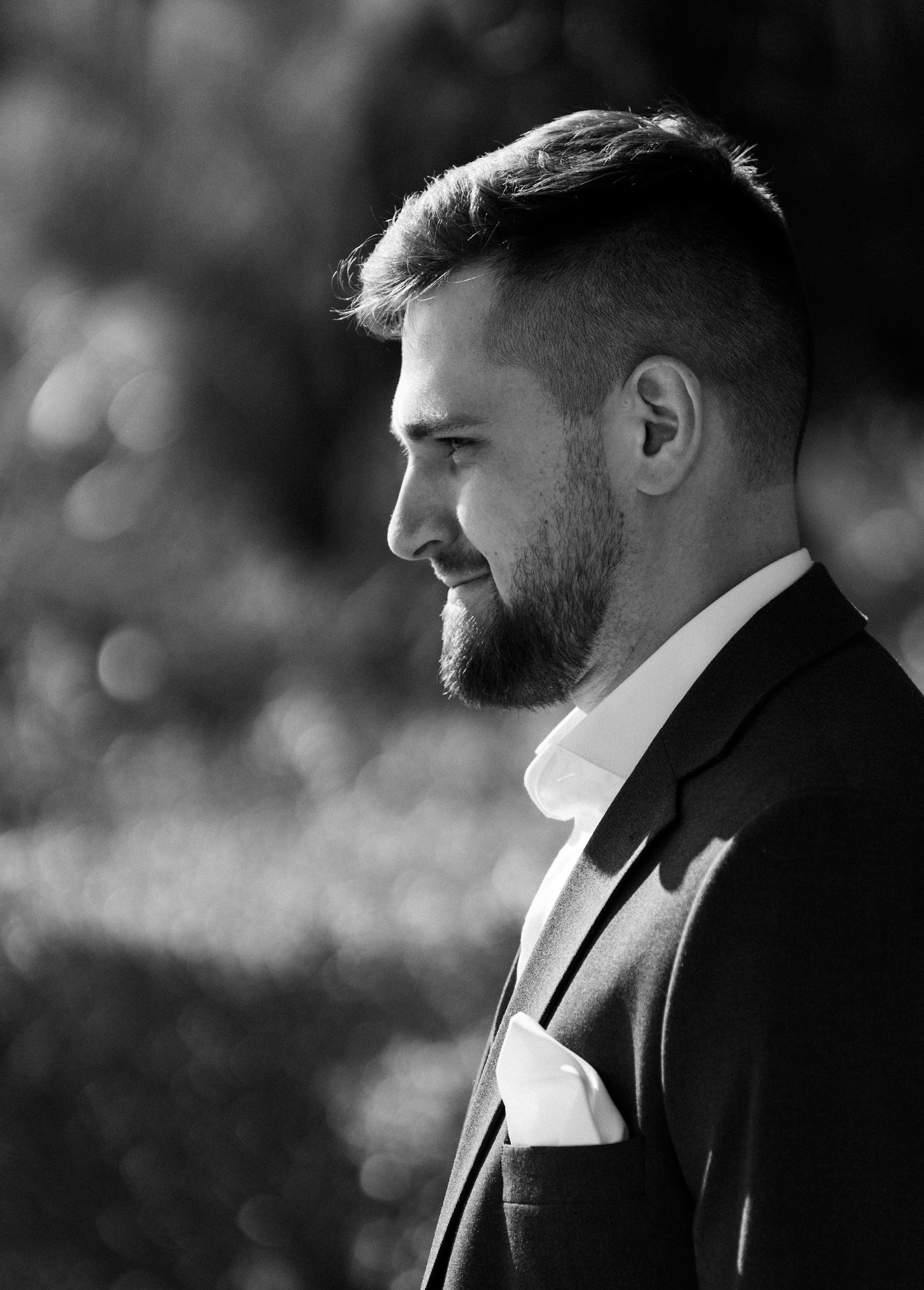 Для образа жениха Рома выбрал костюм-тройку серого цвета. А платок в нагрудном кармане сменился на подсолнух ближе к концу нашего торжества.