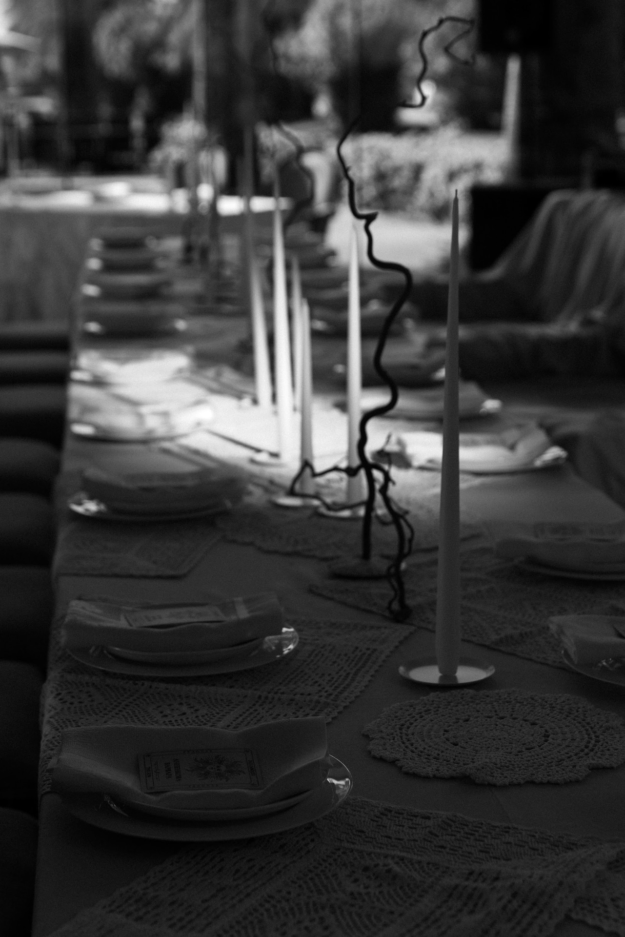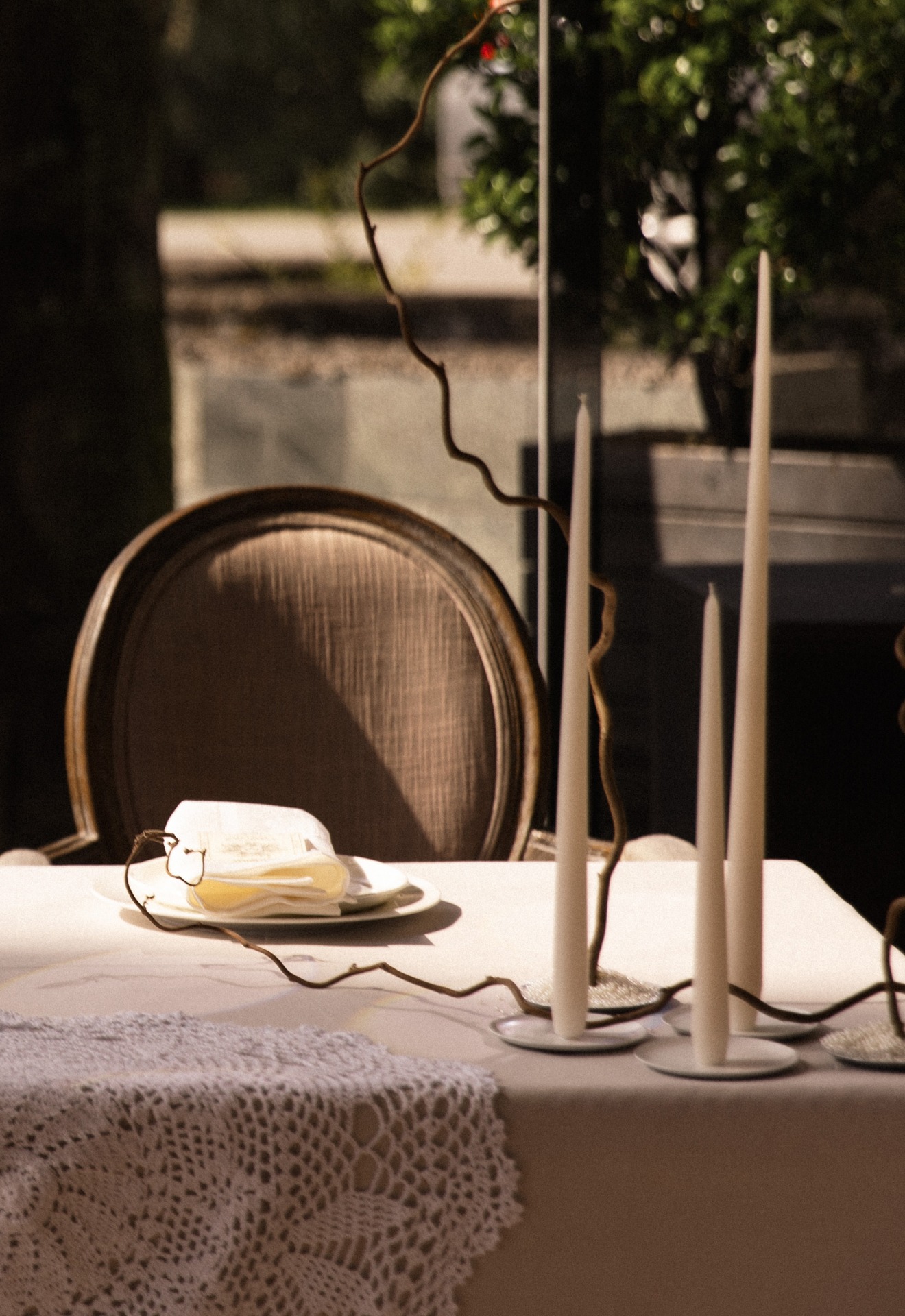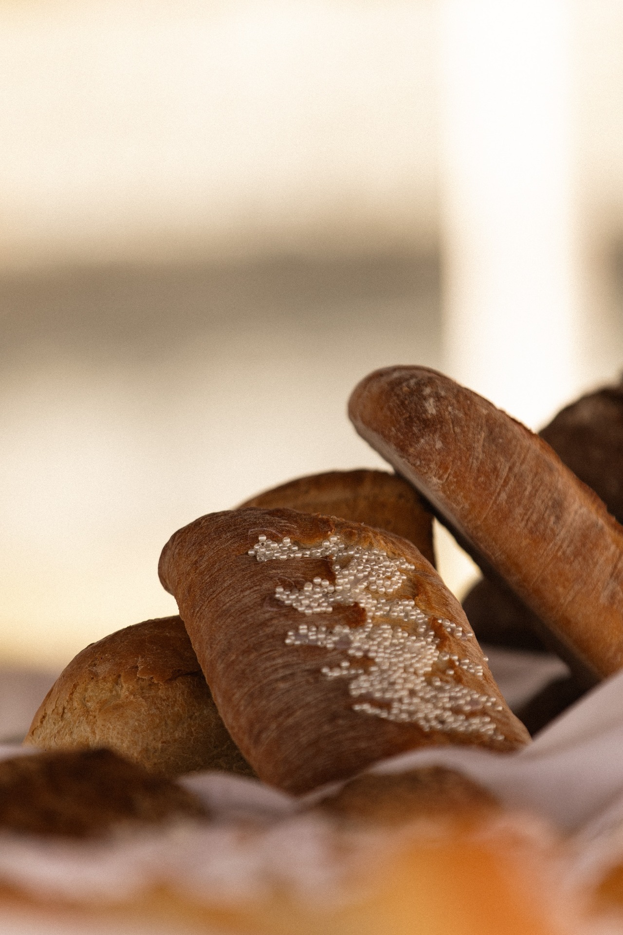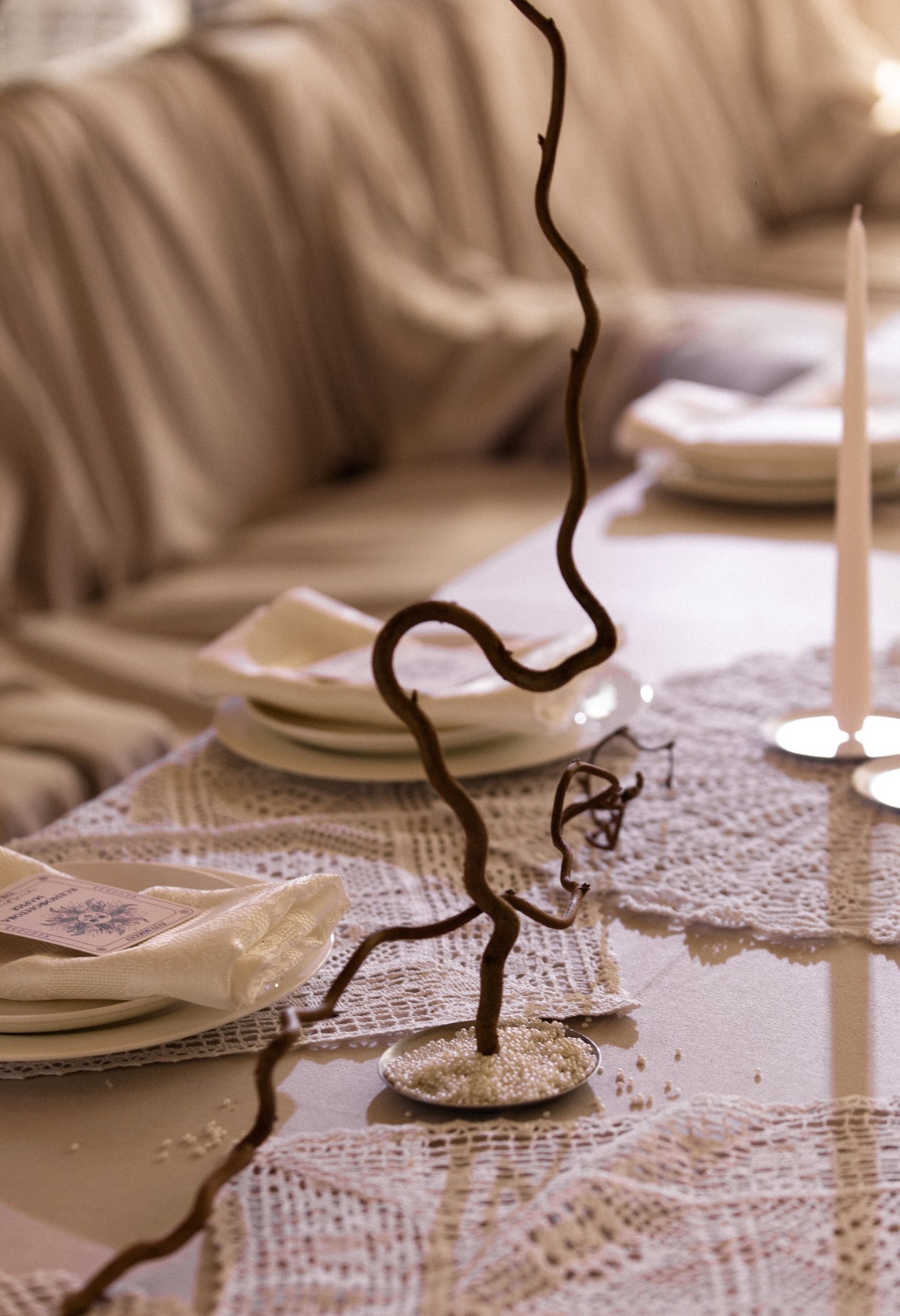 Фотозона была оформлена в хлебной тематике: сет-дизайн из багетов, украшенных жемчугом и кружевом, дополнял каравай в форме солнца. Декор банкетного зал был минималистичным: только свечи, ветки корилуса и льняные скатерти, усыпанные кружевными вставками.