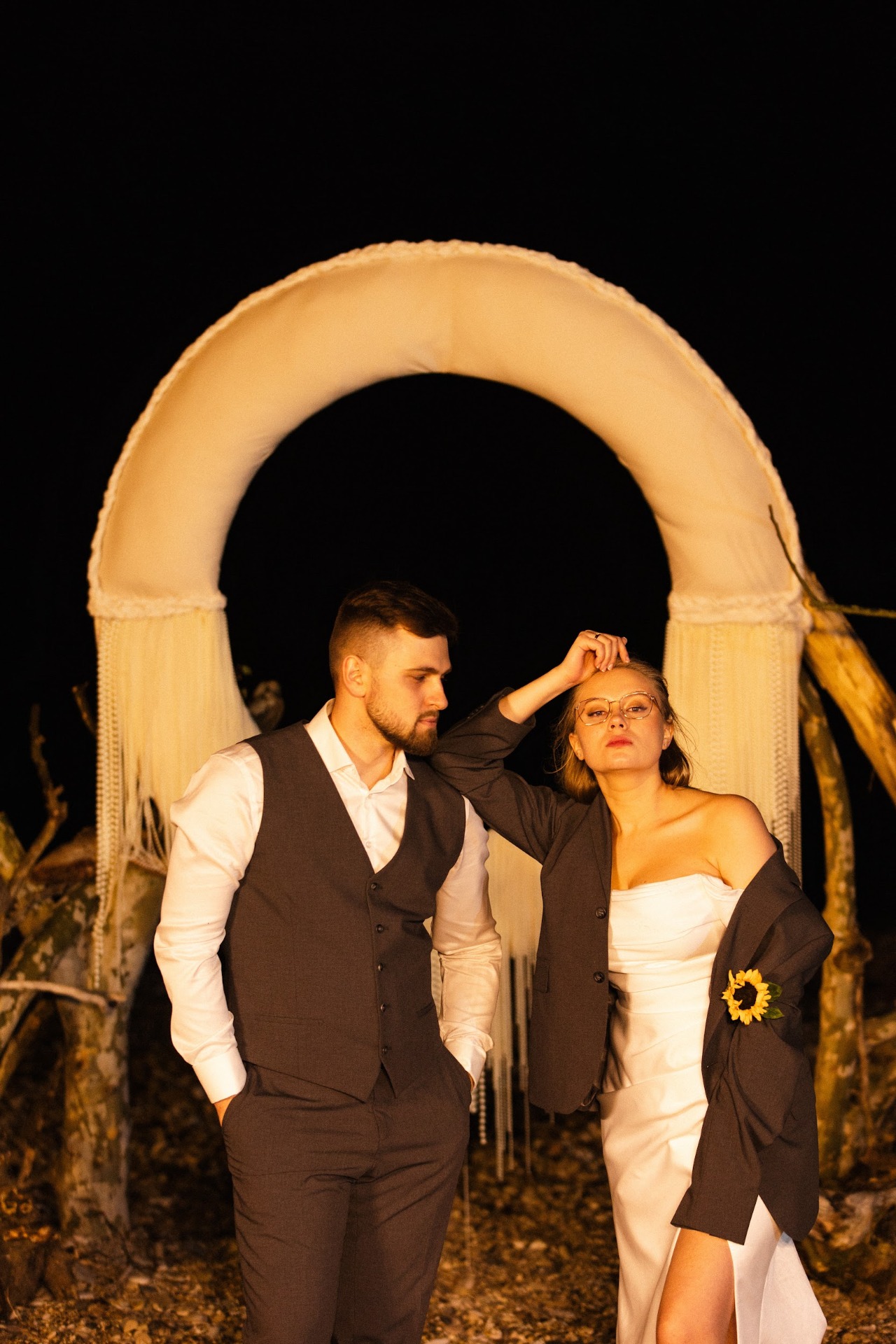 Организаторы сразу предложили выбрать солнце центральной идеей нашего праздника. А морской берег, который присутствовал на нашей локации, подсказал нам использовать в декоре такие детали, как жемчуг, вышивку и плетёные салфетки.