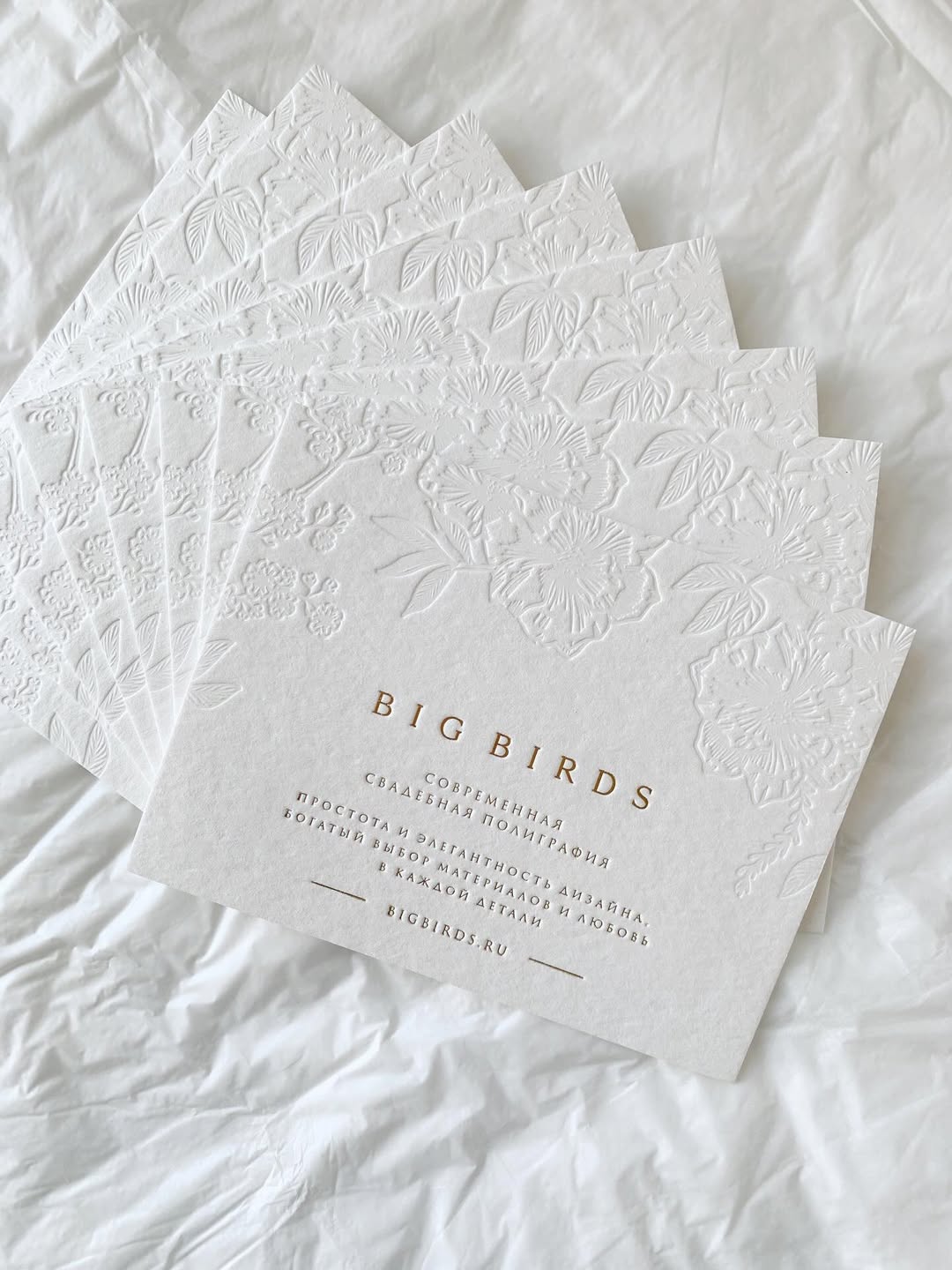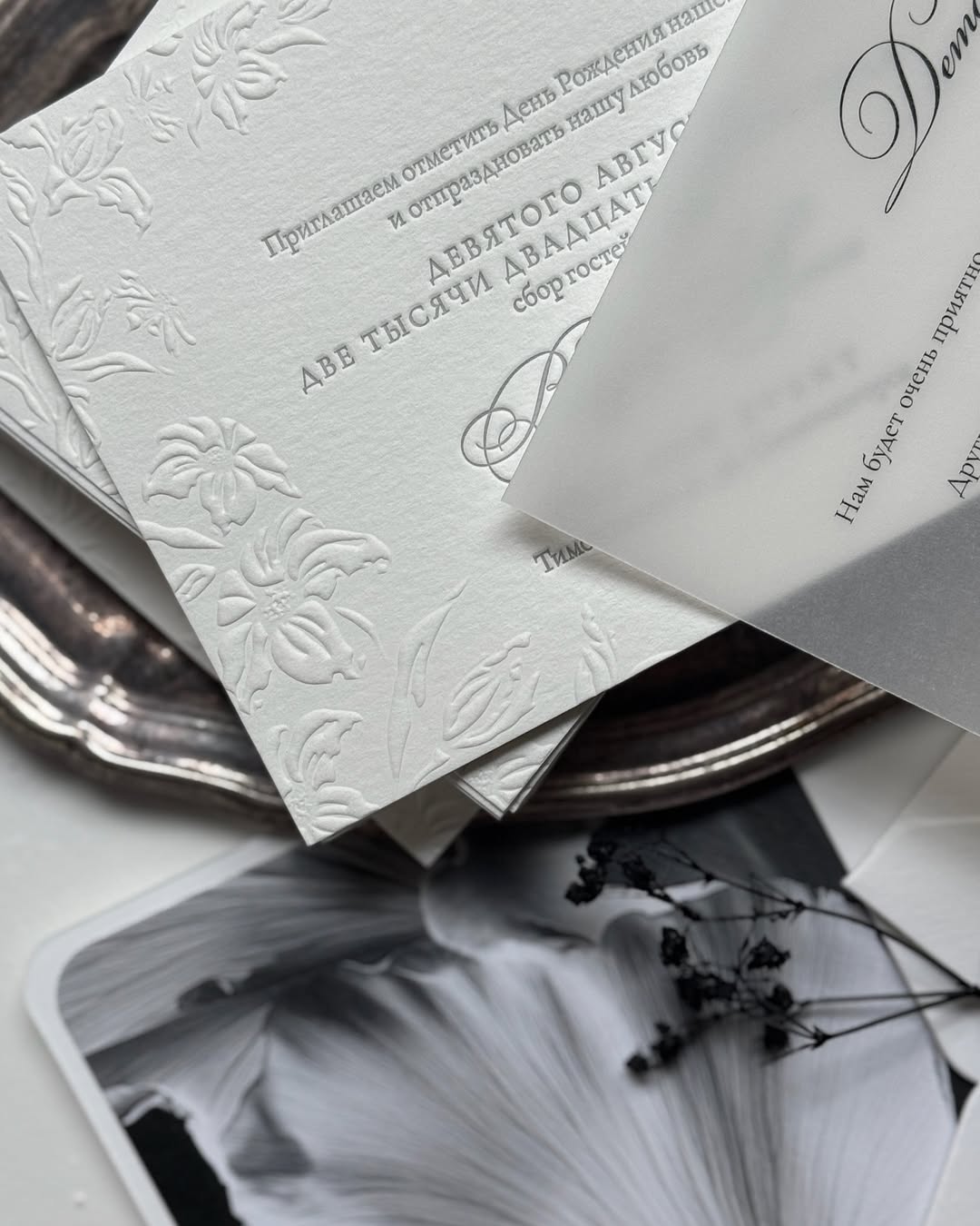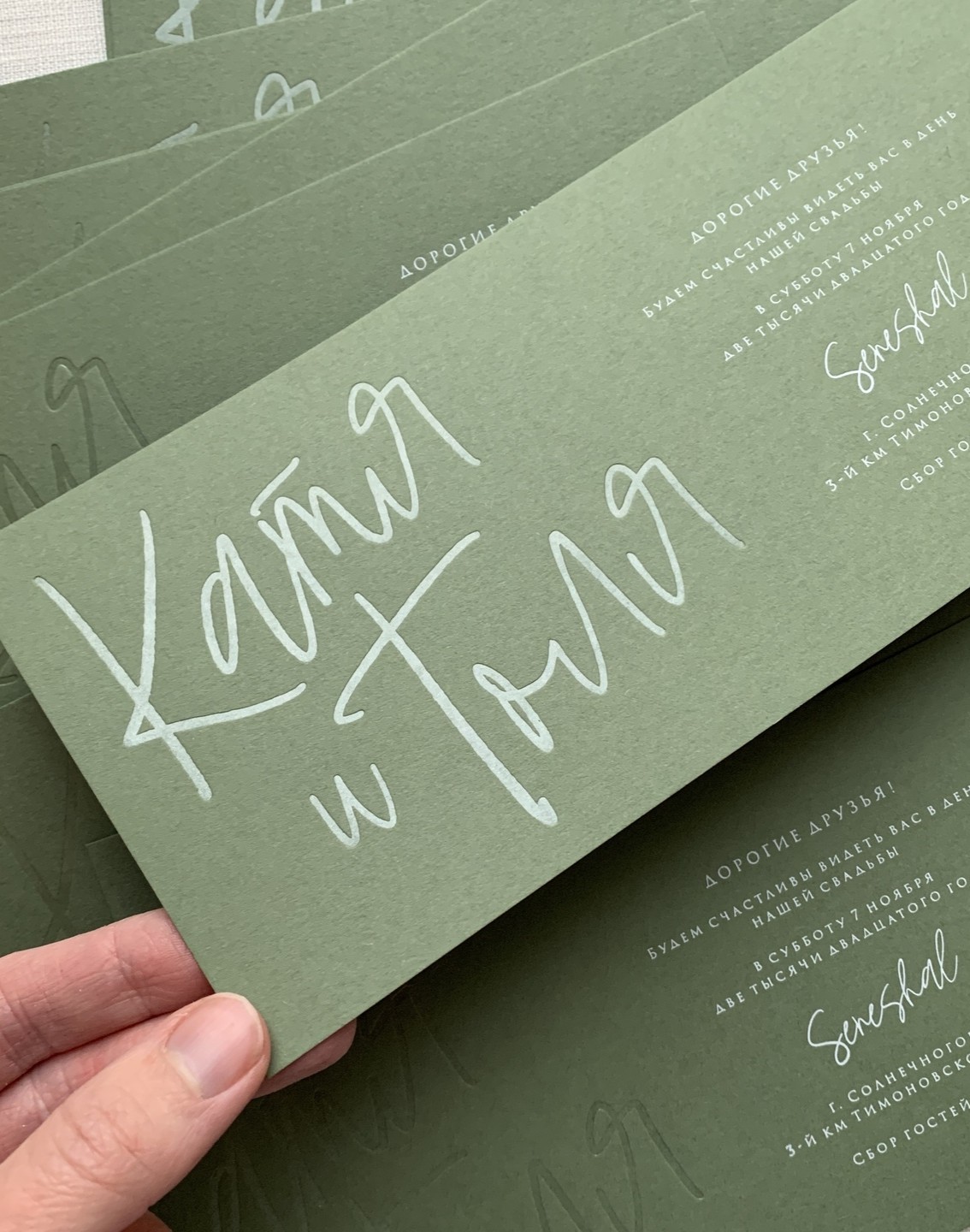 Также по-прежнему не выходят из моды классические свадьбы. Они выбирают для себя лаконичное стильное приглашение с эксклюзивными технологиями печати. Это может быть тиснение, высокая печать, конгрев. Ещё мы используем бумагу ручной работы и вырубку приглашений красивой формы.