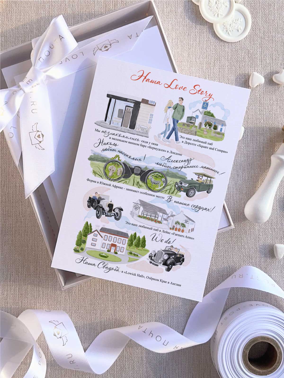 Я предлагаю дополнить приглашения карточкой с деталями, программой, картой локаций, иллюстрированной историей любви. План и карточки рассадки, меню и приветственные плакаты помогут в организации, а книга пожеланий или её альтернатива сохранят тёплые слова ваших близких!
