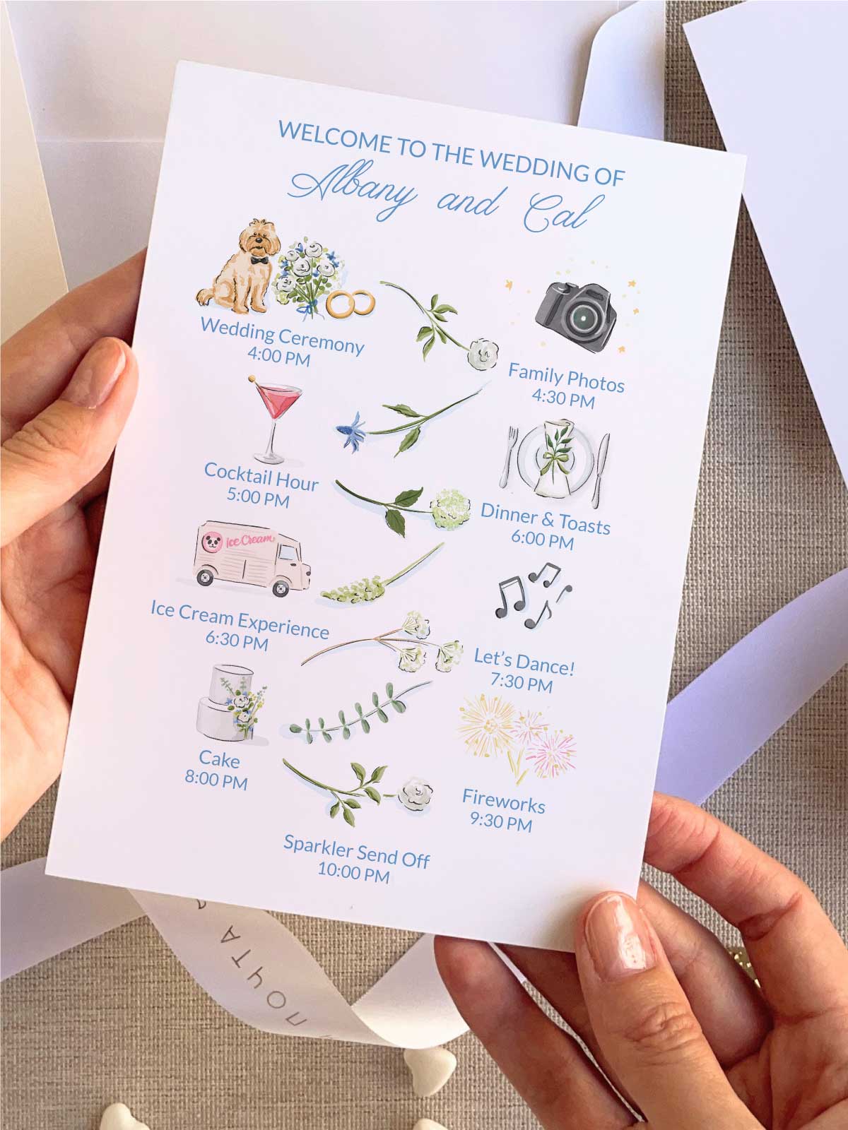 Или, как мы часто делаем для наших пар, можно изготовить всего одну дополнительную карту с qr-кодом, ведущим на ваш свадебный сайт. И уже там разместить блоками всё, что вы хотите рассказать о своём мероприятии.