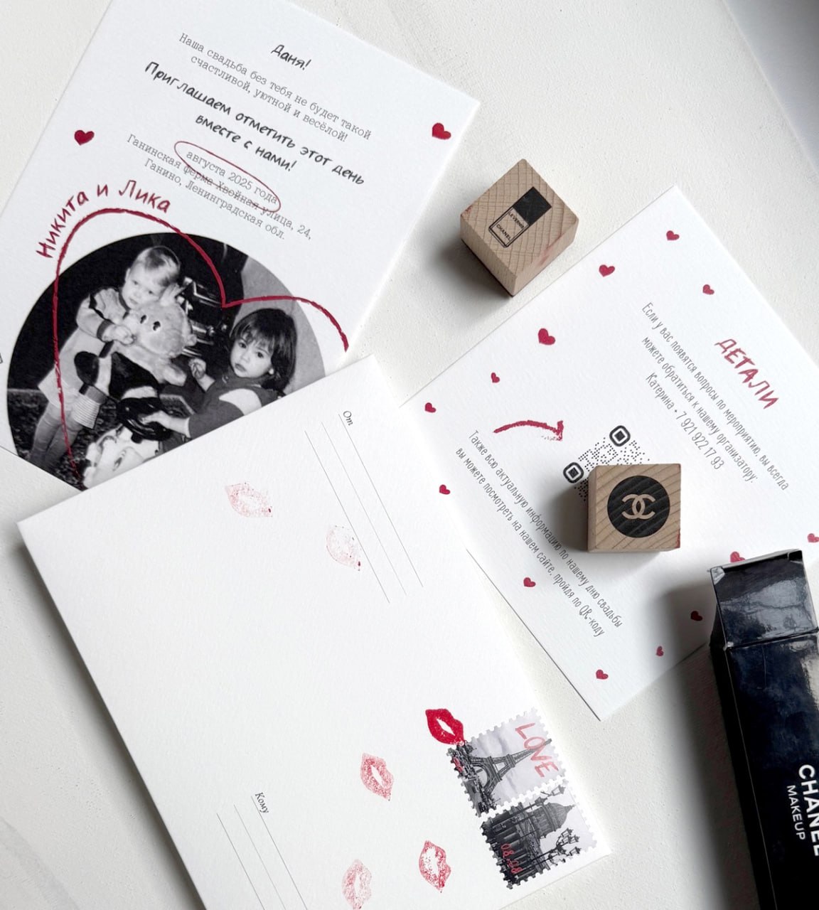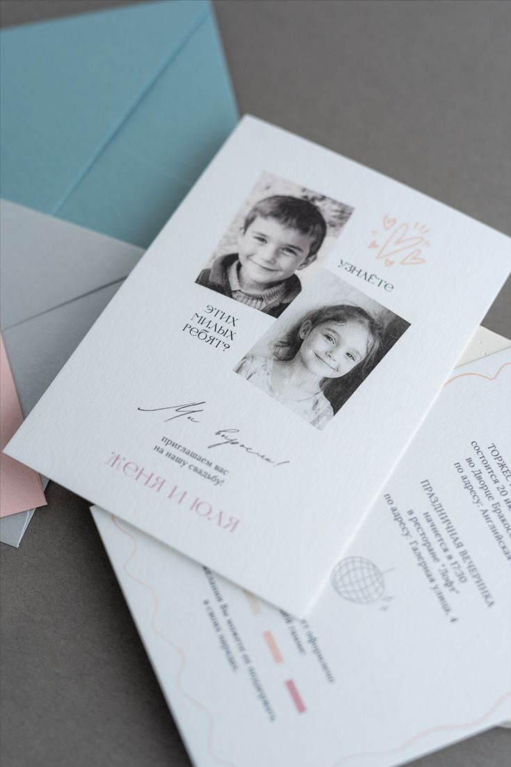 Многие пары выбирают открытки с фотографиями из детства — иногда это два снимка на одной карточке, а иногда коллаж, создающий иллюзию, что вы уже тогда были рядом. Такой вариант обязательно вызовет умиление у ваших гостей!