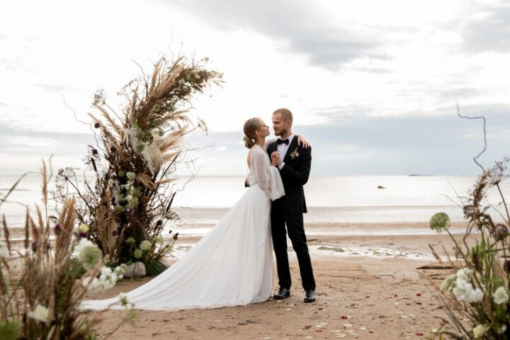 Мы сразу решили, что хотим организовывать выездную свадьбу и только на песке с видом на Финский залив. Светлые и нежные цвета, легкость и минимализм. Локация была на Финском заливе.
