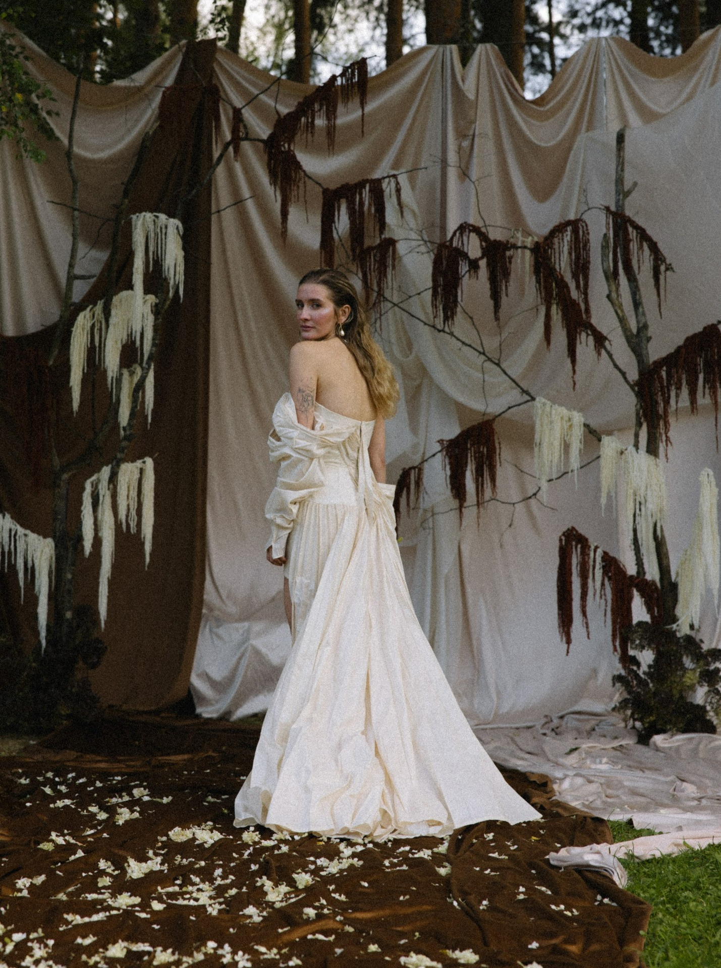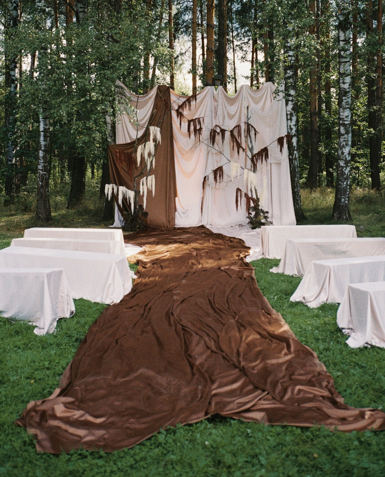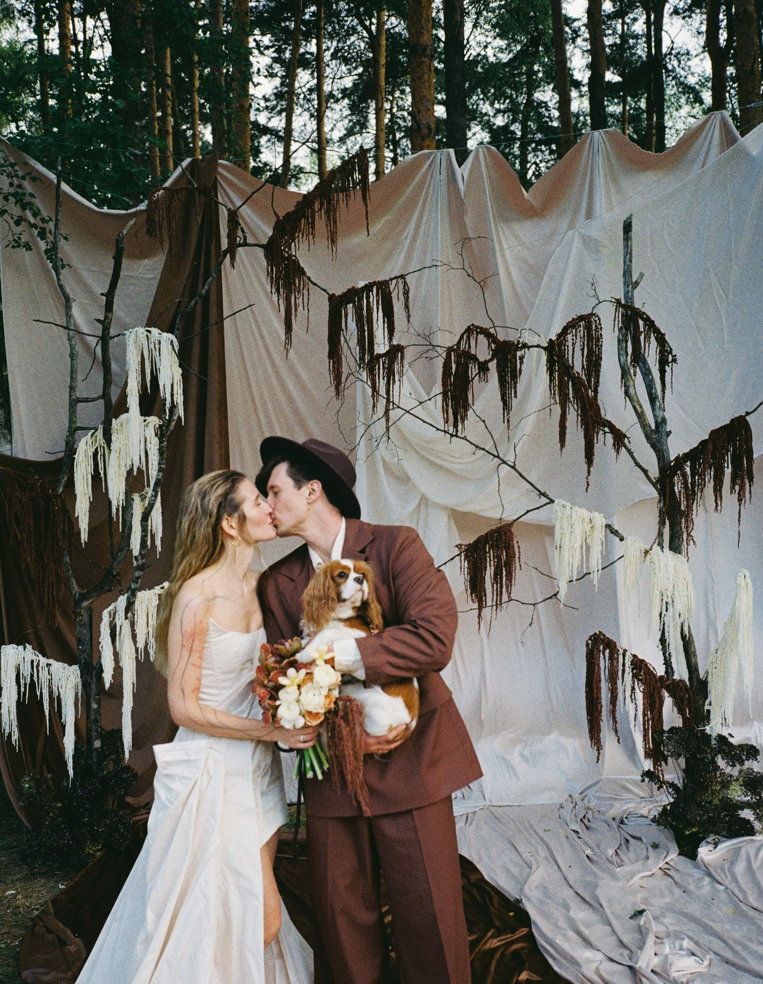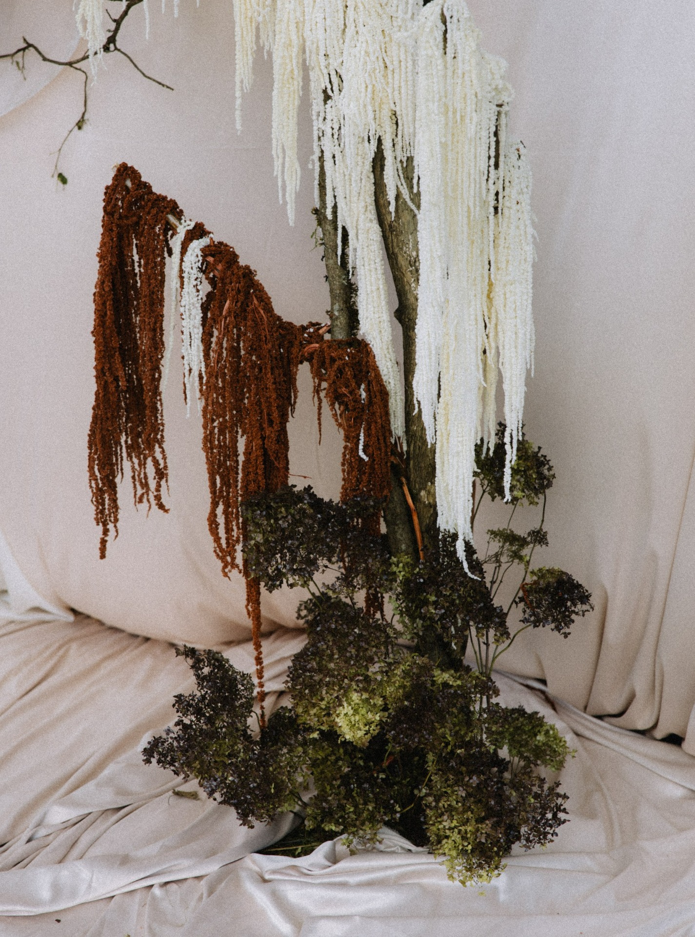 Стол украшали необычные фермерские цветы, переходящие градиентом от тёмного к светлому. А в зоне церемонии нам хотелось уйти от классических цветочных арок, поэтому мы выбрали ткани, обилие ветвей и свисающий амарант.