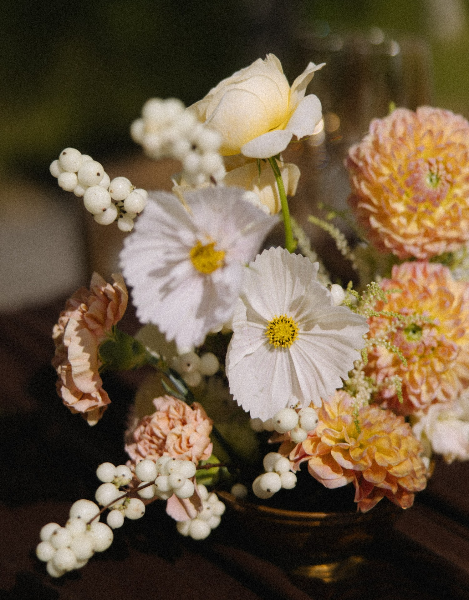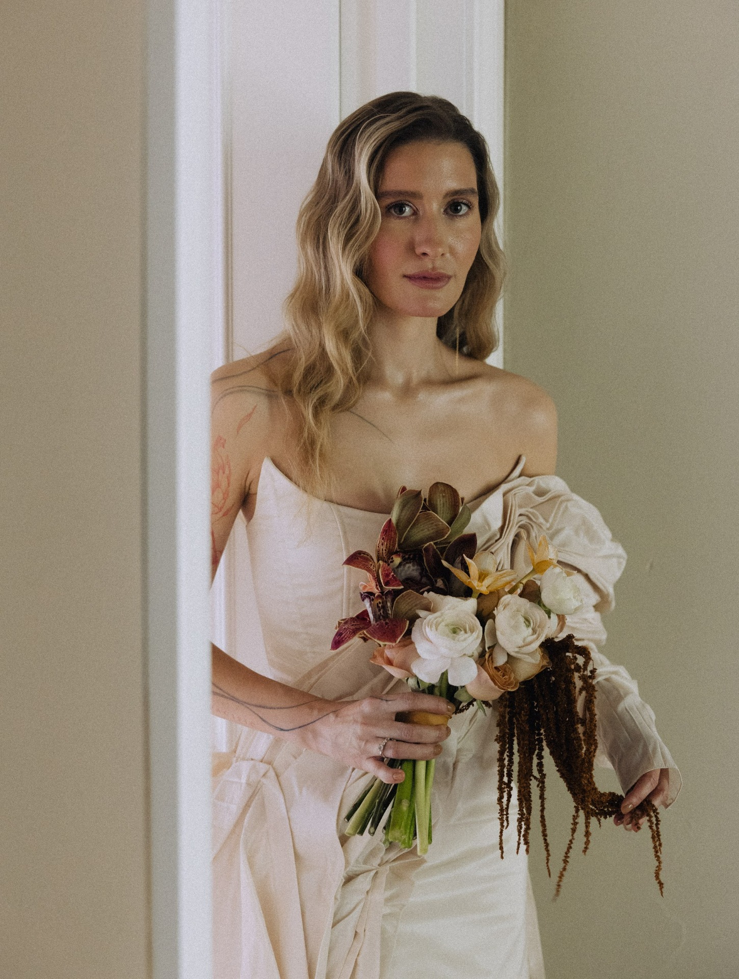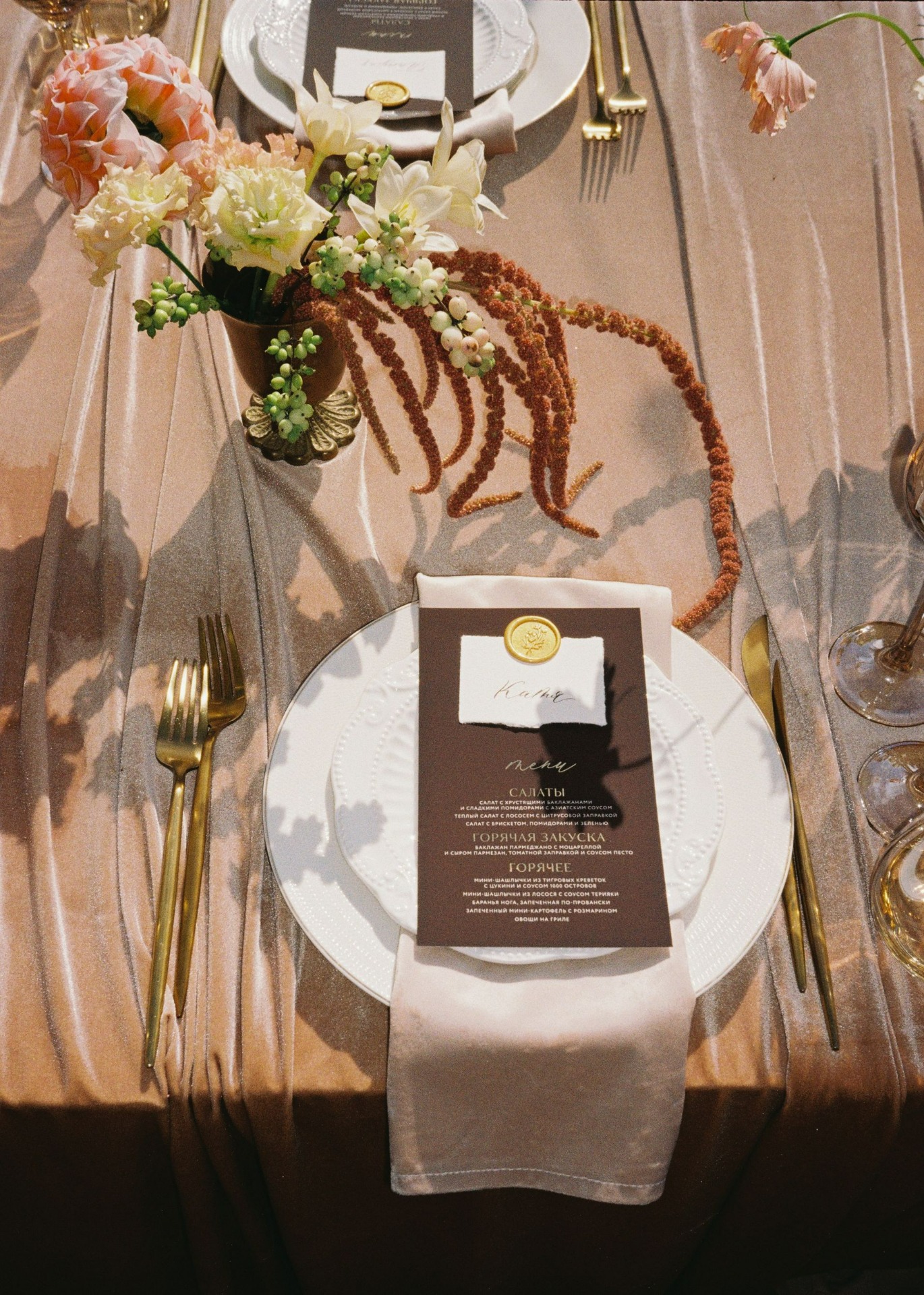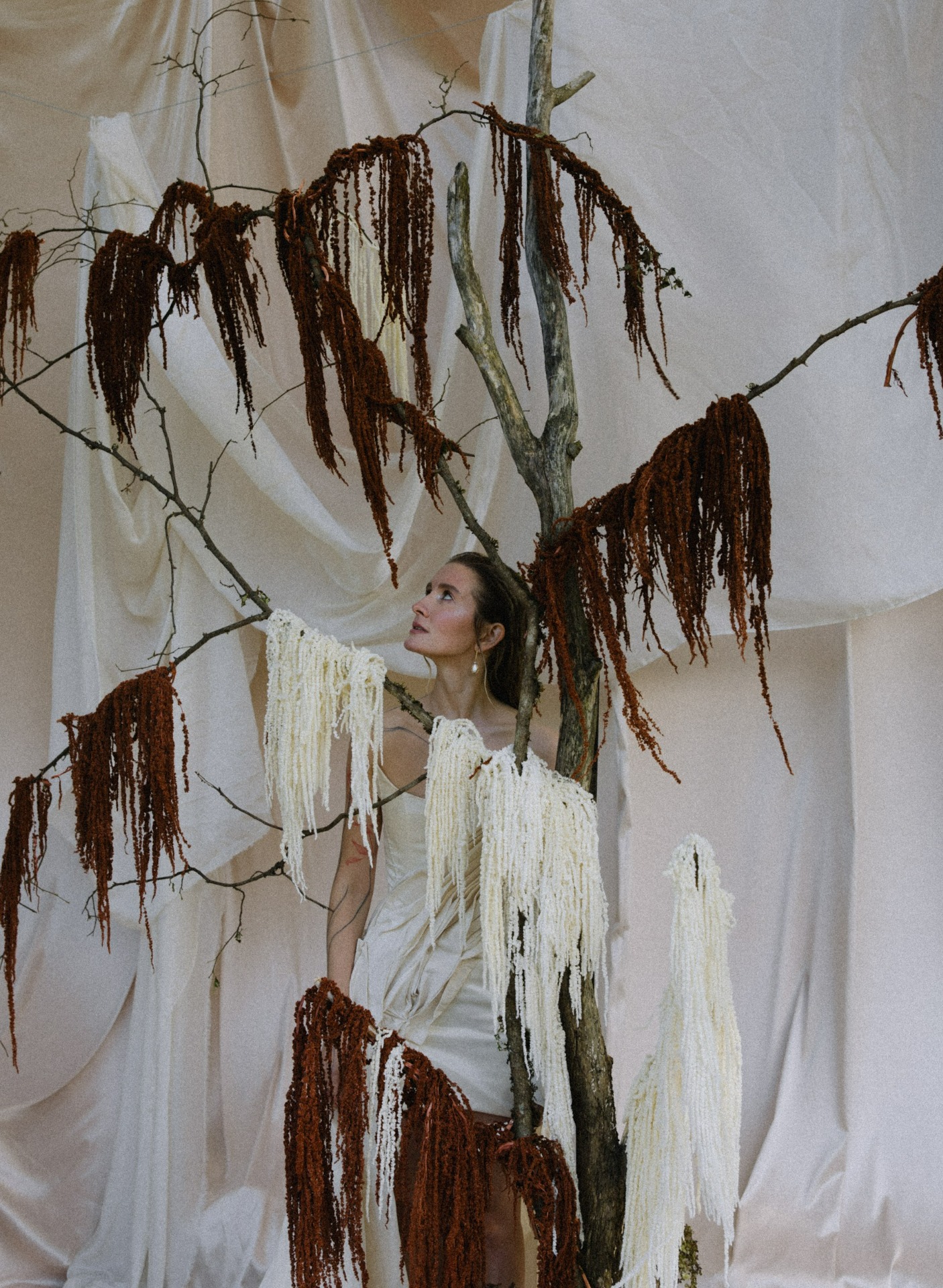 Стол украшали необычные фермерские цветы, переходящие градиентом от тёмного к светлому. А в зоне церемонии нам хотелось уйти от классических цветочных арок, поэтому мы выбрали ткани, обилие ветвей и свисающий амарант.
