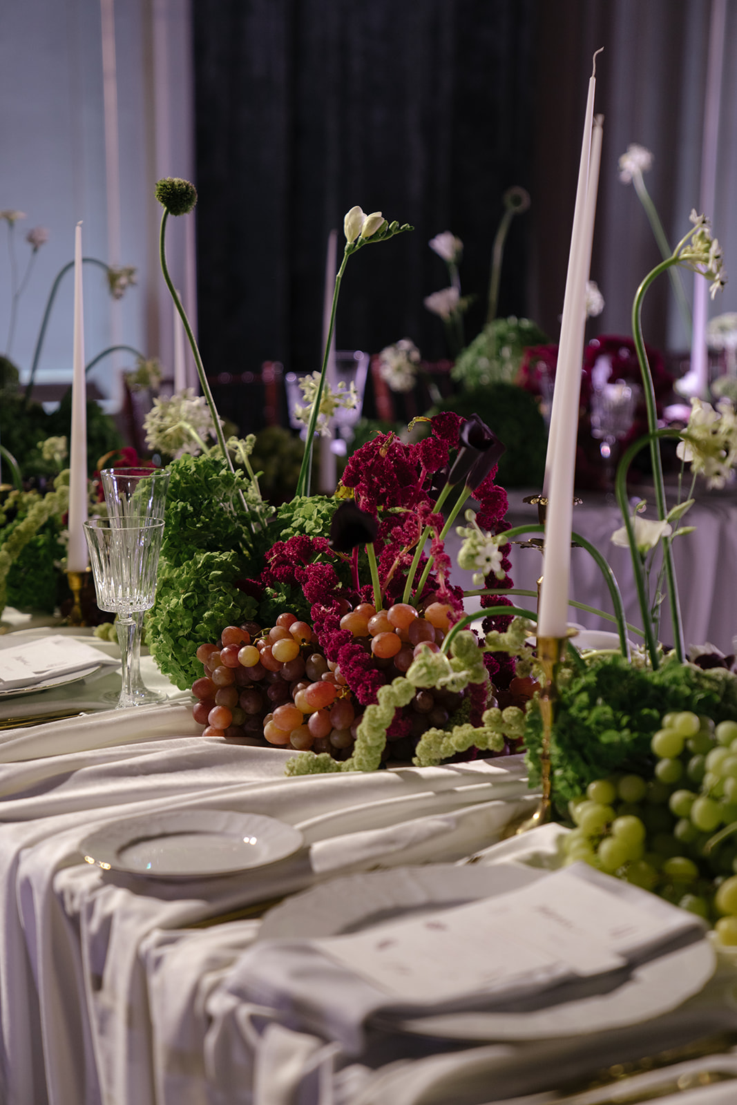 Особое внимание уделялось welcome-зоне: из-за ограниченного выбора арендных позиций в Санкт-Петербурге, многие детали были специально приобретены или созданы. Арфа и виолончель создавали атмосферу во время коктейльного часа.