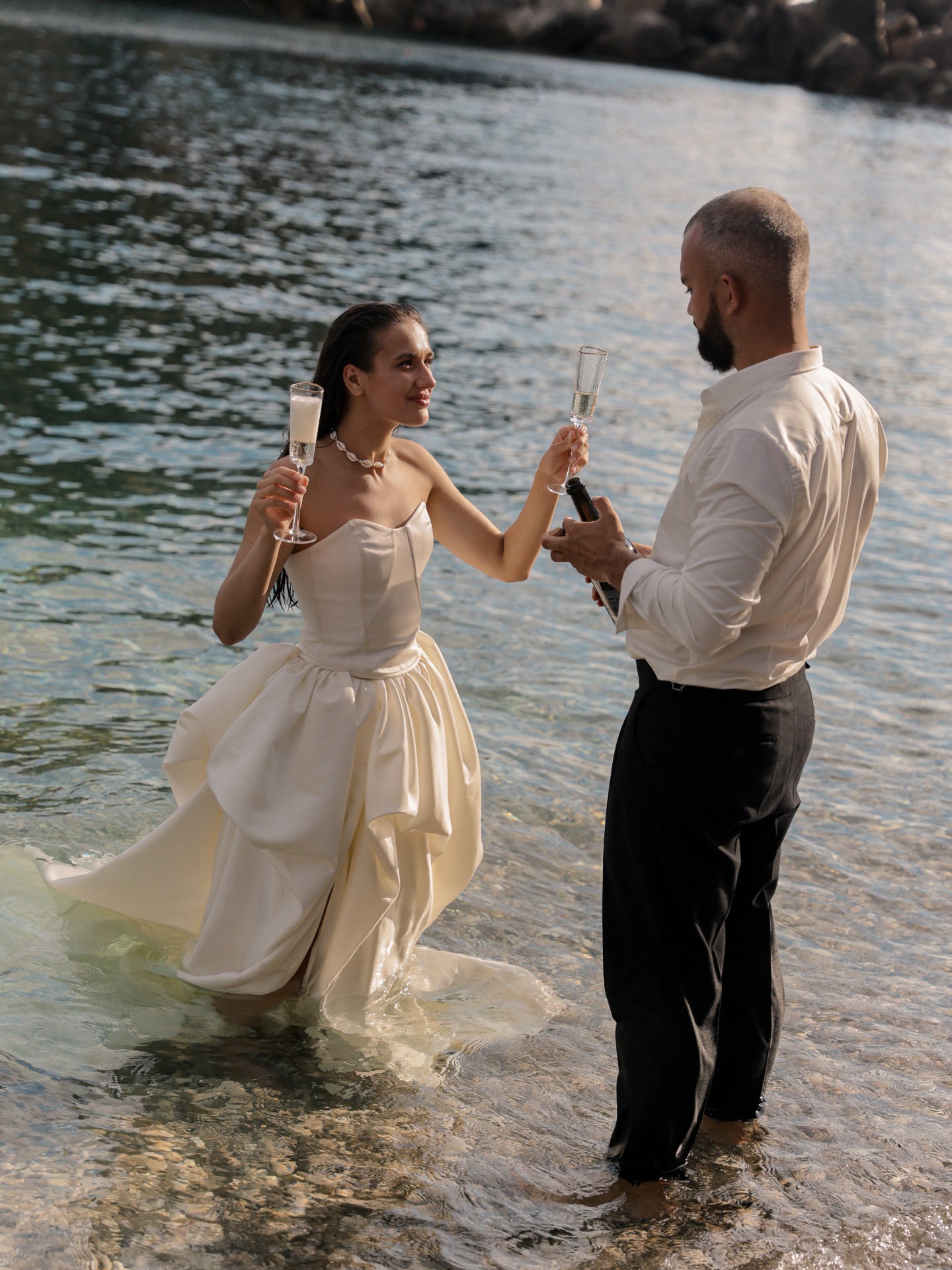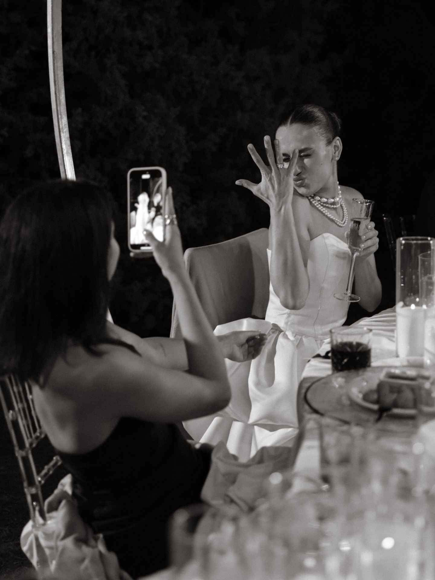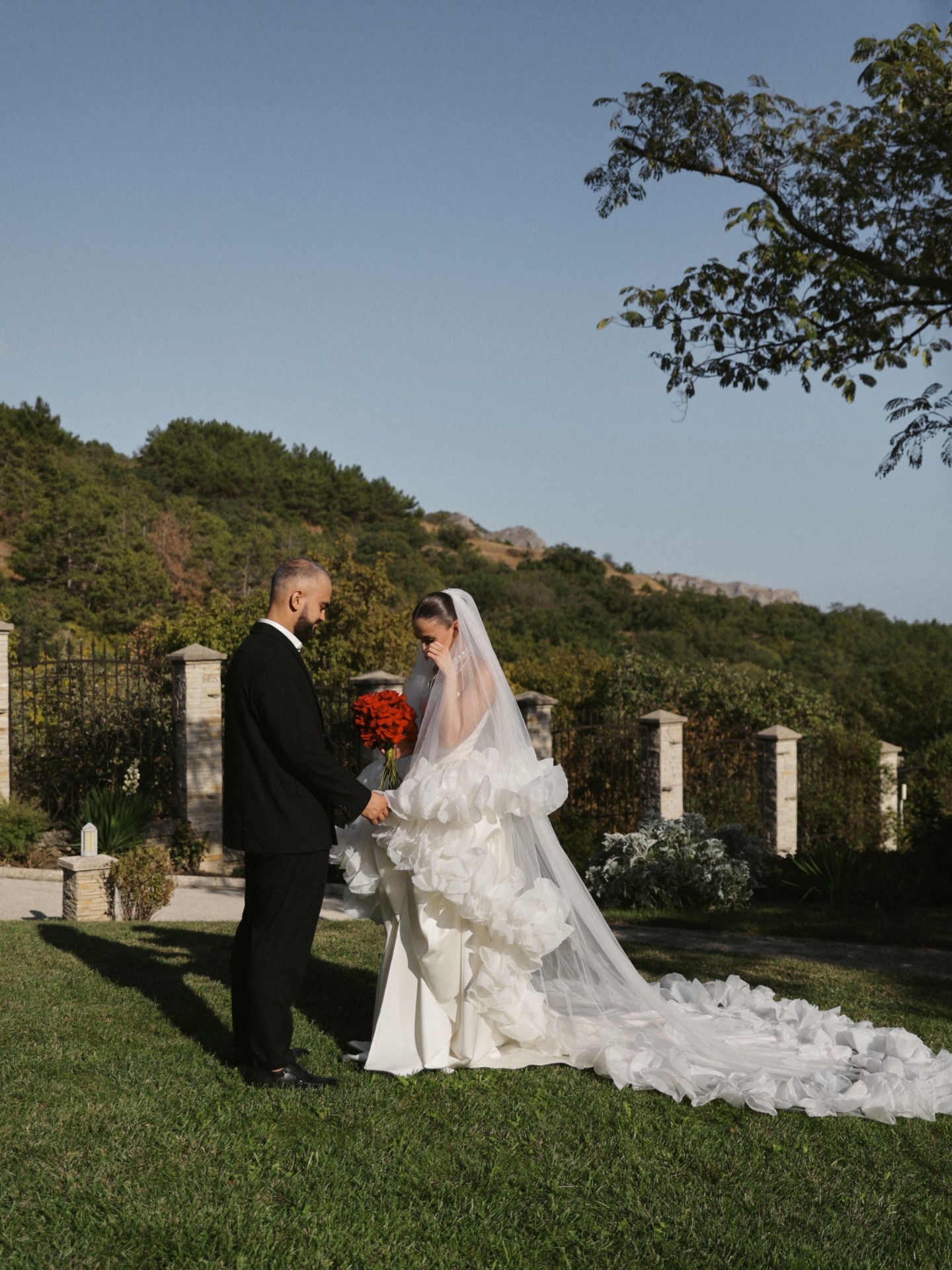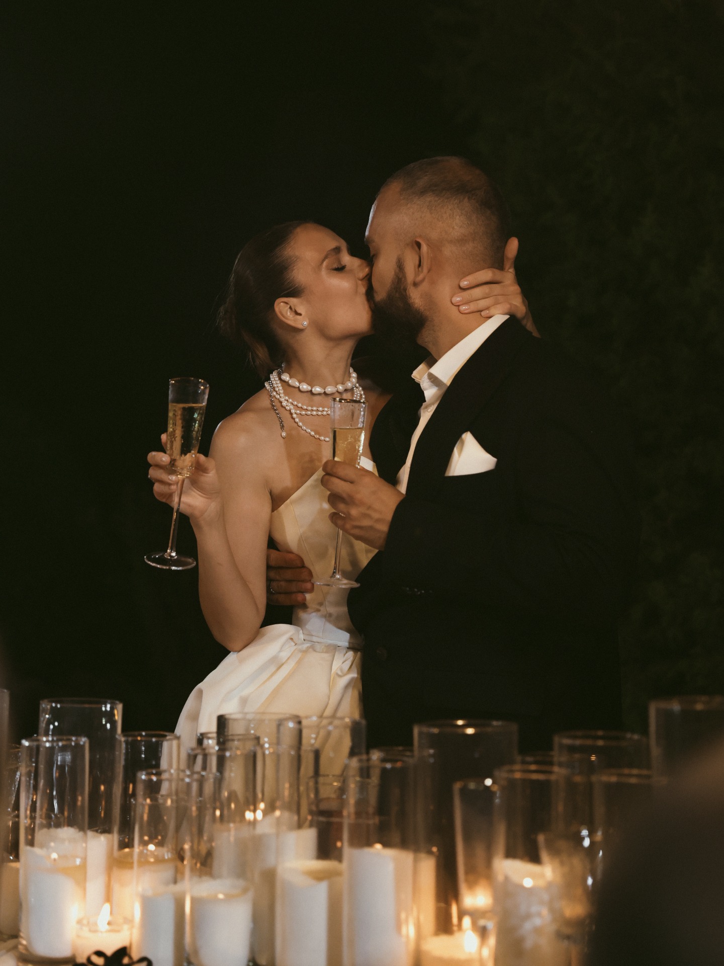 Я хотела создать итальянский вайб: огромное количество свечей в колбах с водой, никаких цветочных декоров, вилла с красивым видом, дресс-код total black, букет невесты из красных роз. Всё должно было быть очень элегантно.