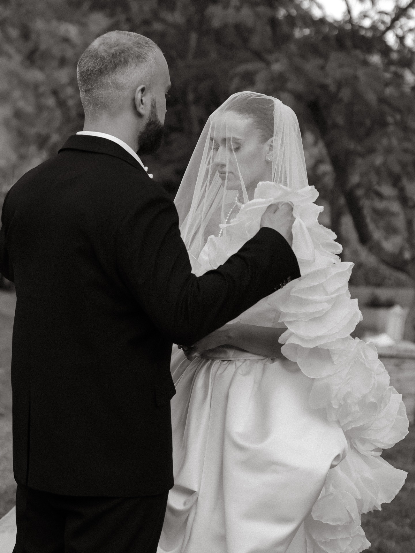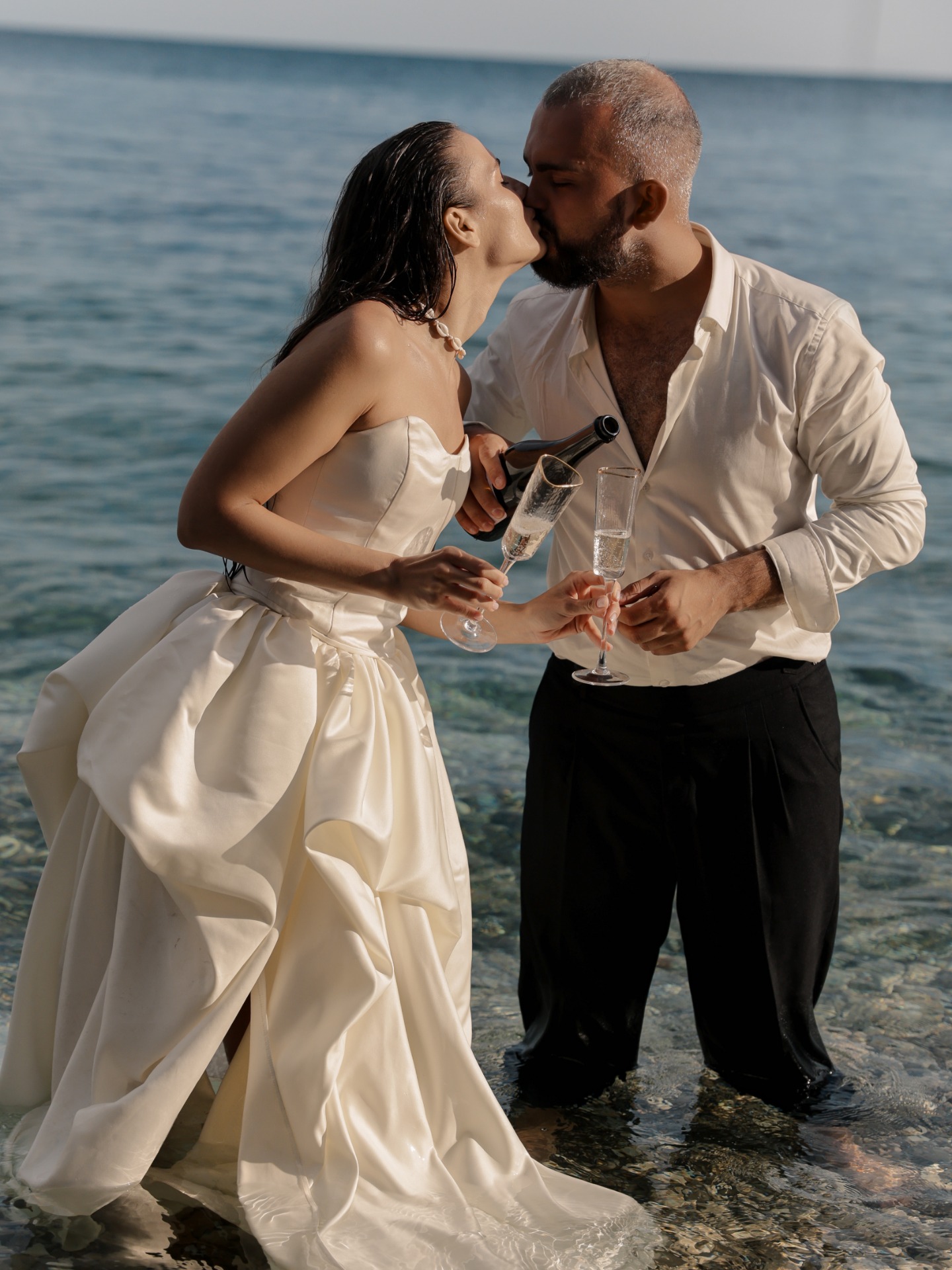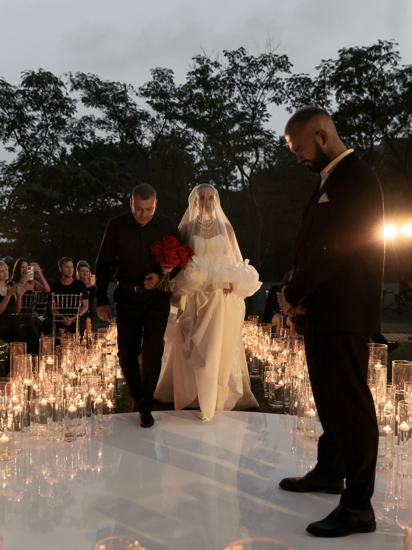Я хотела создать итальянский вайб: огромное количество свечей в колбах с водой, никаких цветочных декоров, вилла с красивым видом, дресс-код total black, букет невесты из красных роз. Всё должно было быть очень элегантно.
