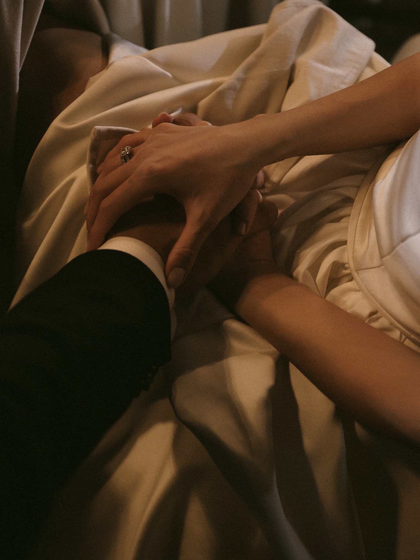 Я знала, какой я хочу образ и декор сразу после предложения. Атласное платье со шлейфом, длинная фата и свечи. Именно с этим запросом я пришла к организатору. У меня были референсы и концепция.
