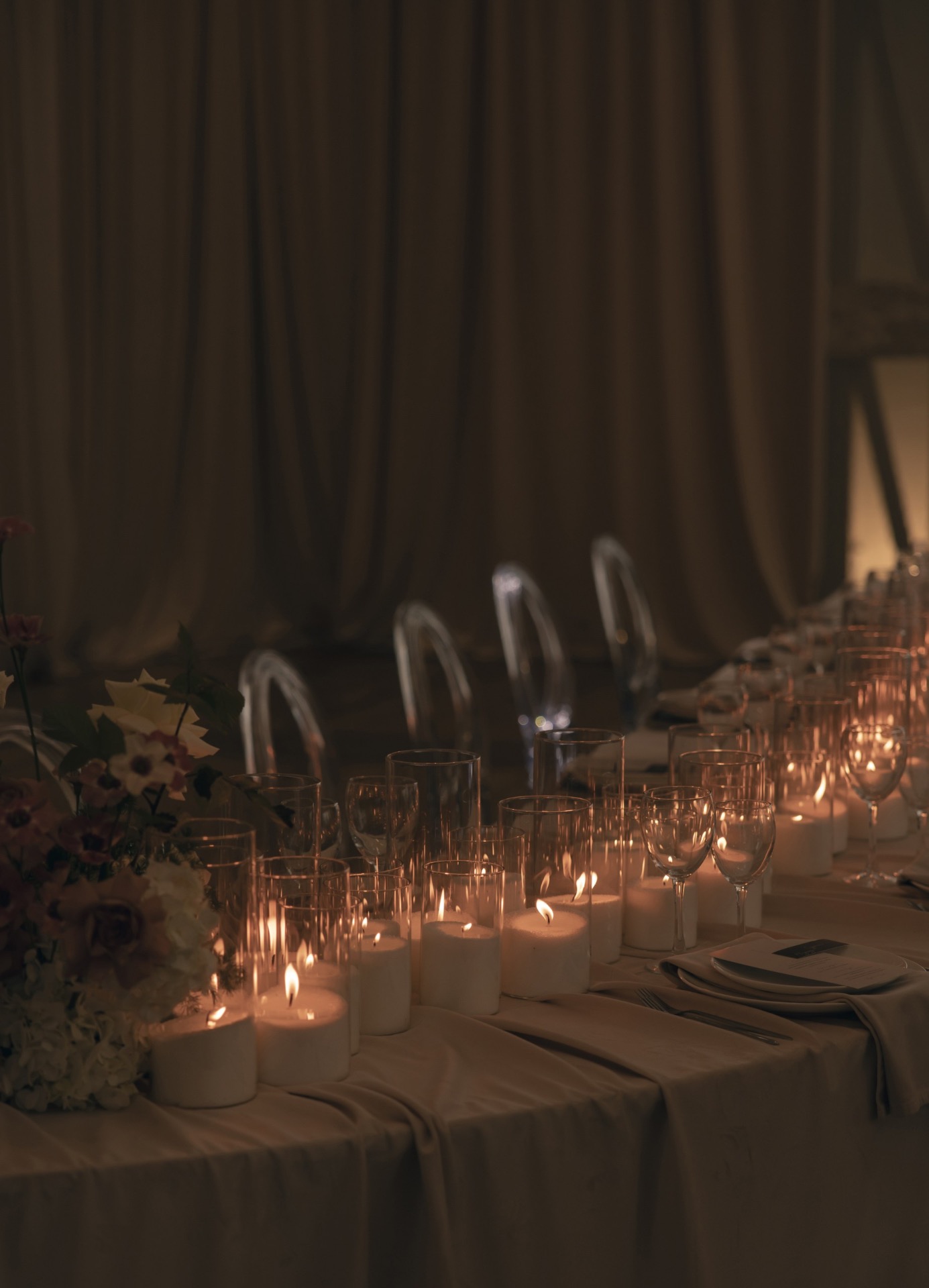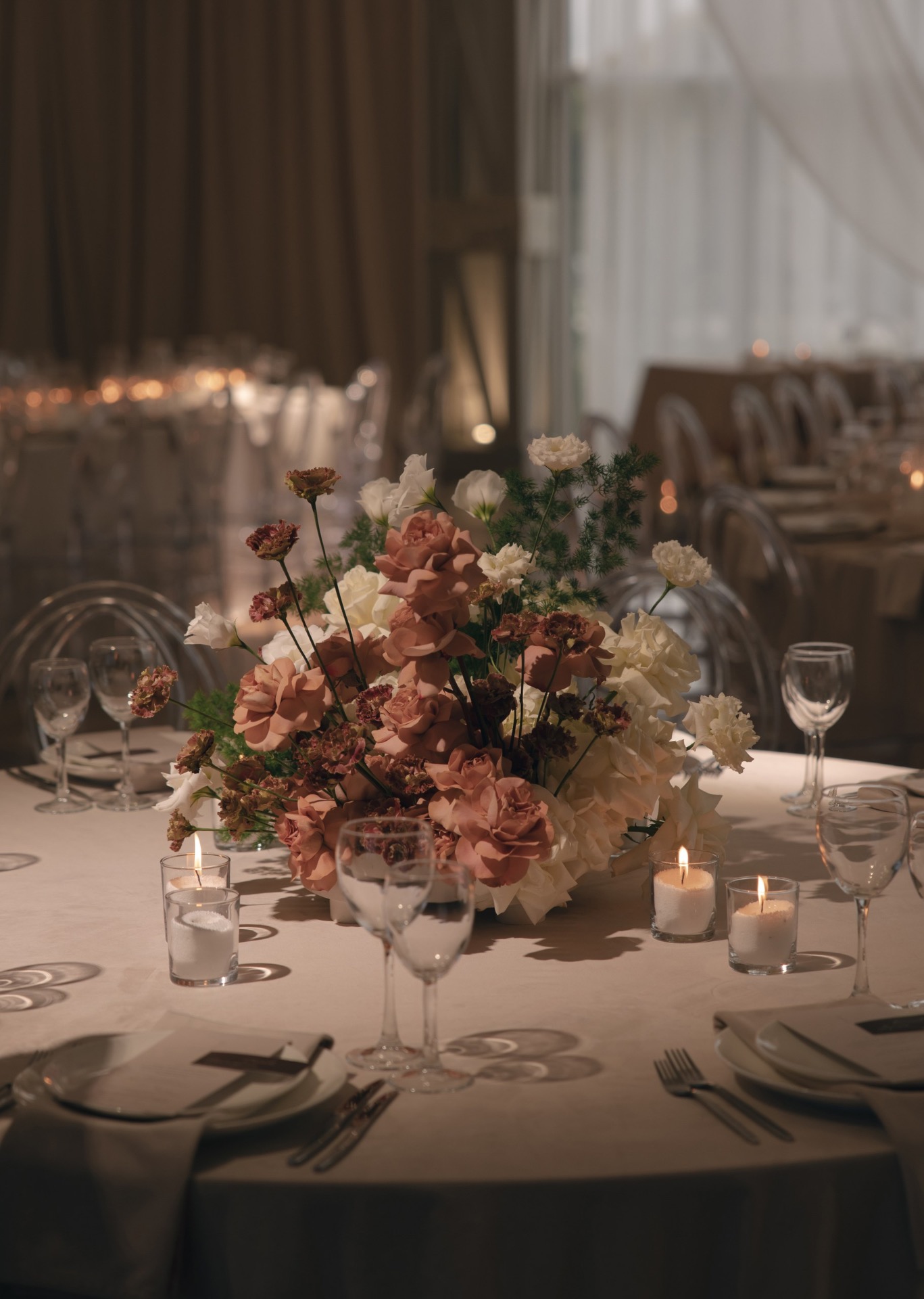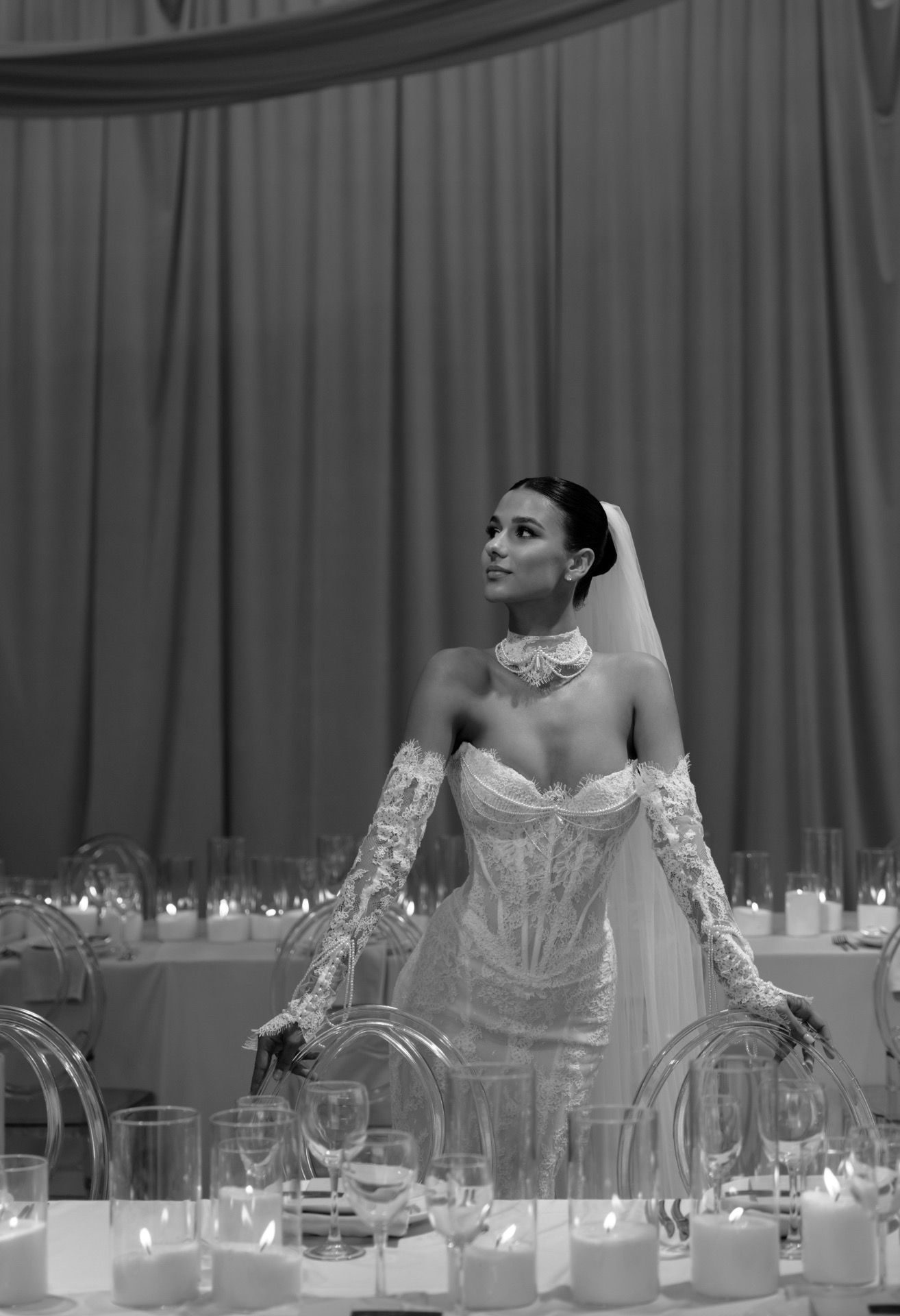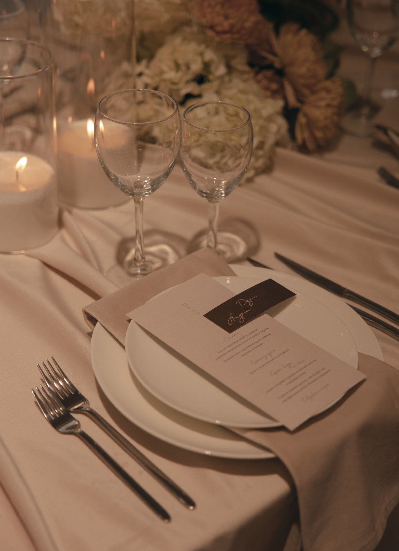 После того как мы отфотографировались в отеле, мы поехали на площадку и по приезде сразу получили массу эмоций от декора. Когда я зашла в зал, я пришла в восторг: как красиво стояли свечи, композиции, свисали полотна ткани.