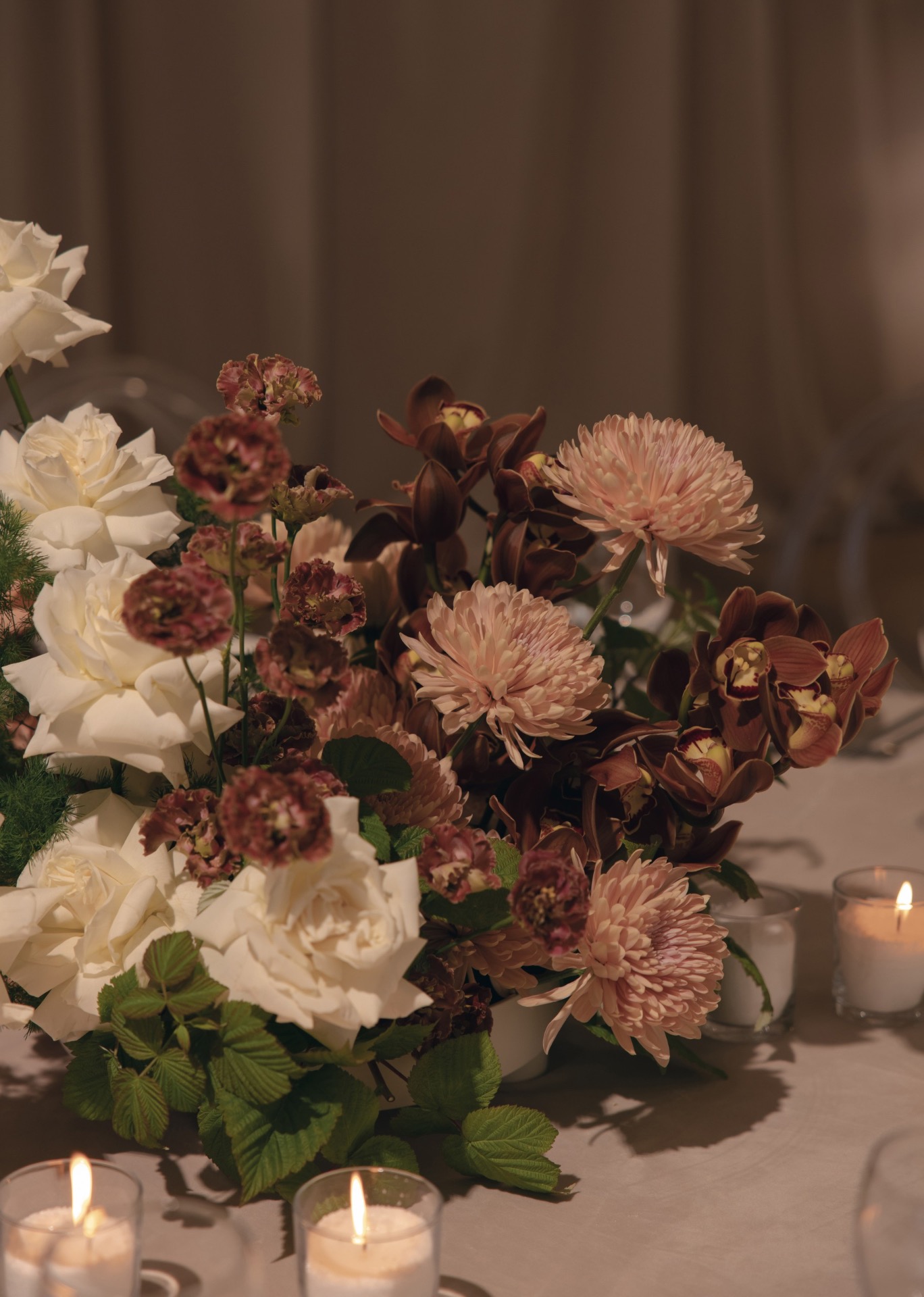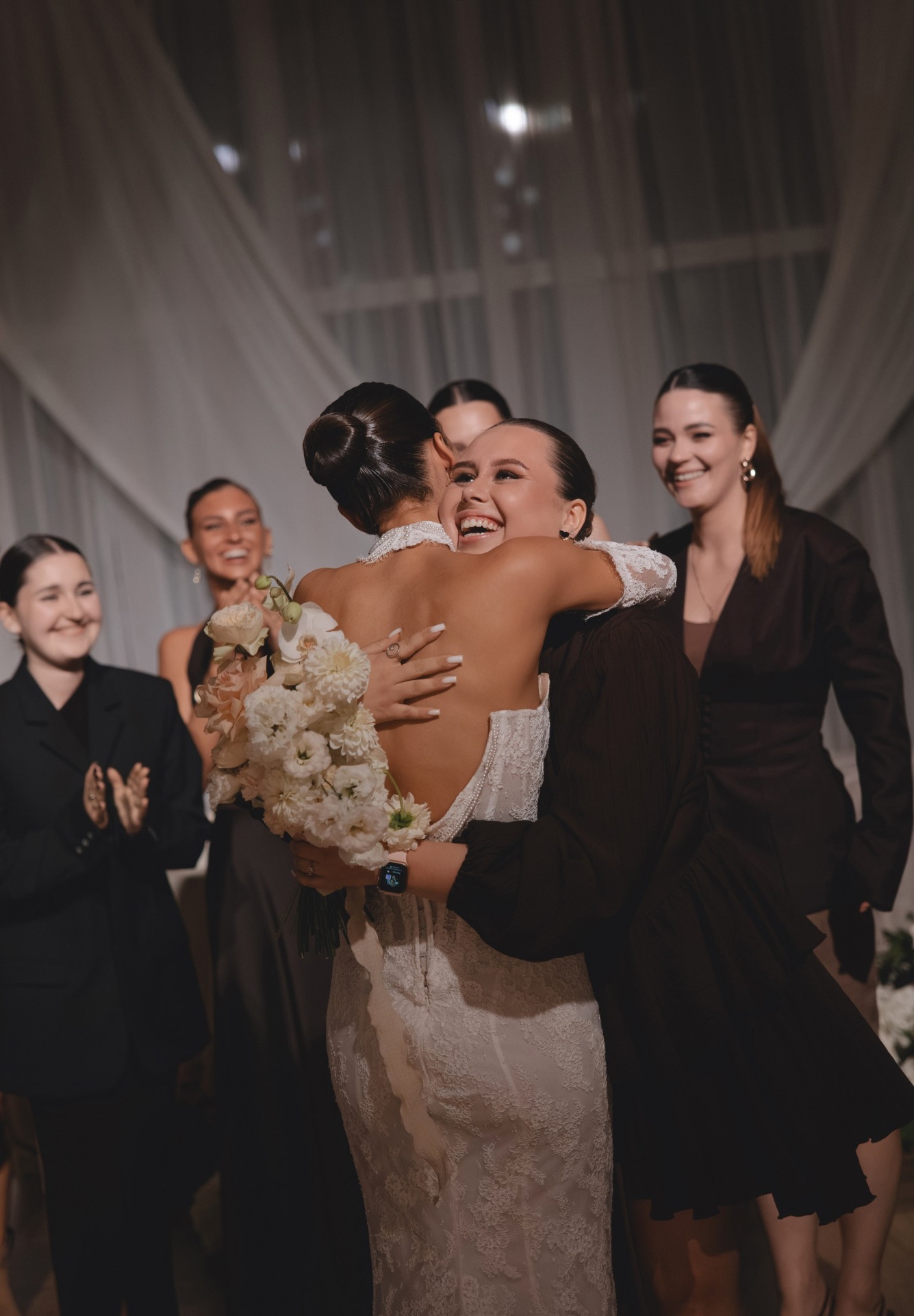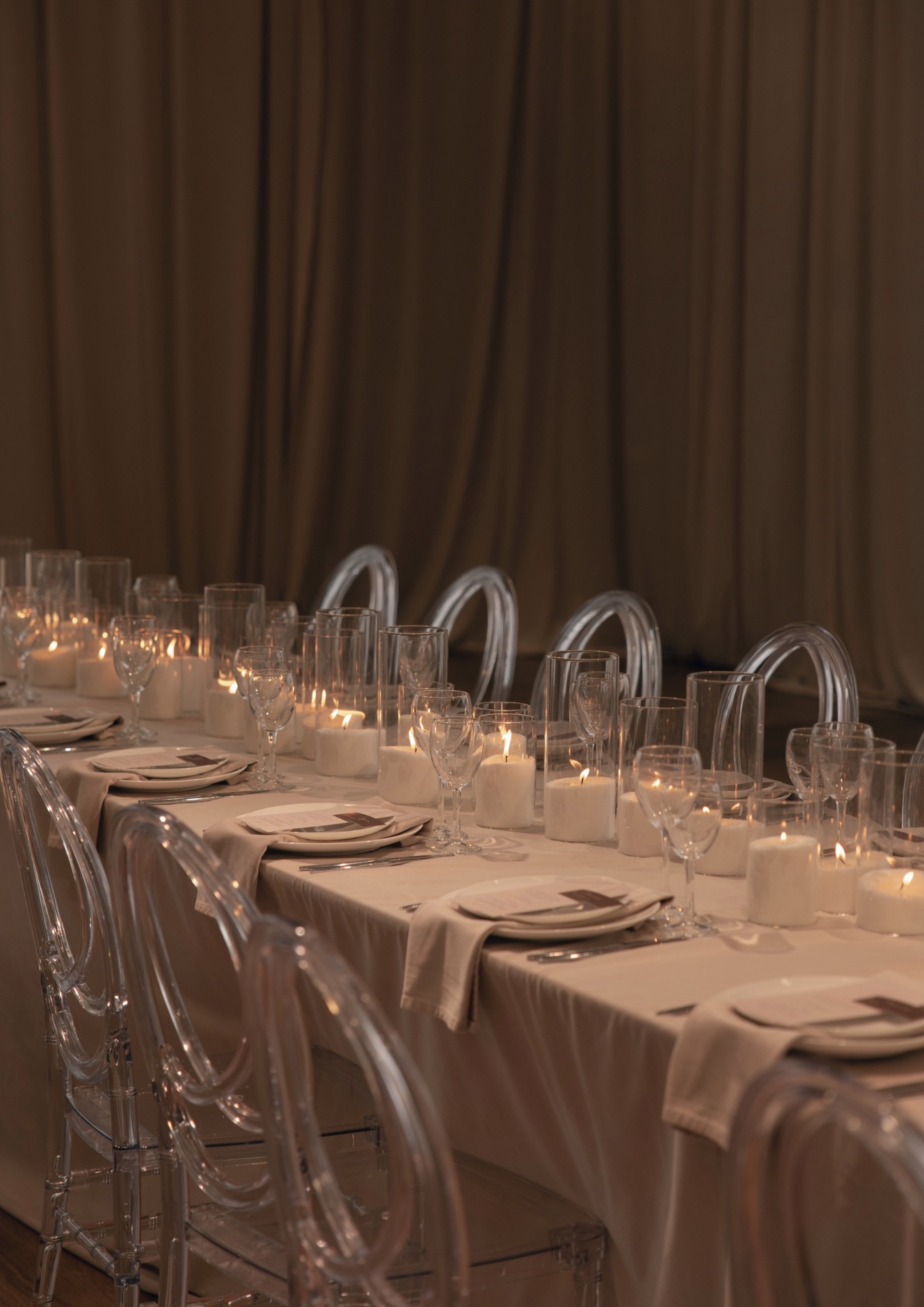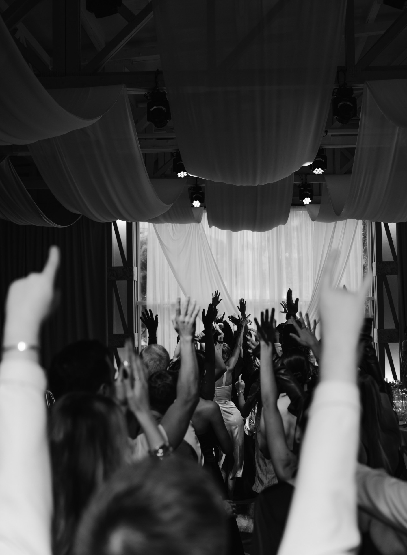 После того как мы отфотографировались в отеле, мы поехали на площадку и по приезде сразу получили массу эмоций от декора. Когда я зашла в зал, я пришла в восторг: как красиво стояли свечи, композиции, свисали полотна ткани.