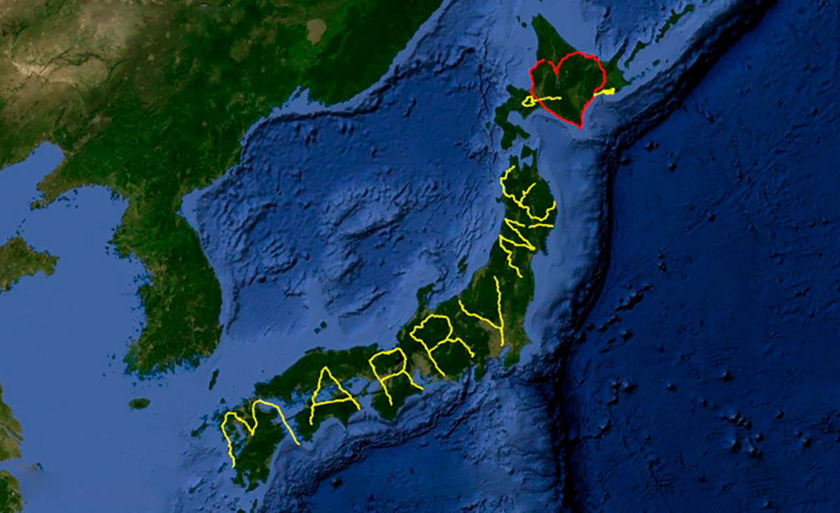В 2008 году Ясуши задумал уникальный проект: создать гигантский GPS-рисунок с надписью «Marry me» («Выходи за меня») прямо на карте Японии. Для этого он отправился в полугодовое путешествие протяжённостью 7163 километра, преодолевая расстояние на автомобиле, велосипеде, пароходе и, конечно, пешком. Каждый шаг фиксировался GPS-устройством, и, несмотря на трудности — проливные дожди, снегопады и даже землетрясения — Ясуши не сдавался.