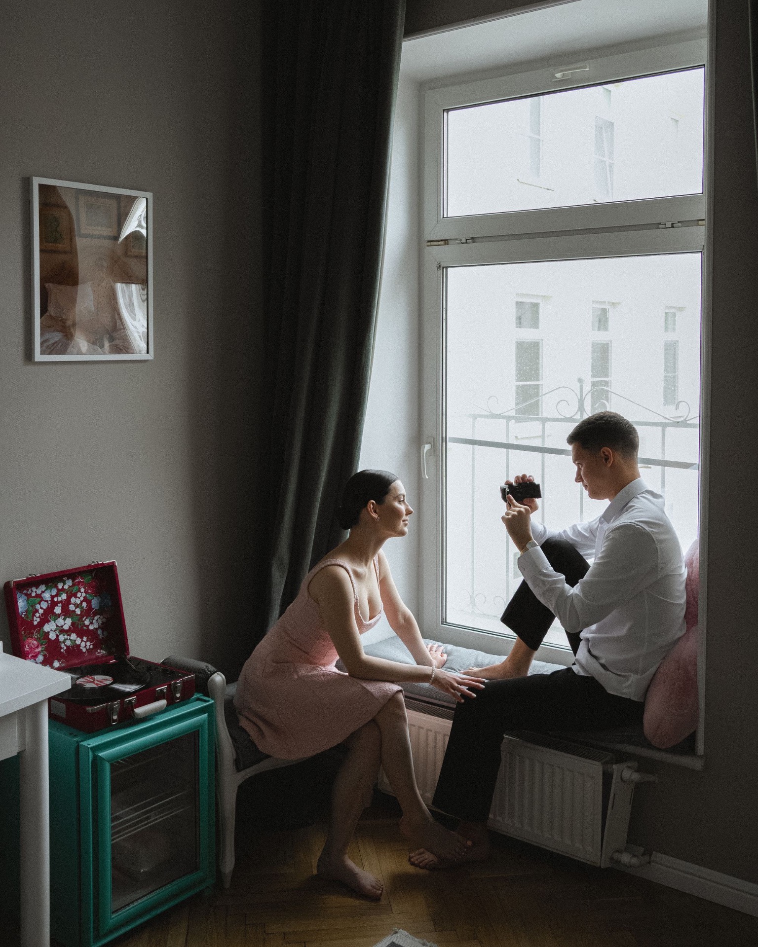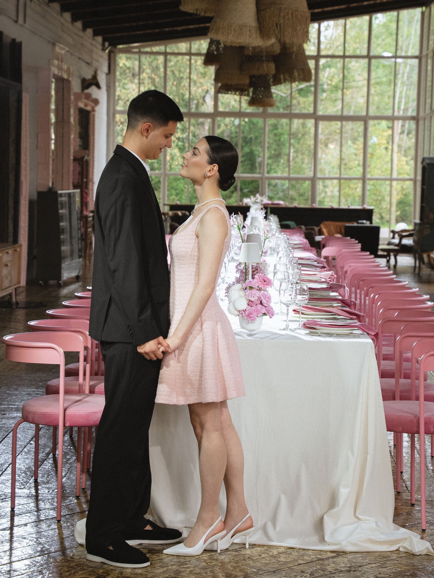 На утреннюю фотосессию мы решили сделать для меня не классический образ. Мы с девочками нашли классное розовое твидовое платье, в котором я была словно конфетка. Оно идеально вписалось в нашу концепцию. А Егор был в брюках и расслабленной рубашке.