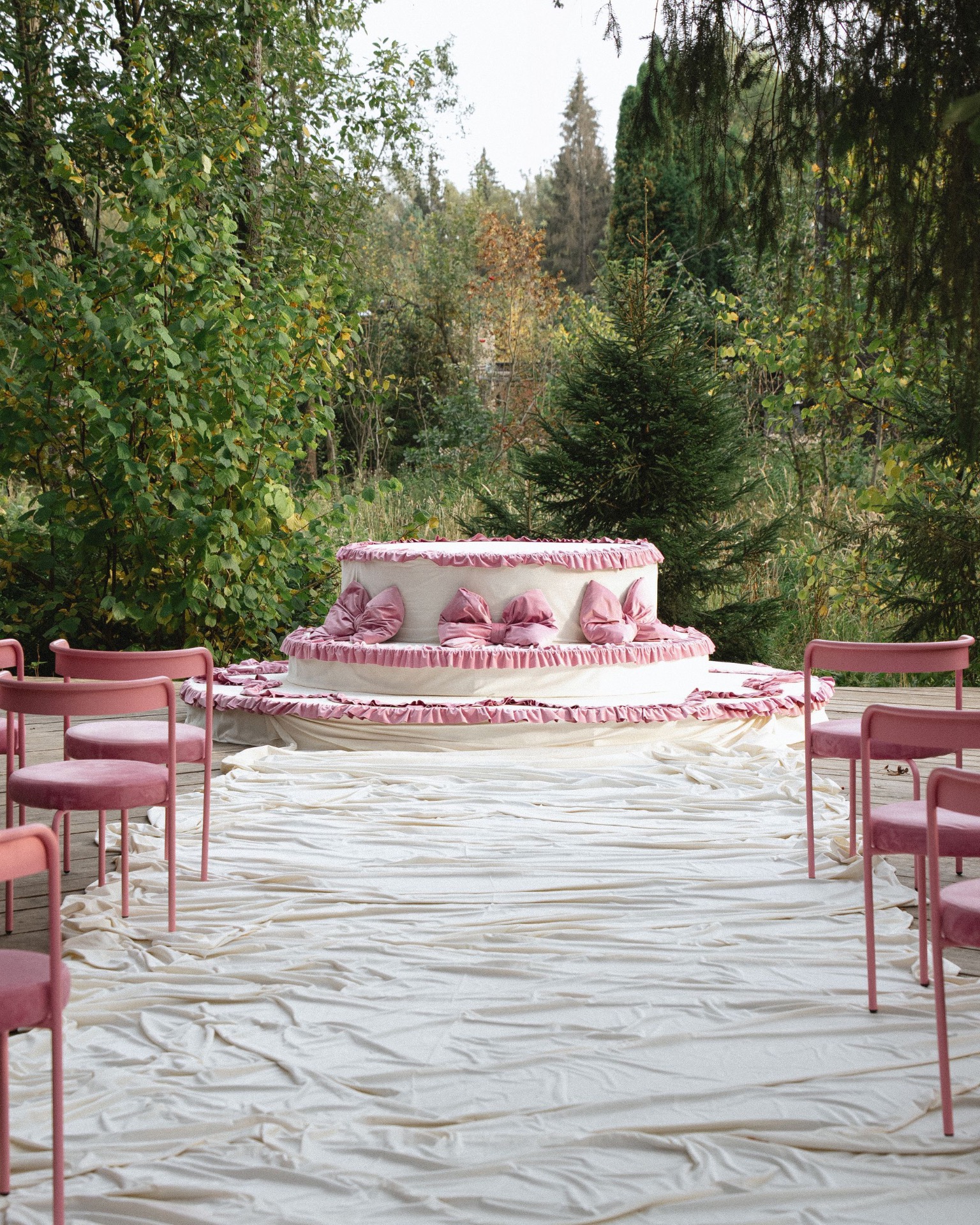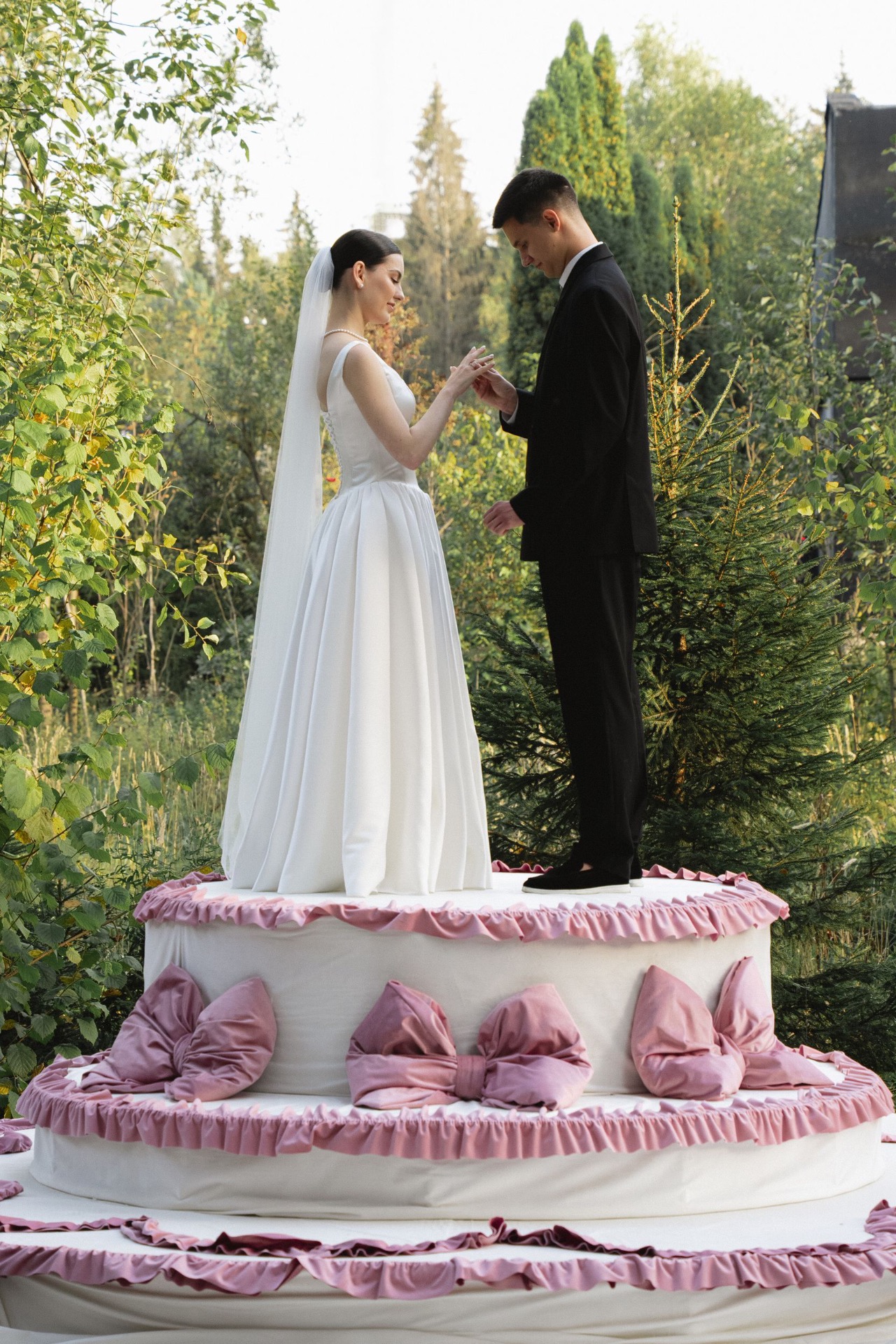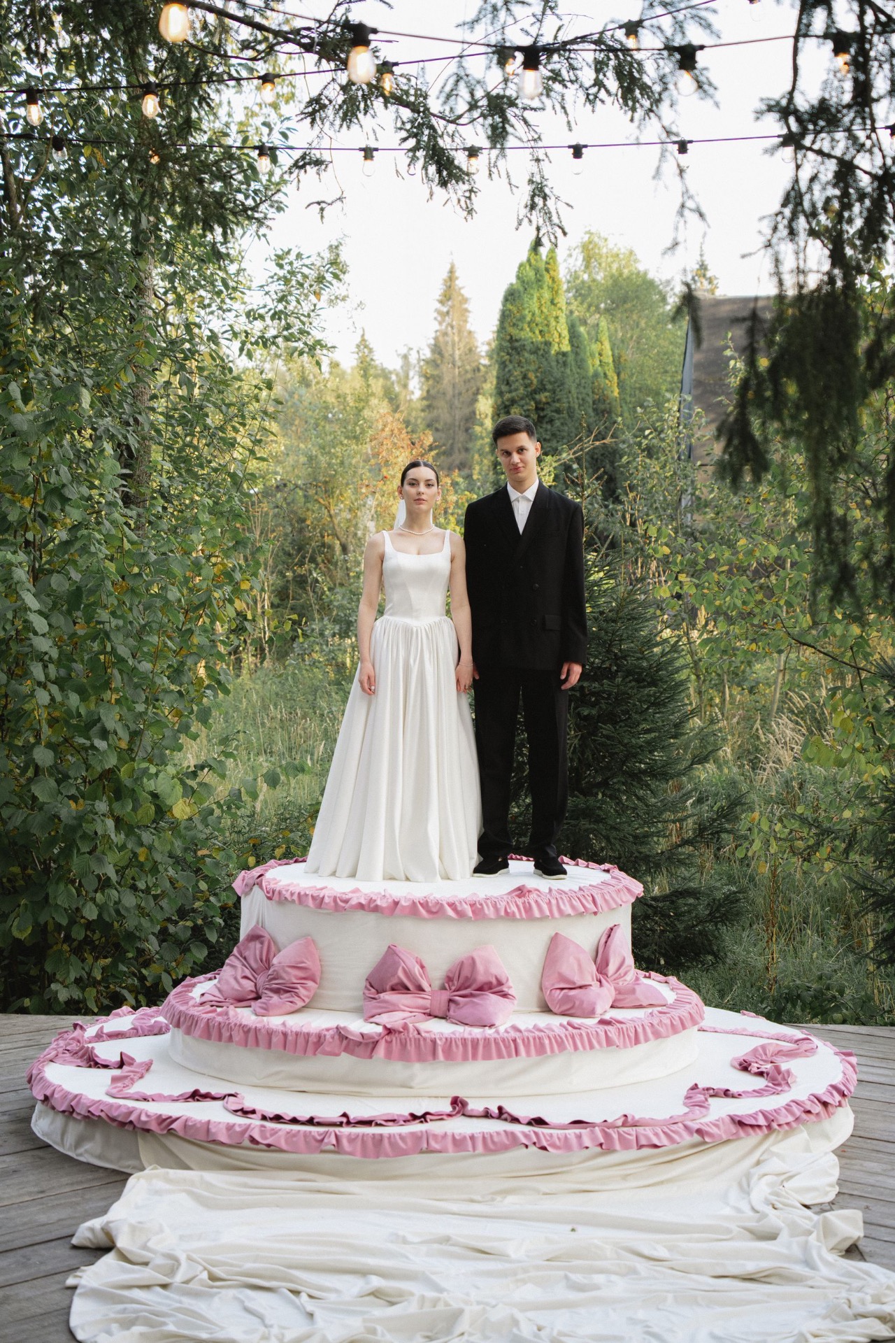 Главным акцентом концепции была наша зона церемонии в виде тортика. По нашей задумке, мы должны были стать теми самыми фигурками на нём. Егор сначала переживал, как это будет выглядеть, но я, девочки и декораторы успокоили его. И в итоге всё вышло невероятно круто.