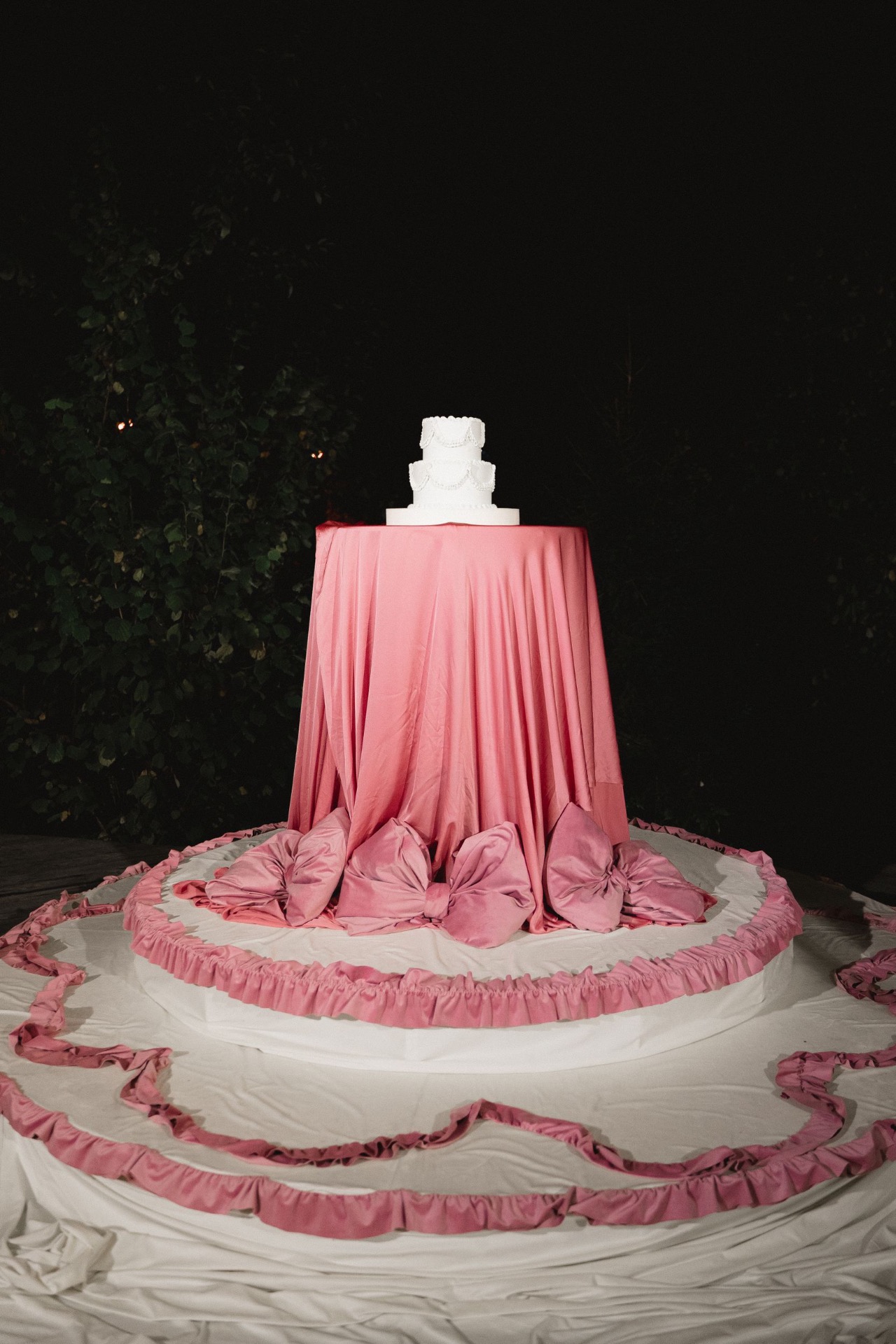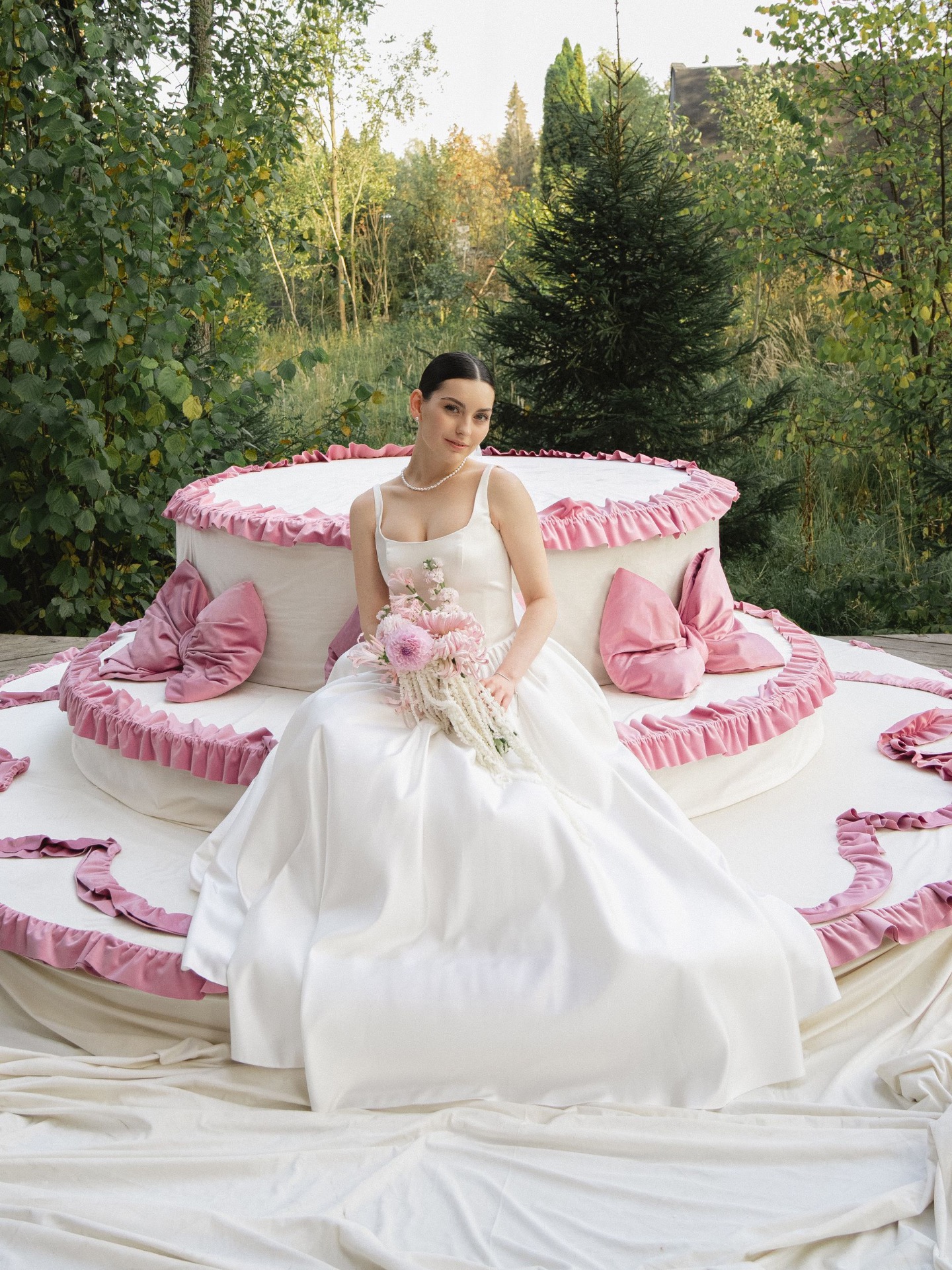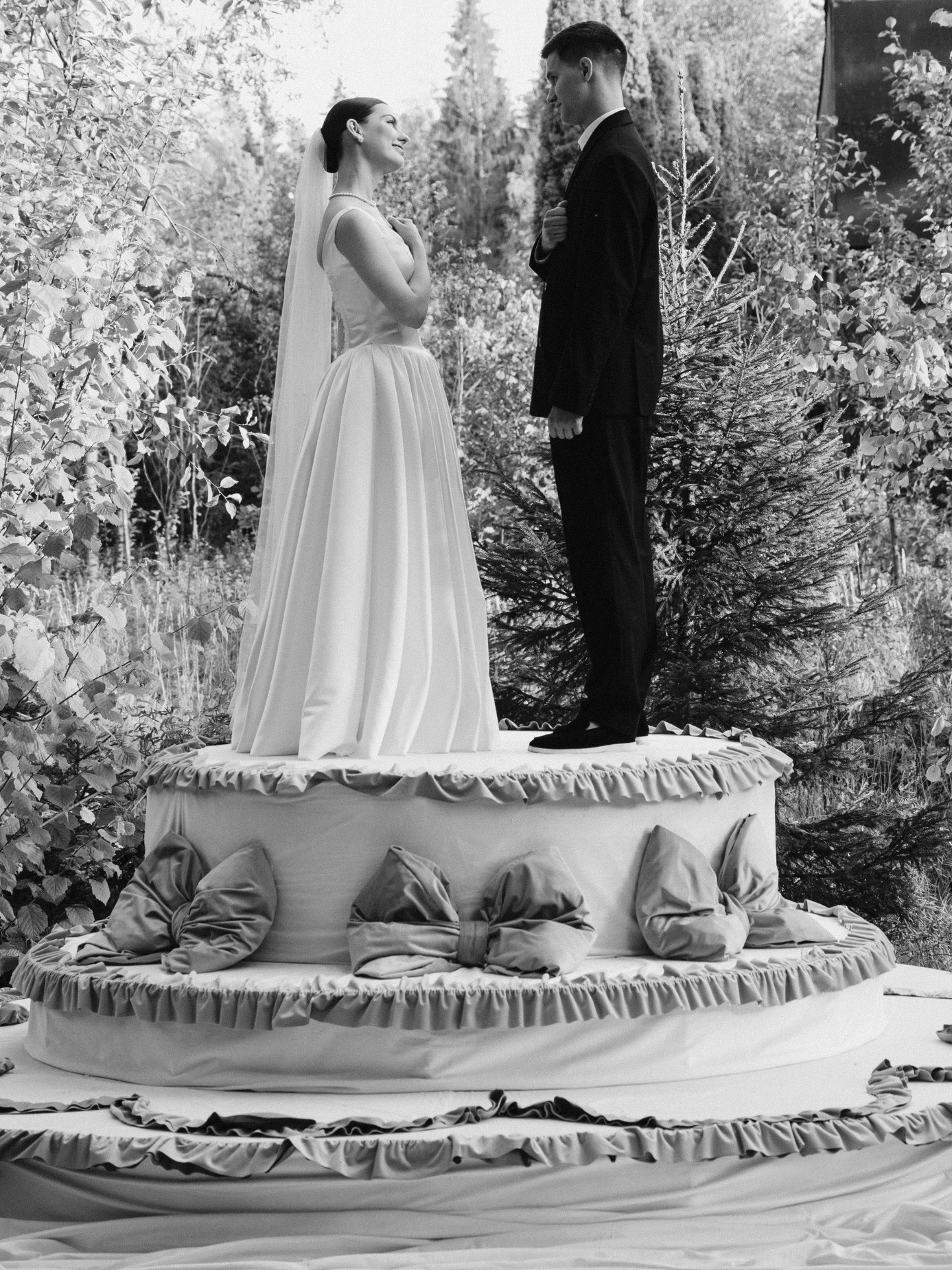 Главным акцентом концепции была наша зона церемонии в виде тортика. По нашей задумке, мы должны были стать теми самыми фигурками на нём. Егор сначала переживал, как это будет выглядеть, но я, девочки и декораторы успокоили его. И в итоге всё вышло невероятно круто.