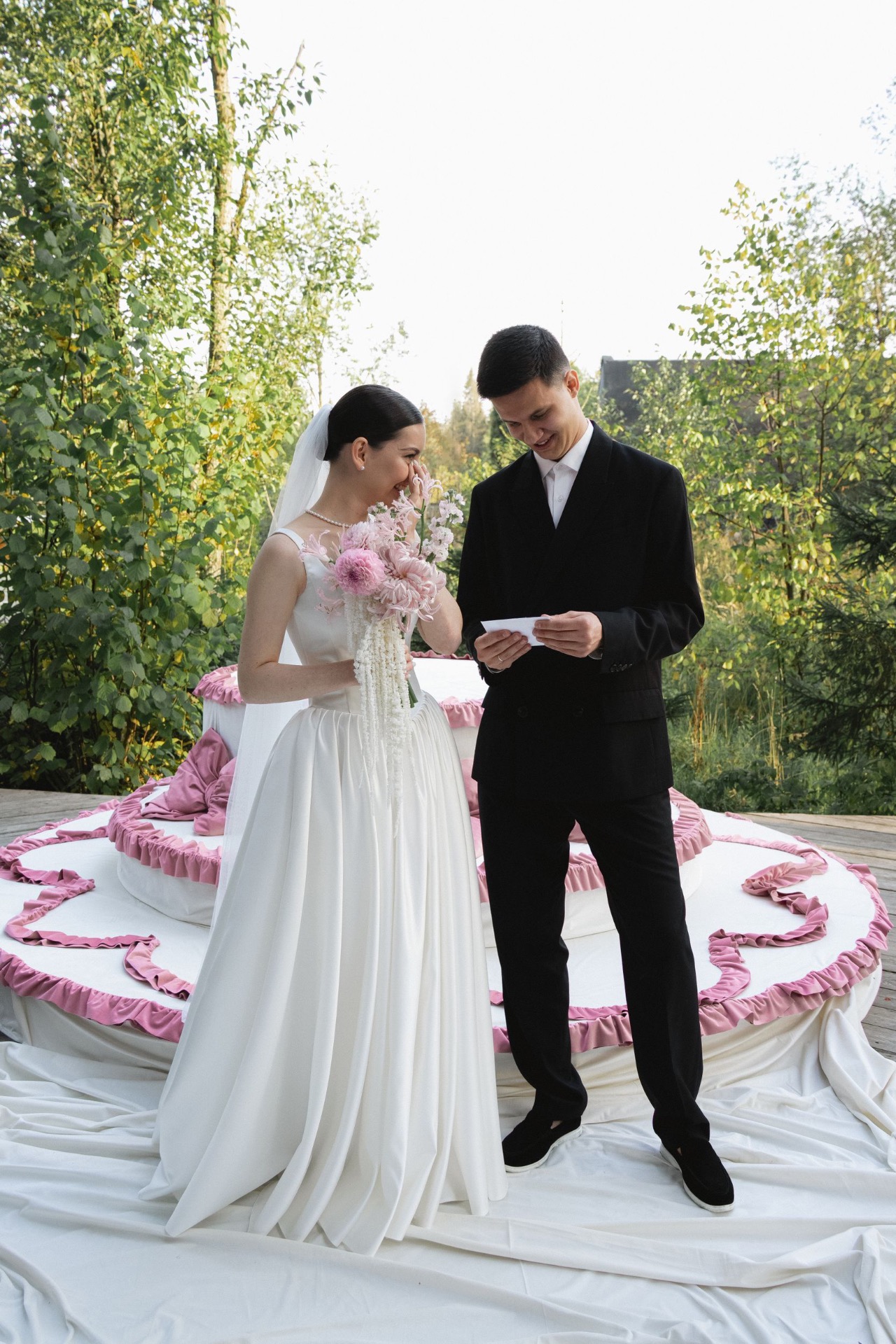 Церемония была невероятной, торт в зоне церемонии смотрелся очень круто. А наши слова друг другу довели всех до слёз. Девочки из агентства вынесли сюрпризом кольца для нас — это было очень неожиданно, смешно и приятно.