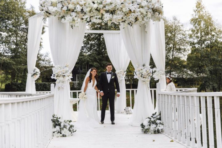 Свадьба была в классическом стиле. Хотелось, чтобы фотокарточки были актуальны во все времена. В декоре прослеживались светлые нежные тона: пепельно-розовый, бежевый, молочный. Невероятно красивая ротонда была украшена цветами и тканью. На столах высокие золотистые стойки с цветами. Выбор свадебного платья был непростым. Точнее, то самое идеальное платье я нашла сразу на первой же примерке. Но, чтобы в этом убедиться на 100%, мне понадобилось объездить десяток свадебных салонов.