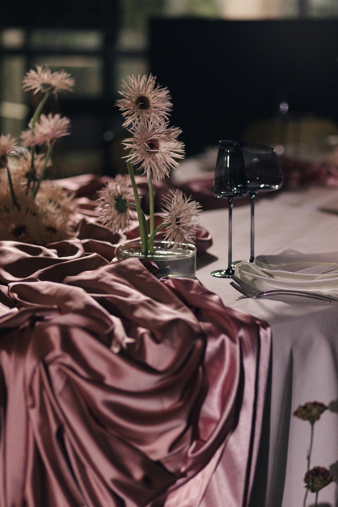 Многие детали рождались прямо в процессе подготовки: бокалы, монохромные герберы, люстры ручной работы, стулья, изготовленные на заказ. Всё это дополняло друг друга, складываясь в единую гармоничную композицию.