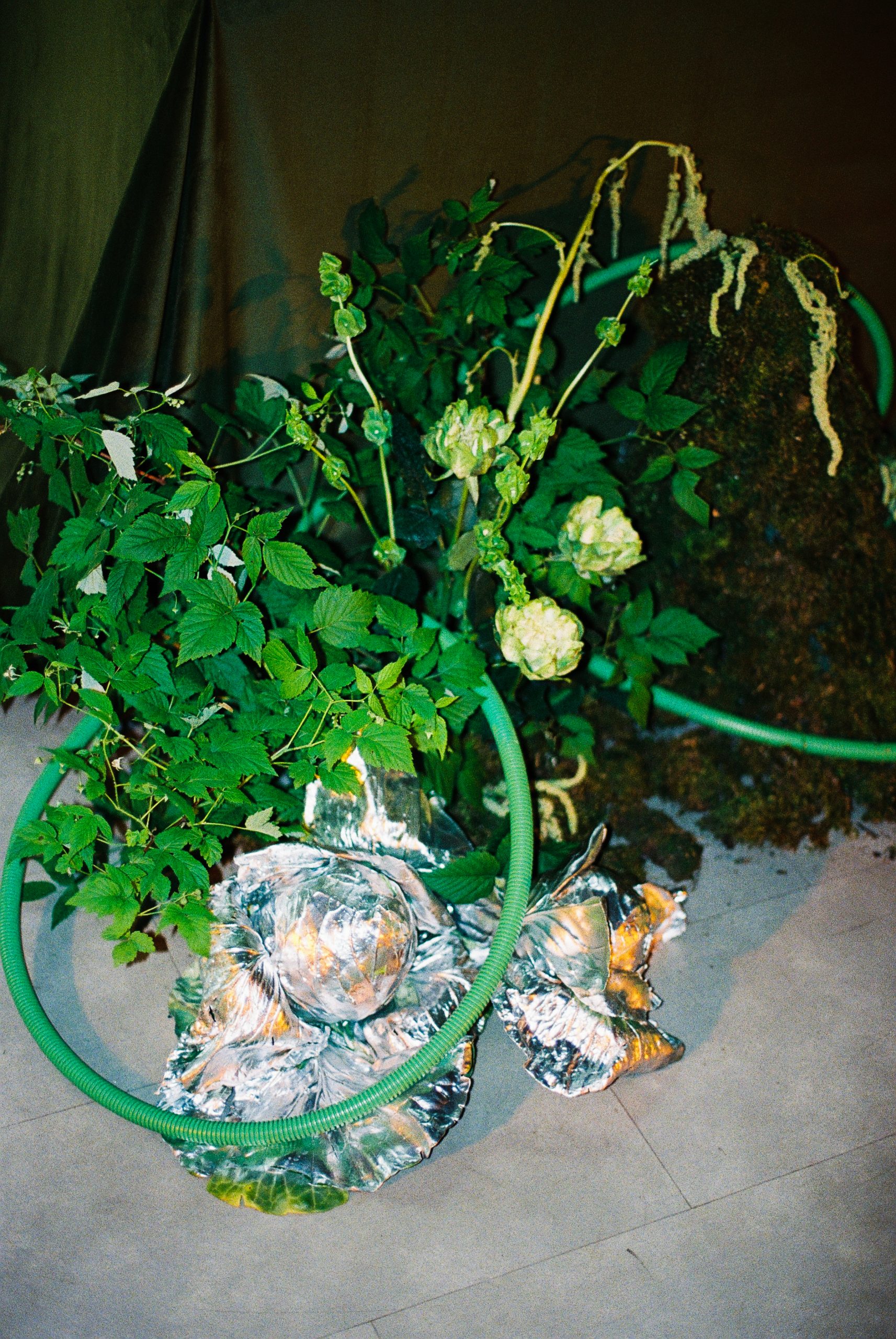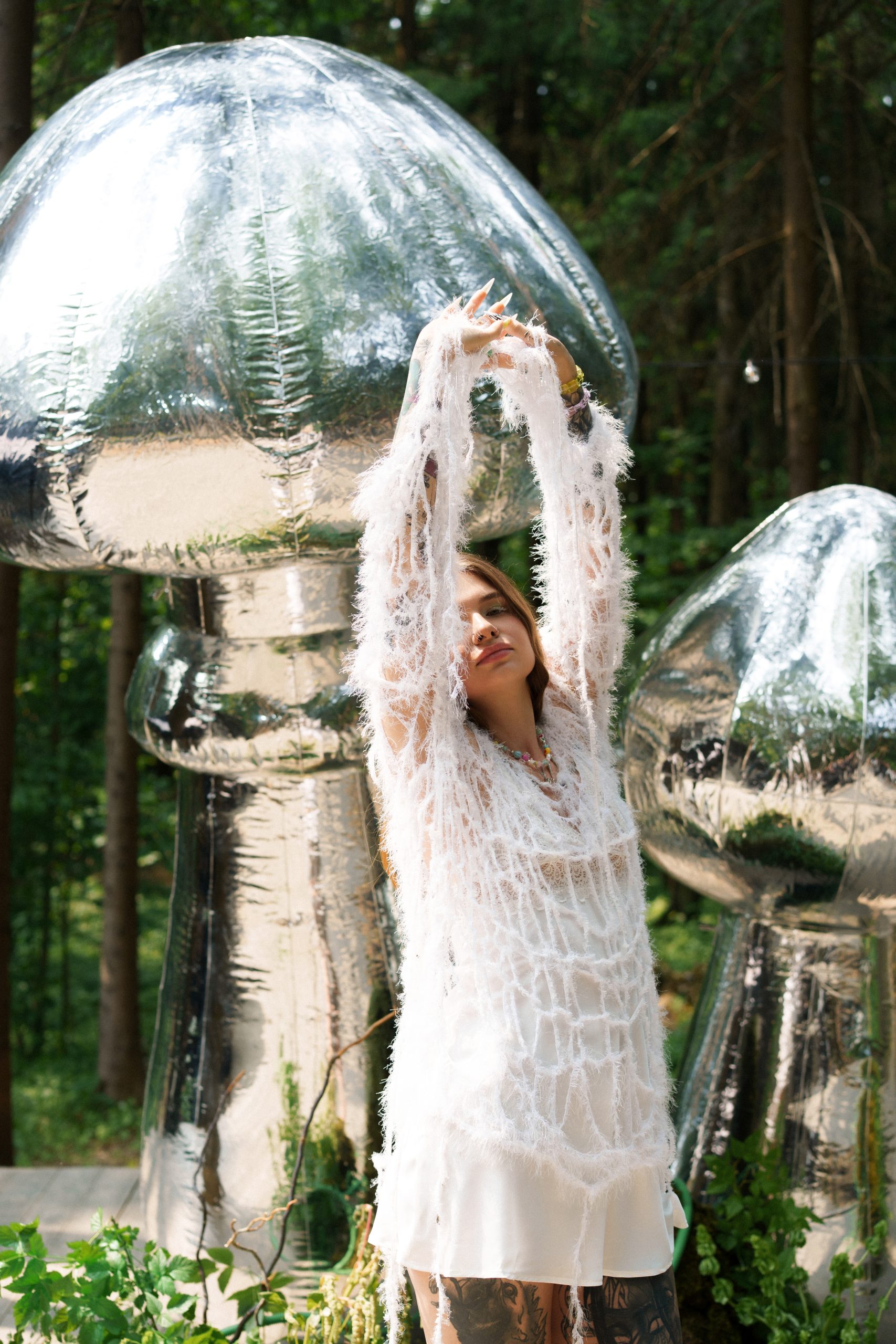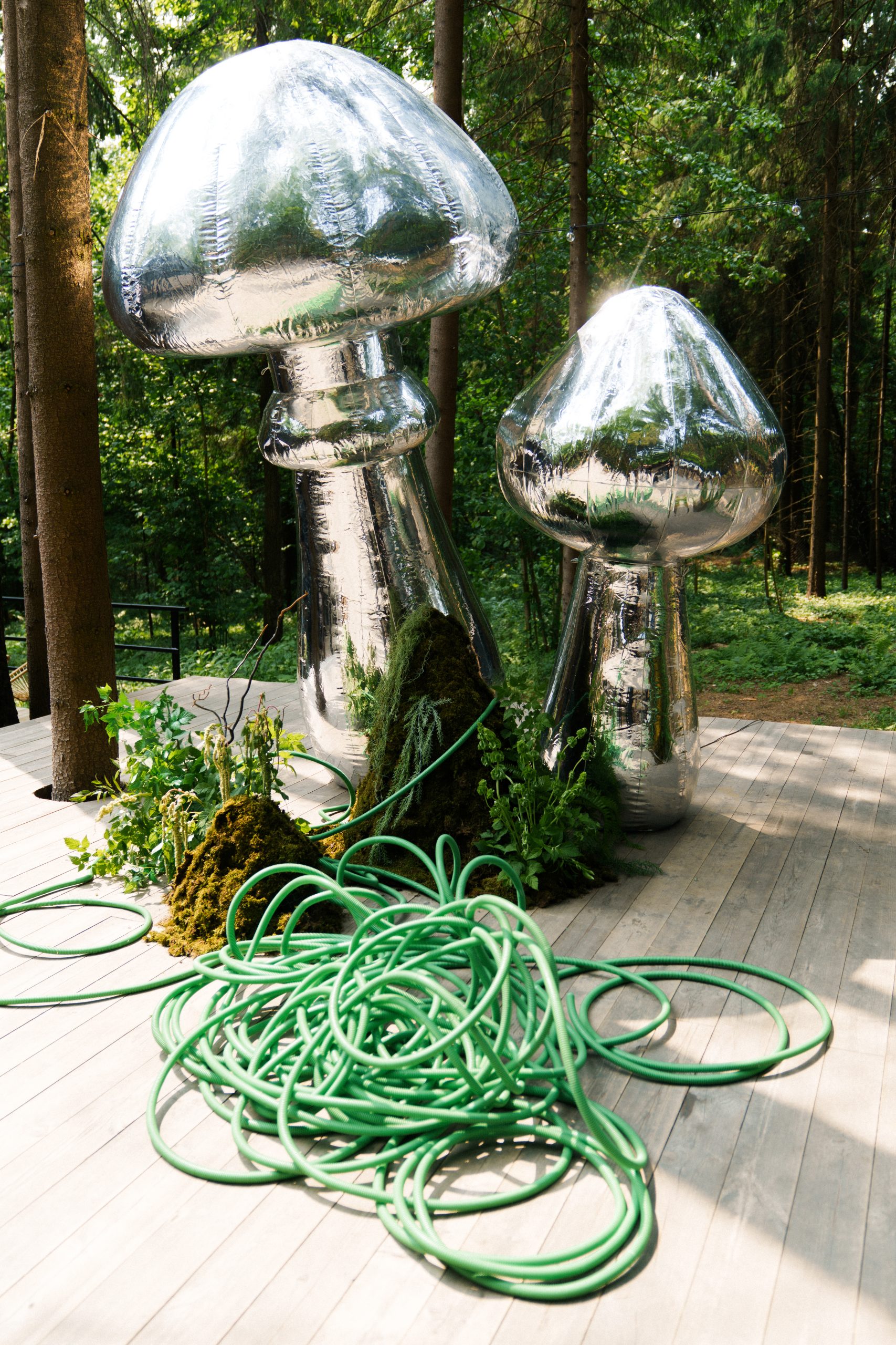 Был нюанс — бюджет на декор был ограничен. И это не минус, а вызов: как сделать вау-эффект, не уходя в расходы на кастом? Ответ пришёл случайно, мы нашли в аренду уже готовые арт-объекты: серебристые грибы, стилизованные, с глянцевой поверхностью. Они выглядели настолько инопланетно и мощно, что сразу стало ясно — это оно.