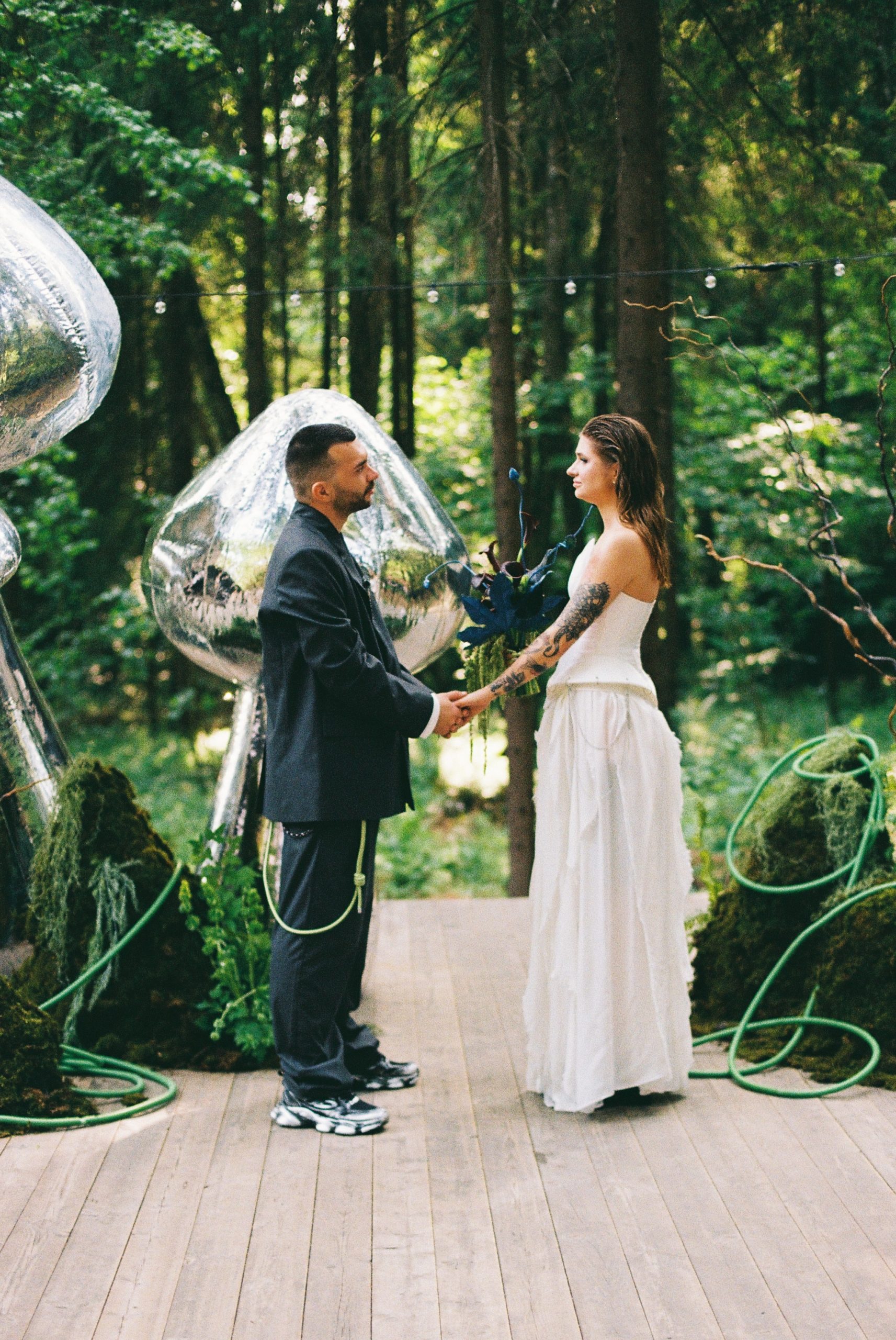 Ира мечтала о свадьбе в лесу, и это было не просто пожелание локации, а чувство, которое хотелось передать. Мы начали раскручивать эту идею, так родилась формулировка: Дикая туса в диком лесу. Звучит неожиданно? Да! Но зато как точно отражает их энергетику: немного хаоса, немного свободы, немного магии.