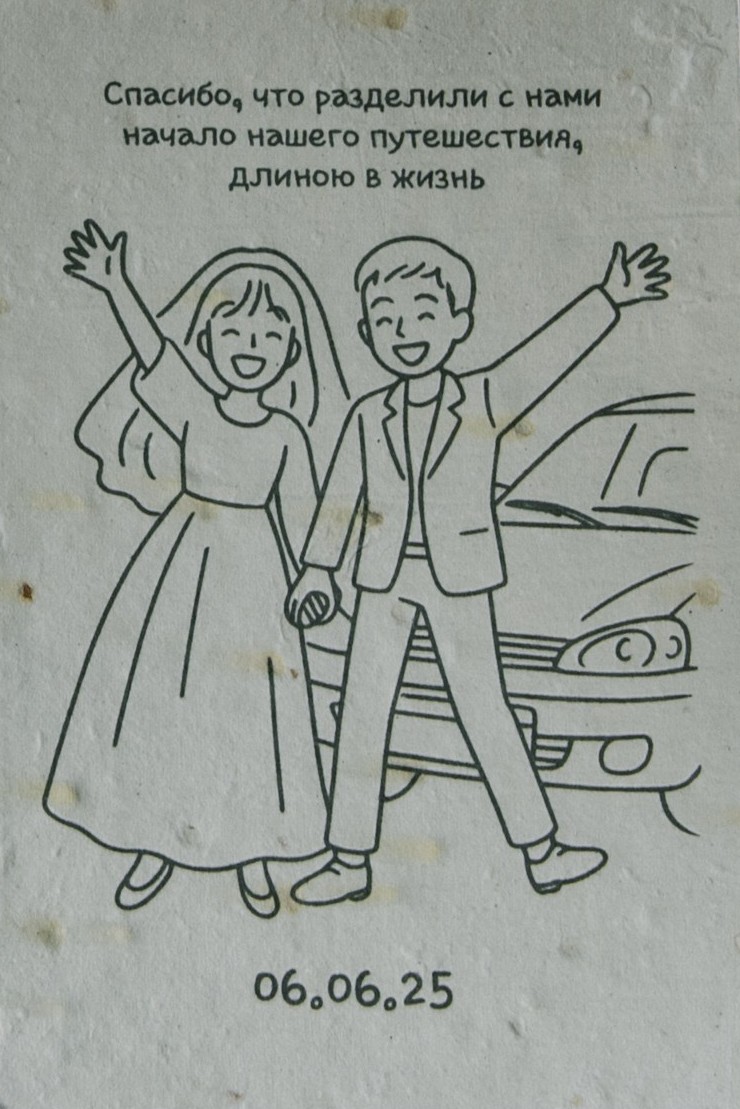 Чтобы подчеркнуть свою любовь к путешествиям, ребята решили изобразить на открытках себя и свою любимую машину. Получился эдакий символ семьи, которая теперь движется в одном направлении. С реализацией дизайна Алине помог Chat GPT. Переработанная бумага показалась паре слишком нейтральной, и тогда возникла идея добавить в неё семена.