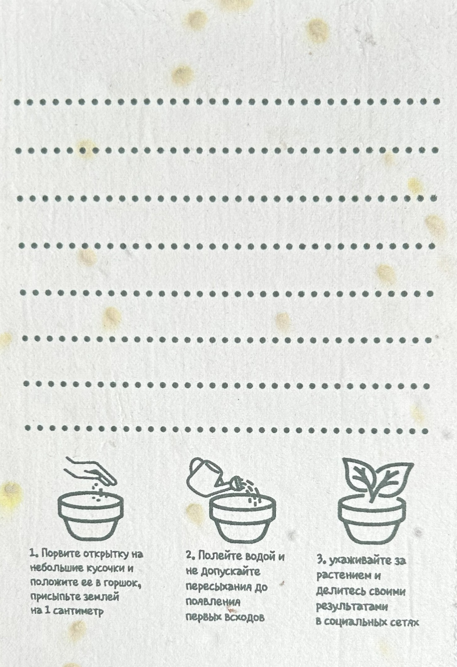 После свадьбы гости смогут буквально посадить открытку в землю и прорастить микрозелень. Так приглашение стало метафорой новой жизни и новой семьи. На обратной стороне ребята своей рукой написали тёплые пожелания для каждого гостя.