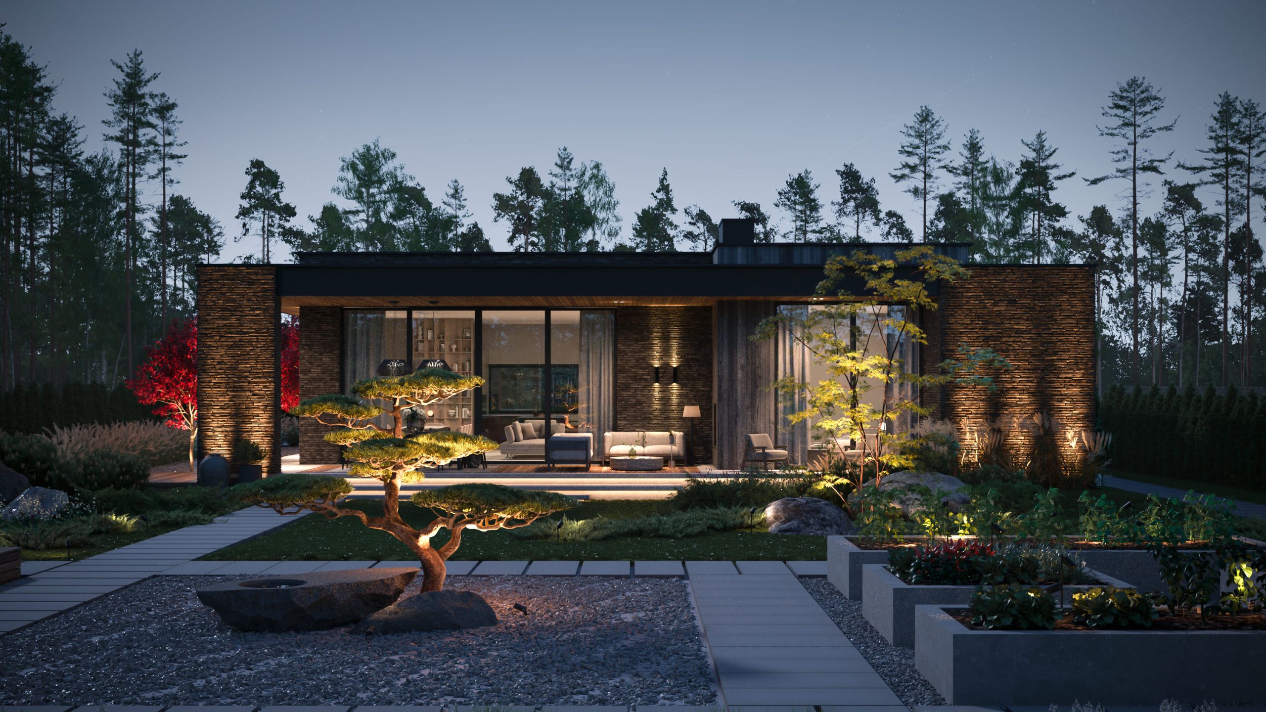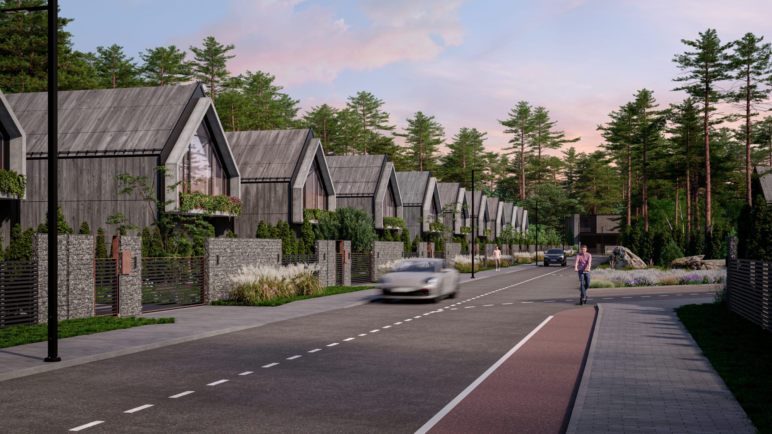 - Единая экосистема. Не только дома, но и общие зоны, въездные группы, ограждения – всё подчинено единому дизайну.