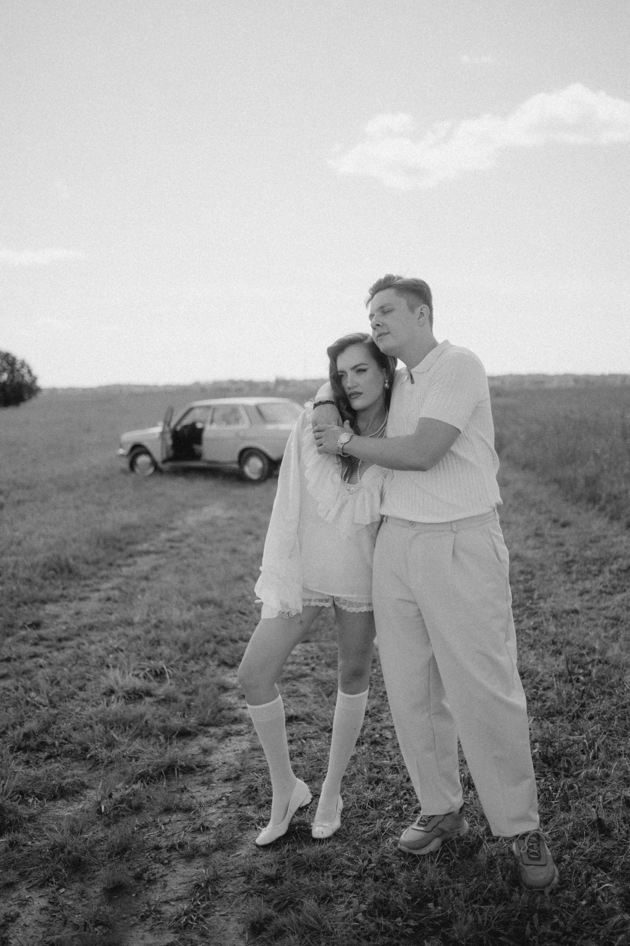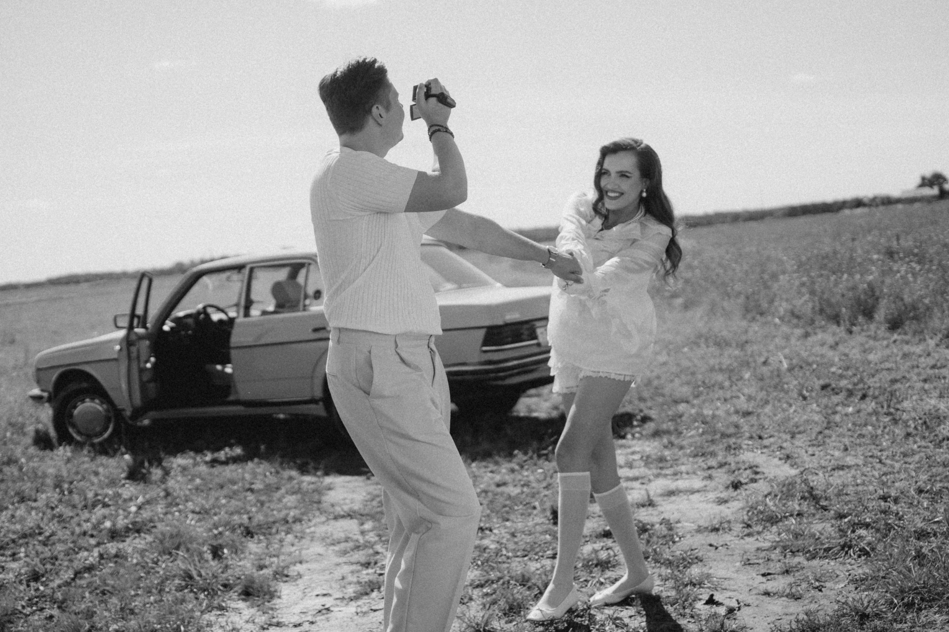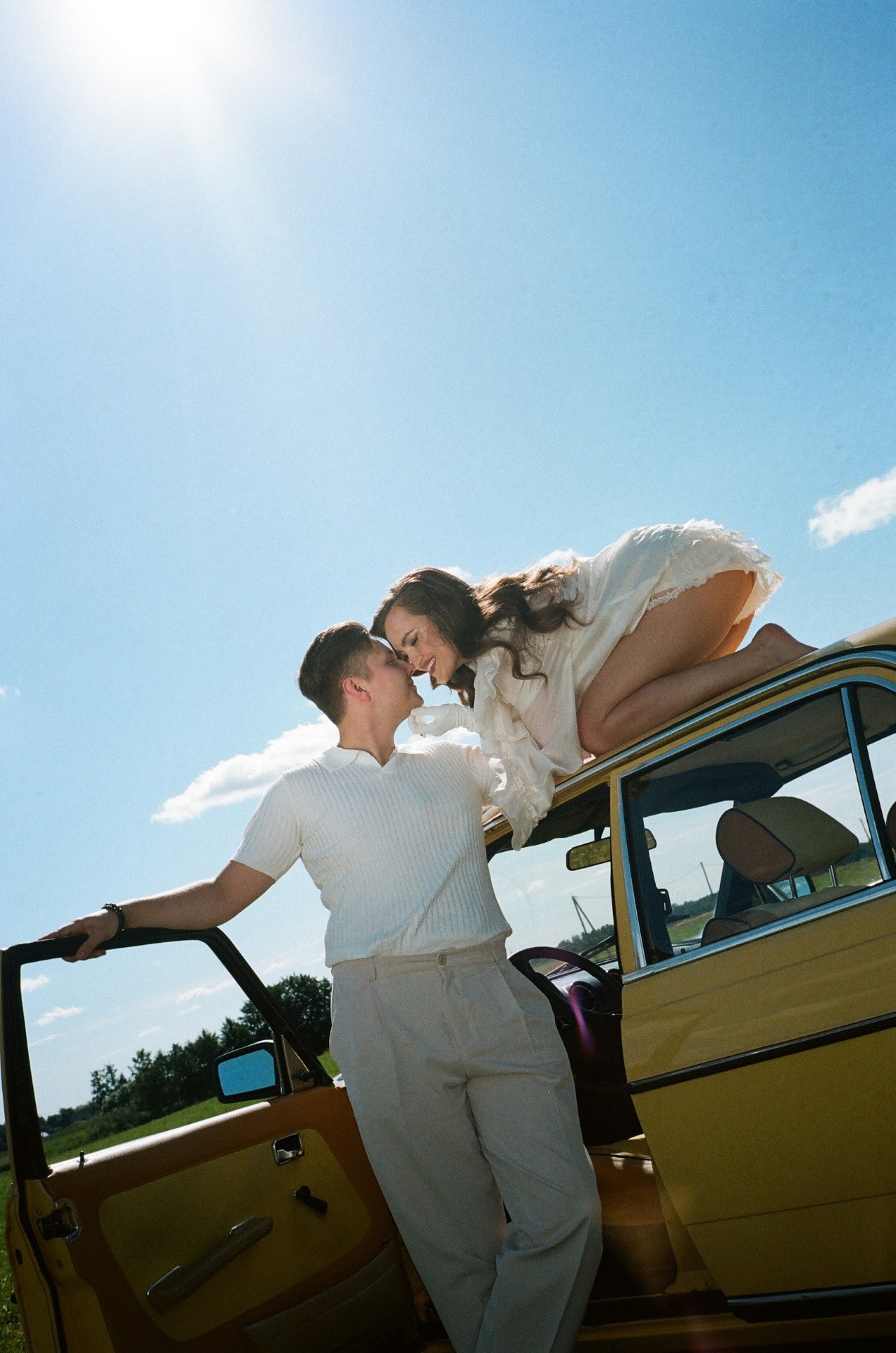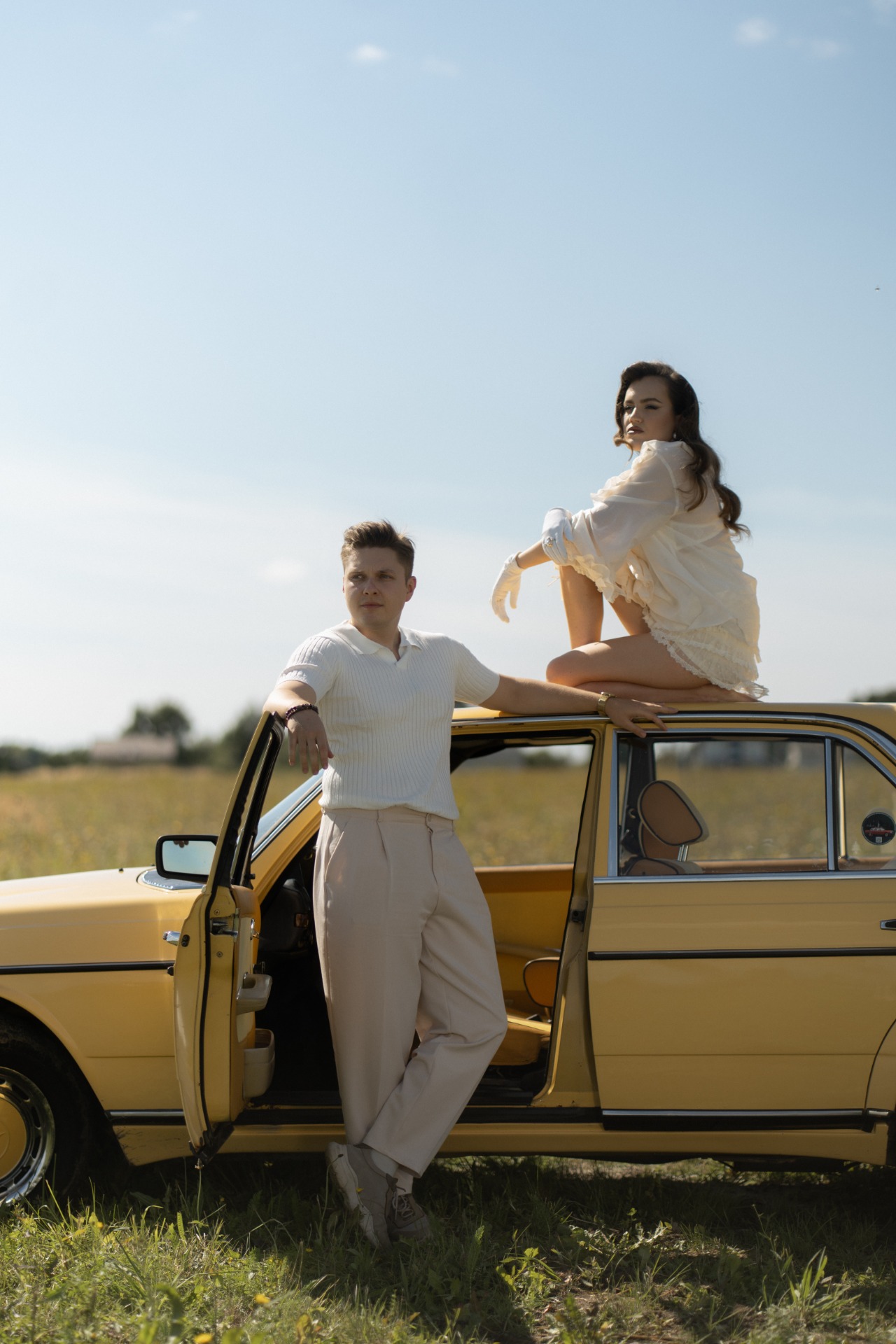 Для утренней фотосессии, когда мы поехали на жёлтом ретро-автомобиле в поле, я будто собиралась на богемный завтрак, но забыла платье и успела лишь прикрыть верх, а внизу оставила слегка эротичные открытые ножки.