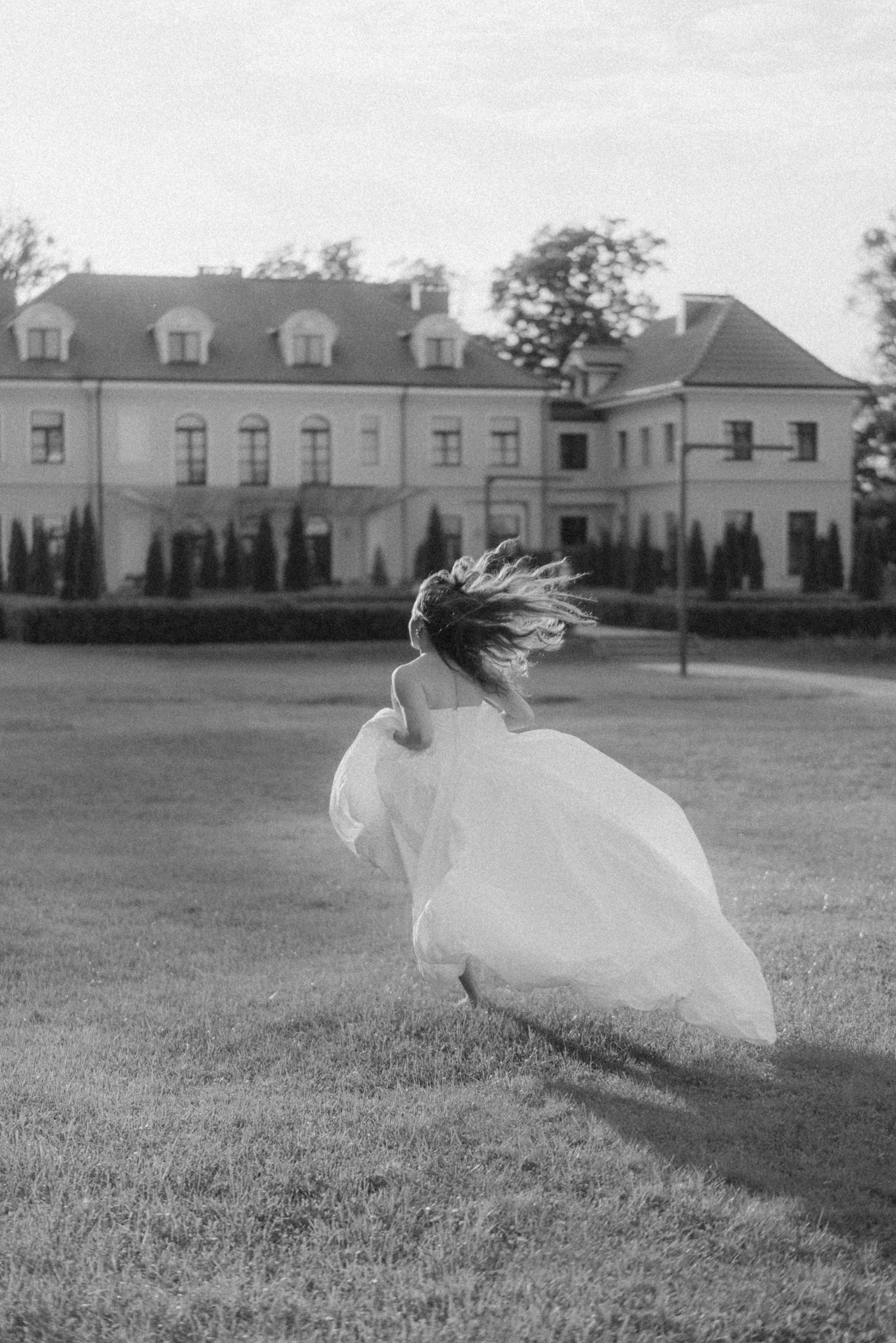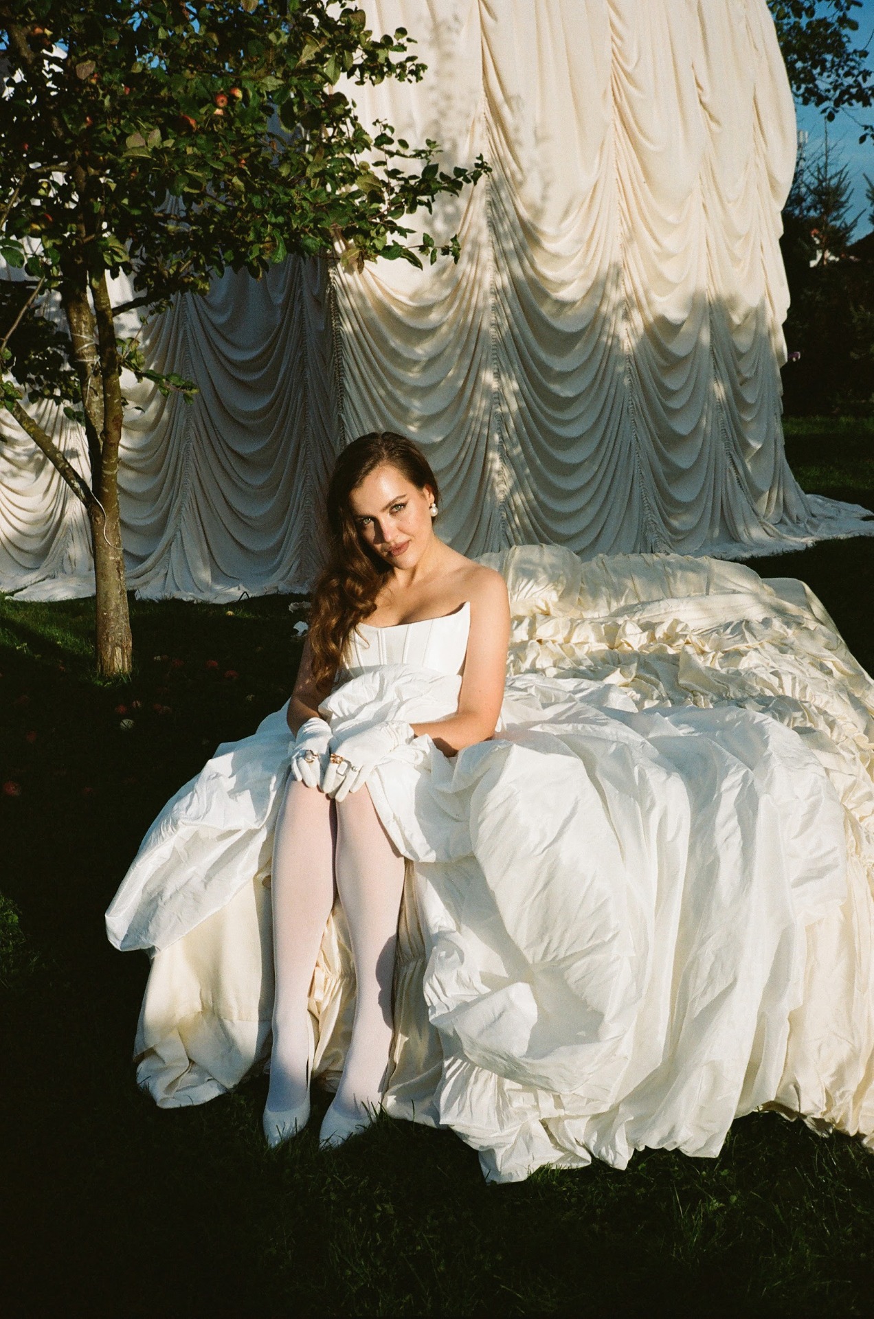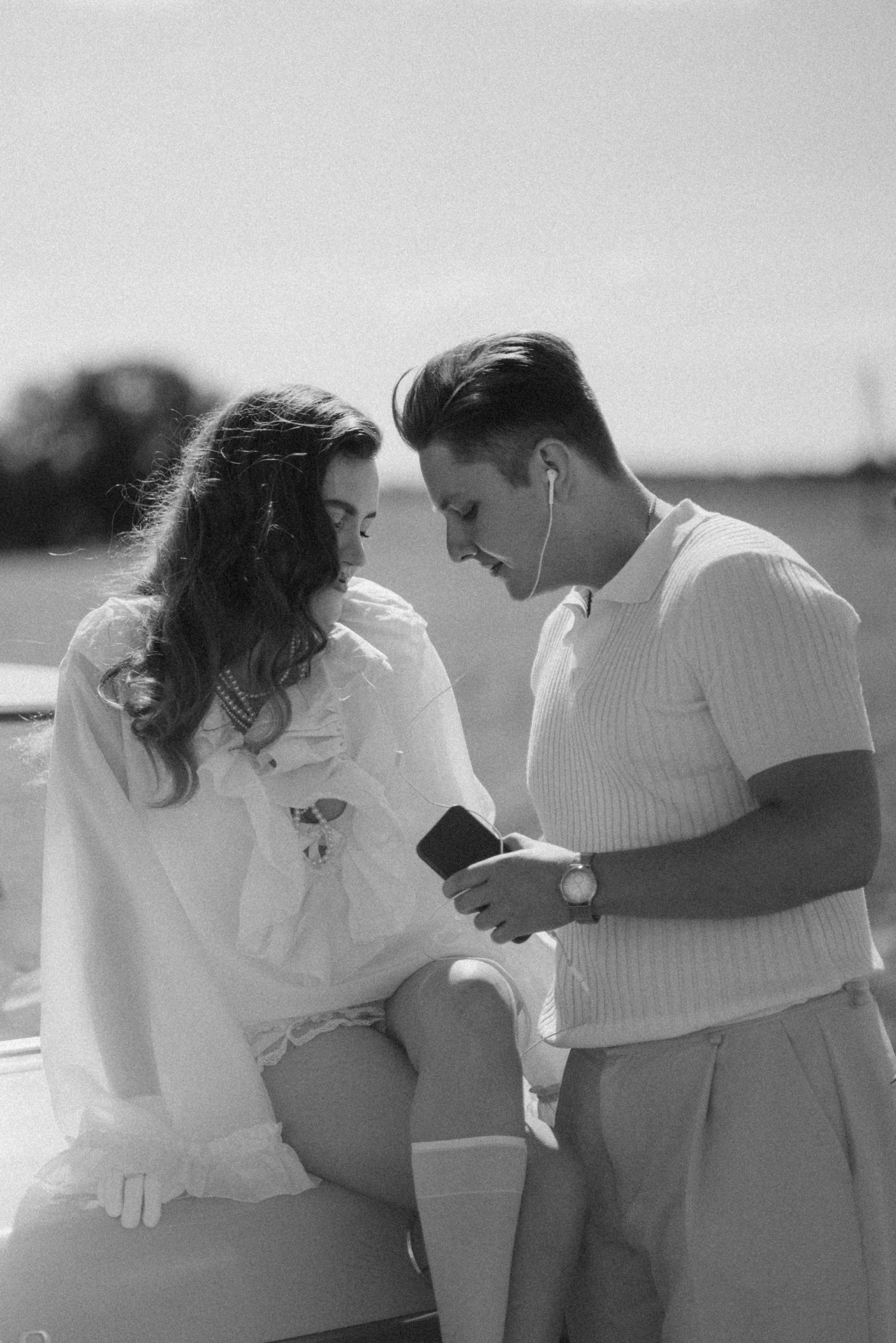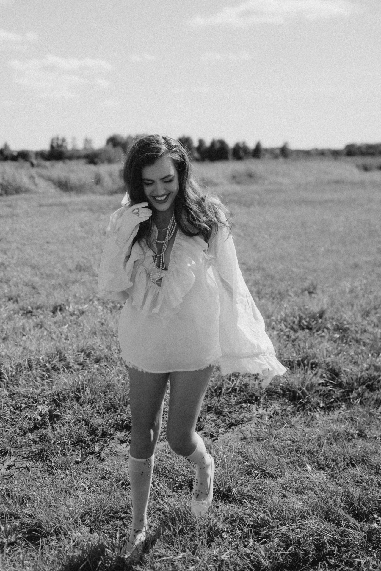 Для утренней фотосессии, когда мы поехали на жёлтом ретро-автомобиле в поле, я будто собиралась на богемный завтрак, но забыла платье и успела лишь прикрыть верх, а внизу оставила слегка эротичные открытые ножки.