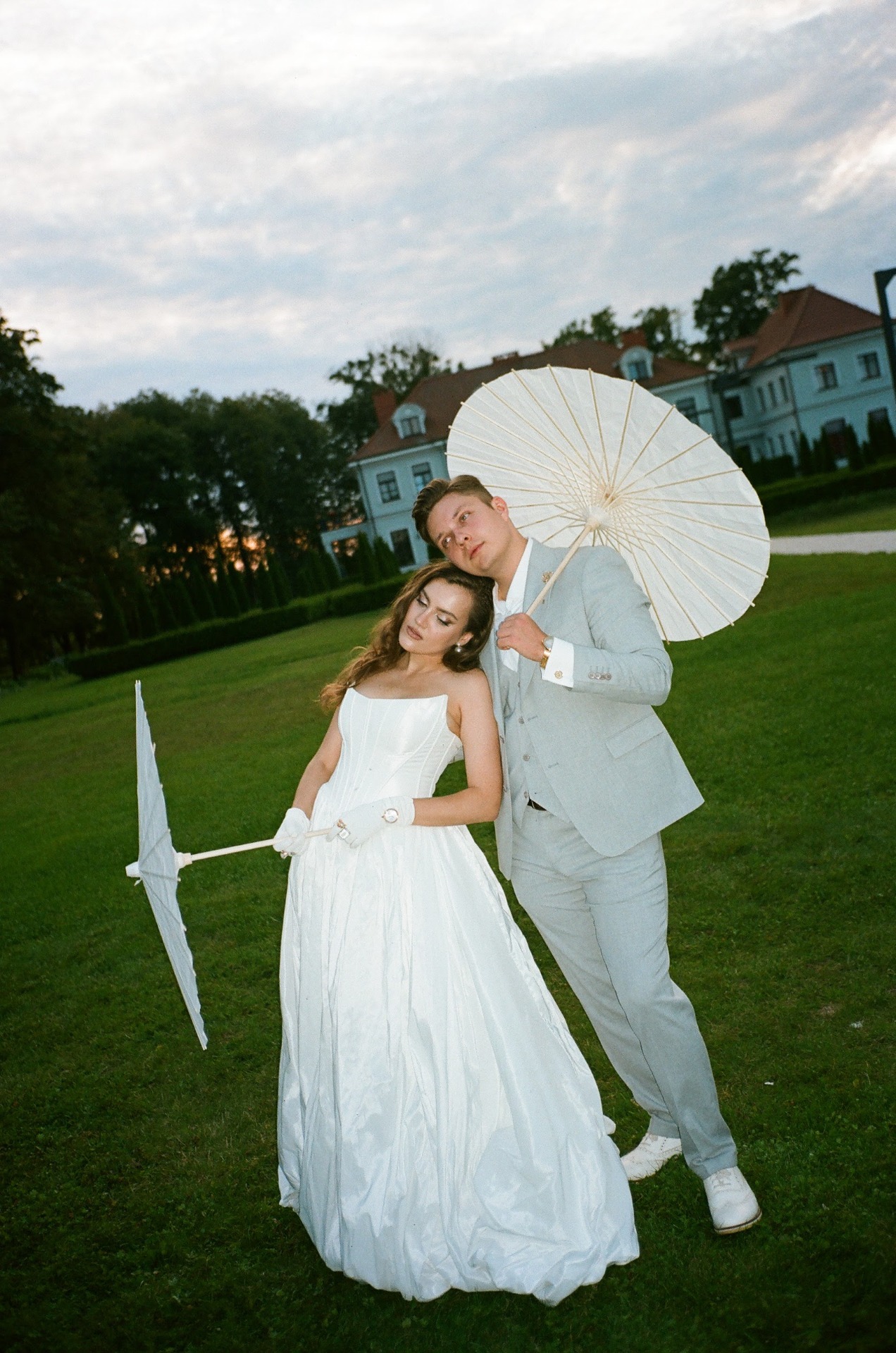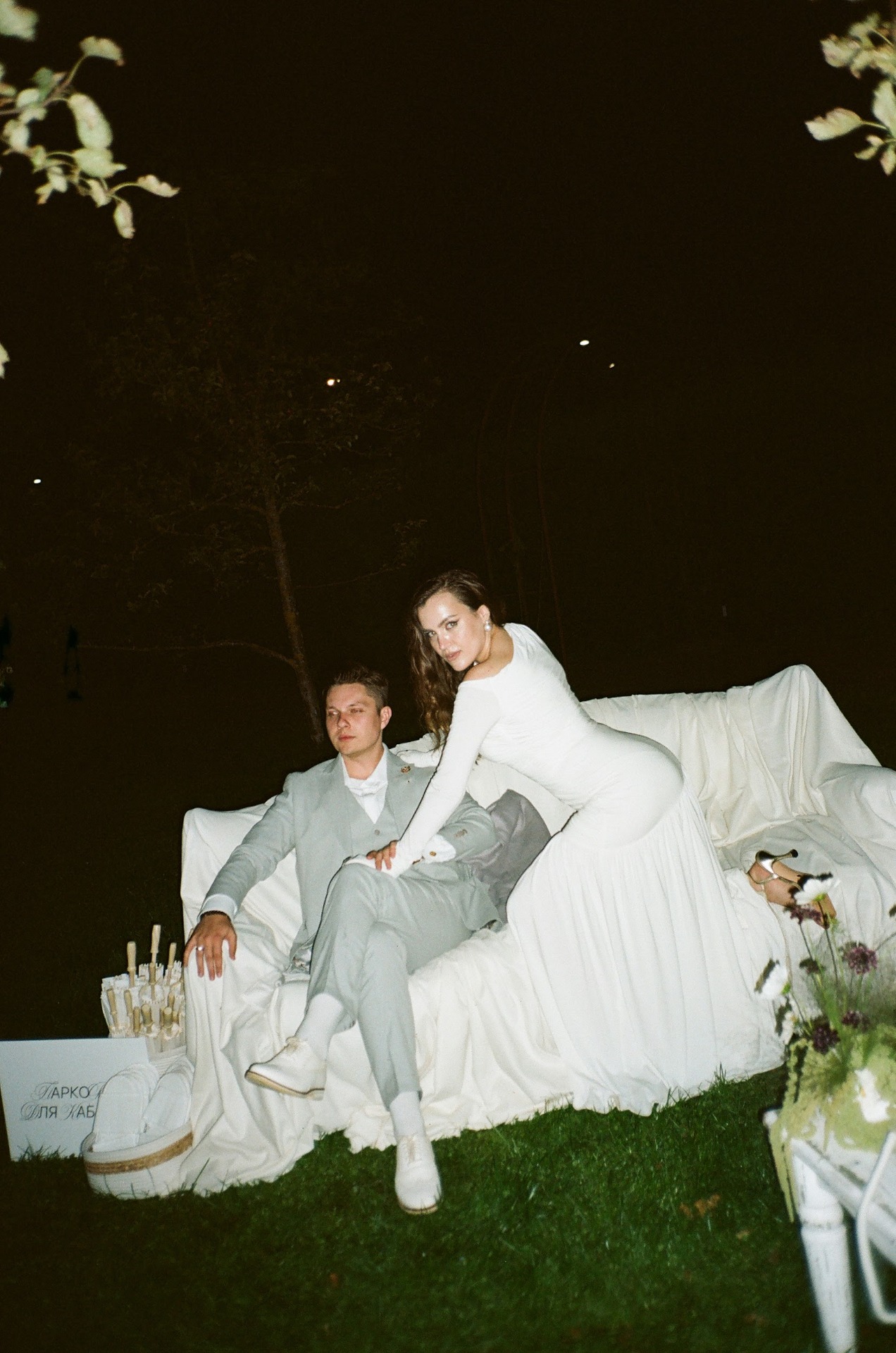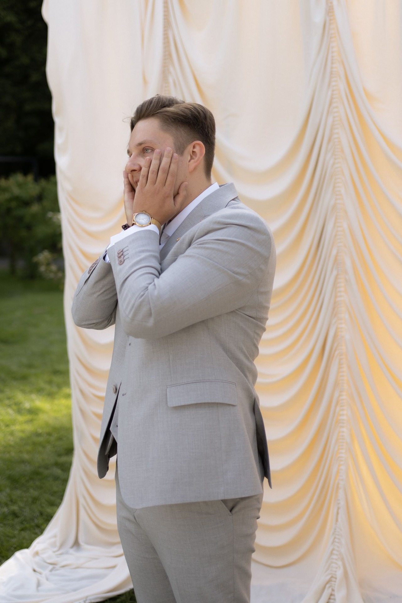 У Вити было два образа. Для съёмки с лёгким налётом тихой роскоши: поло, светлые брюки и льняной пиджак. Для праздника — более классический: светло-серый костюм, жилет и оксфорды, без галстука.