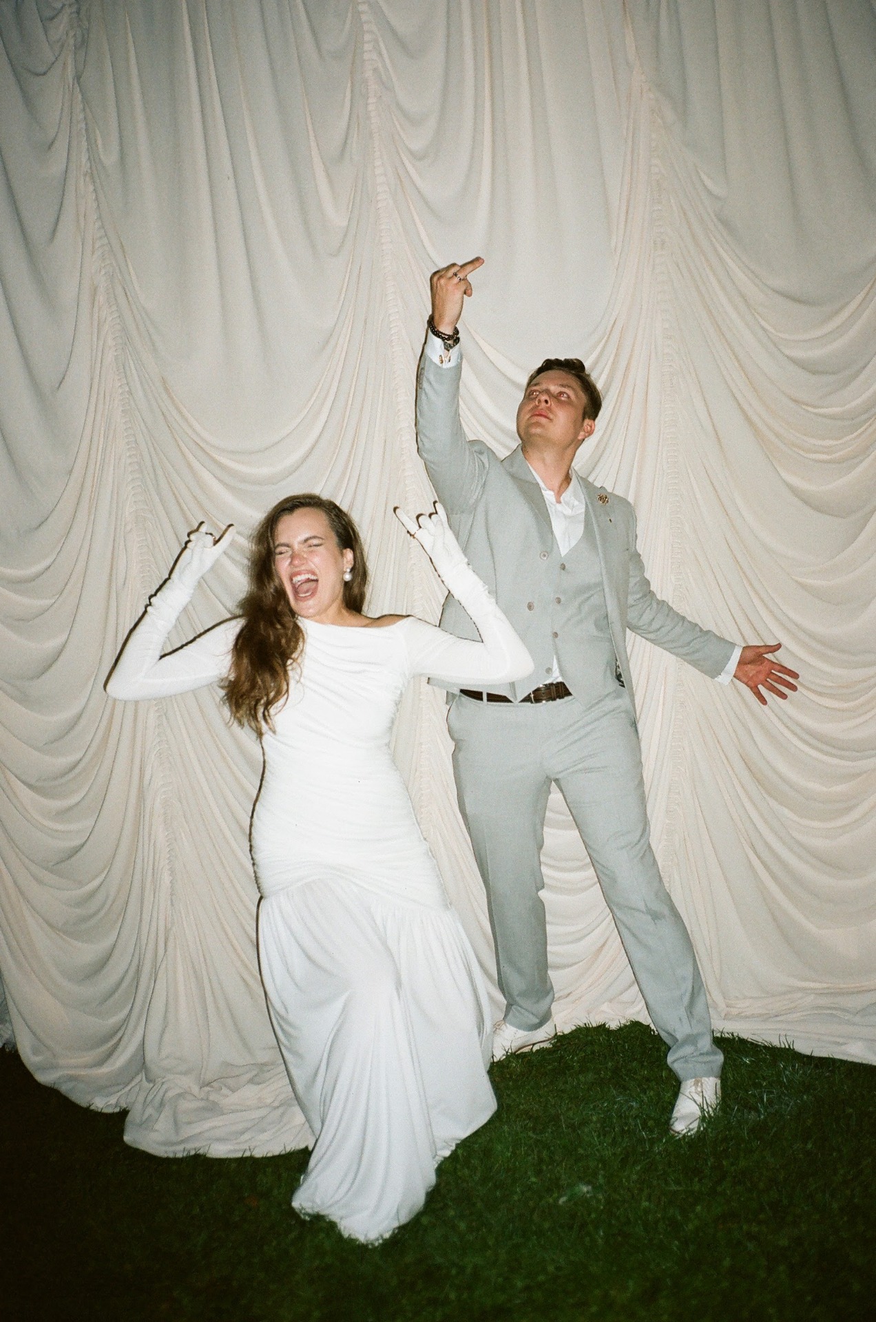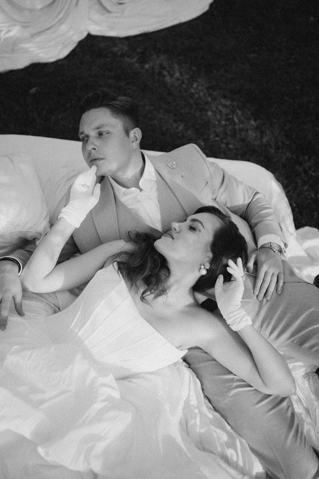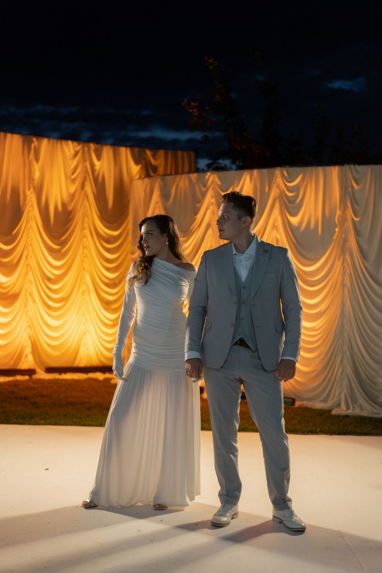 У Вити было два образа. Для съёмки с лёгким налётом тихой роскоши: поло, светлые брюки и льняной пиджак. Для праздника — более классический: светло-серый костюм, жилет и оксфорды, без галстука.