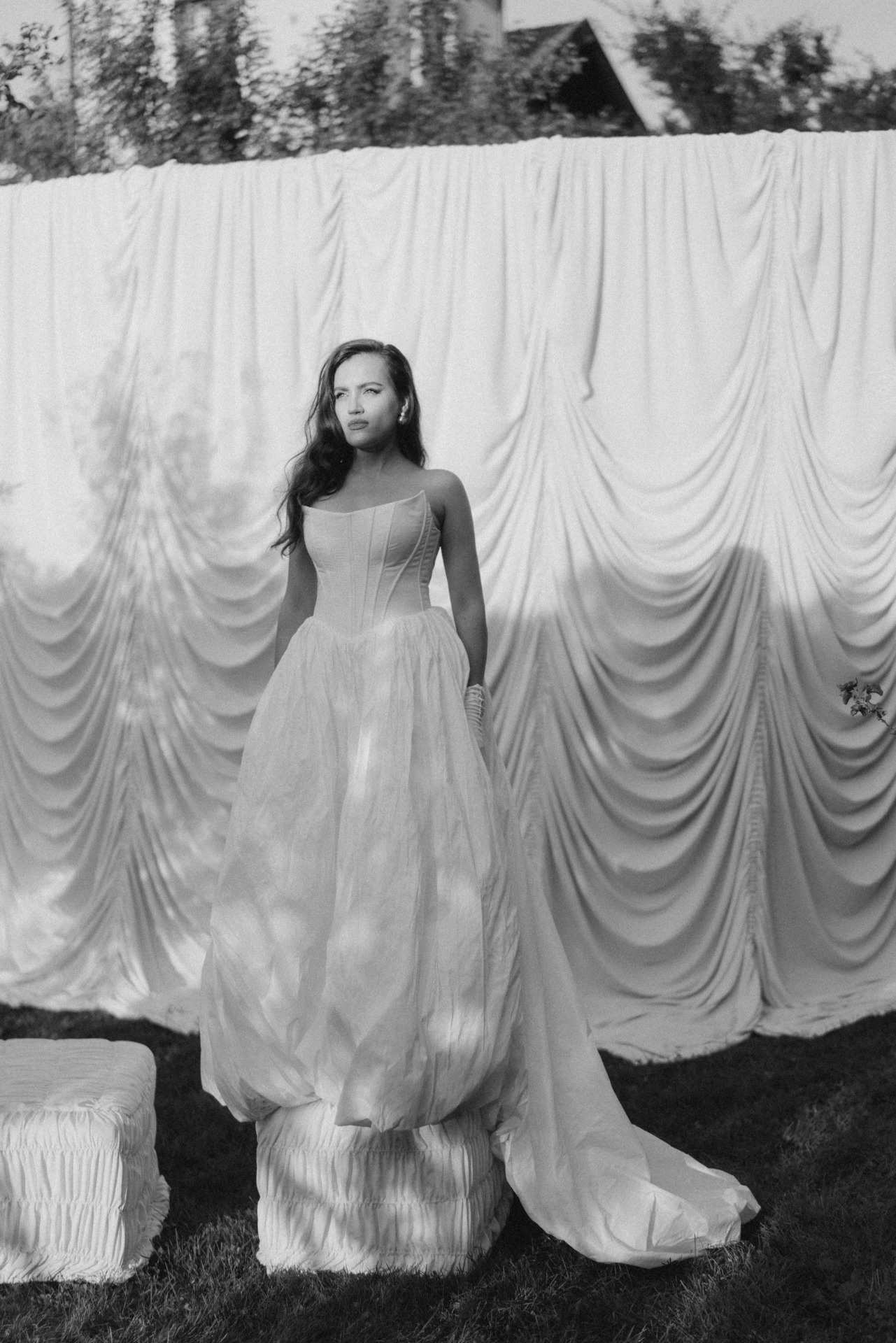 Для церемонии мне хотелось сделать классический образ с каплей дерзости, поэтому платье было выполнено из тафты с мятым эффектом, чтобы в день свадьбы точно не переживать, что платье может где-то помяться. Верх платья мы меняли в свадебном ателье бренда и сделали мне острые углы корсета с архитектурными строгими швами, очень хотелось сочетать геометрию с диснеевским образом принцессы. Куплено оно было в салоне-ателье Vintage.