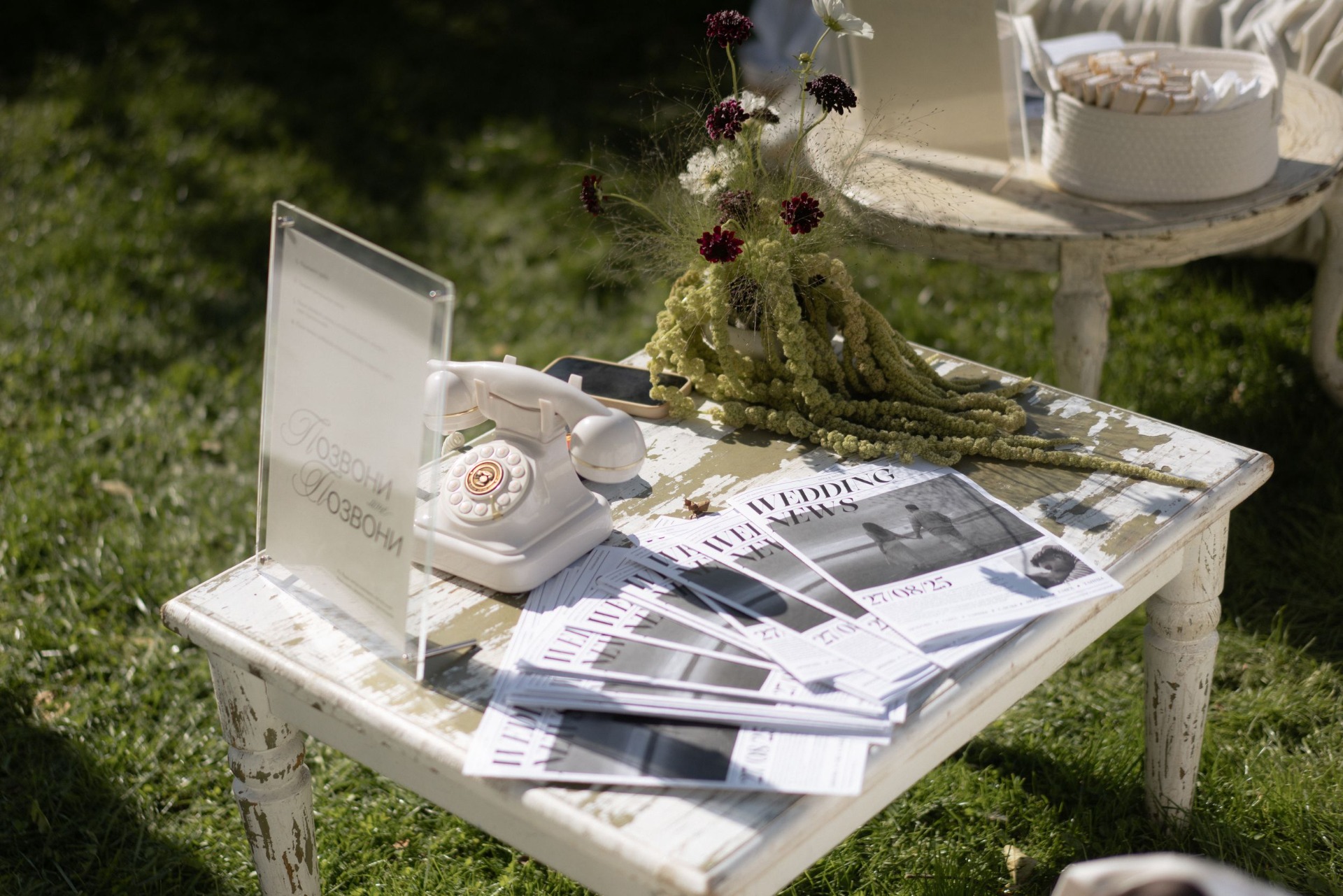 Весь вечер на празднике работал ретро-телефон, в который гости наговаривали пожелания, а также была установлена кровать-фотозона, на которой можно было прыгать.