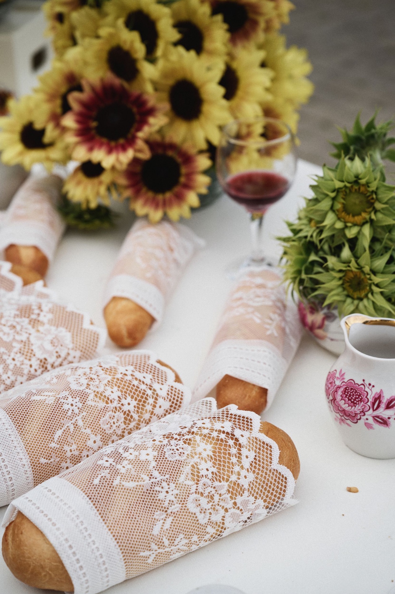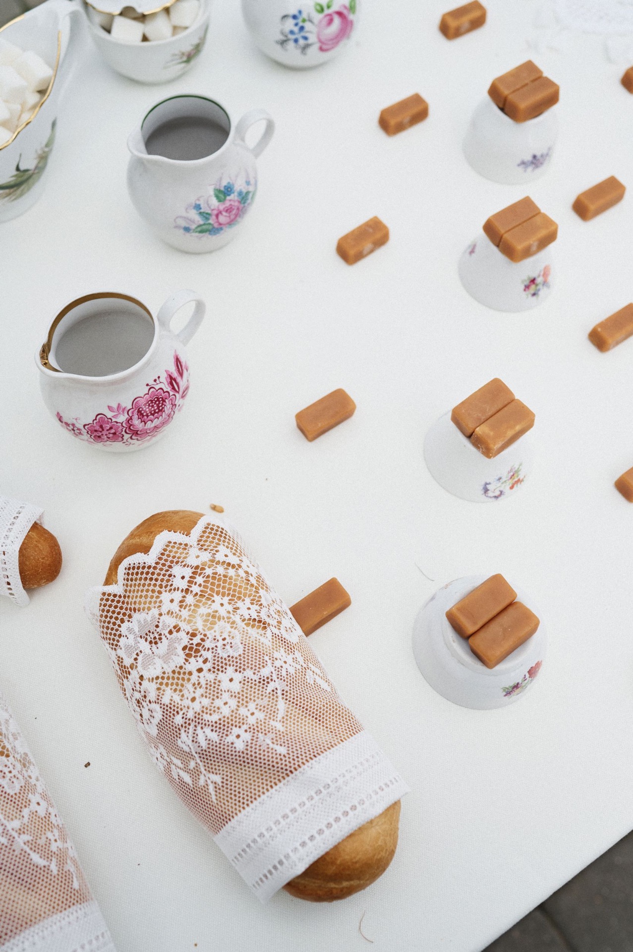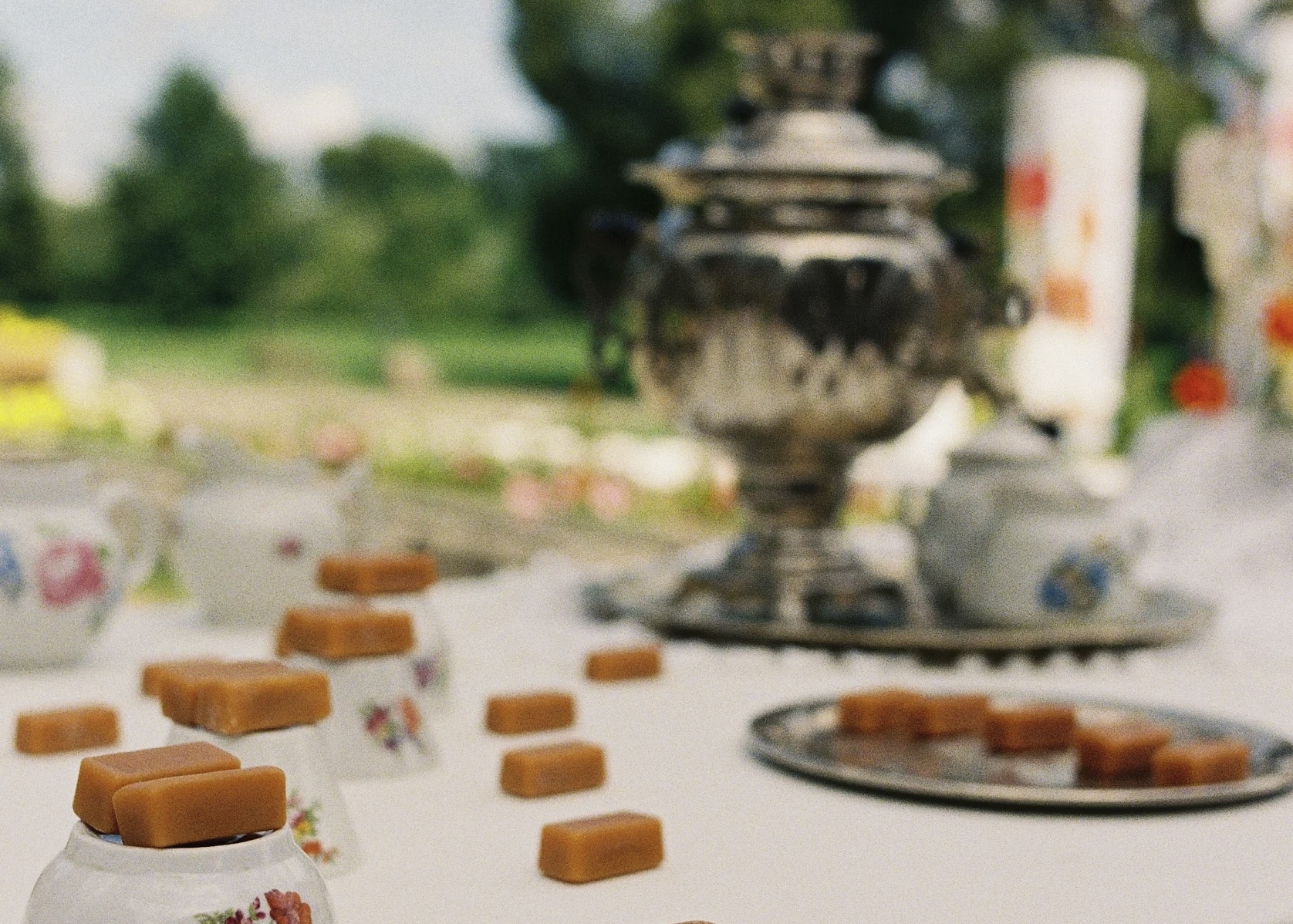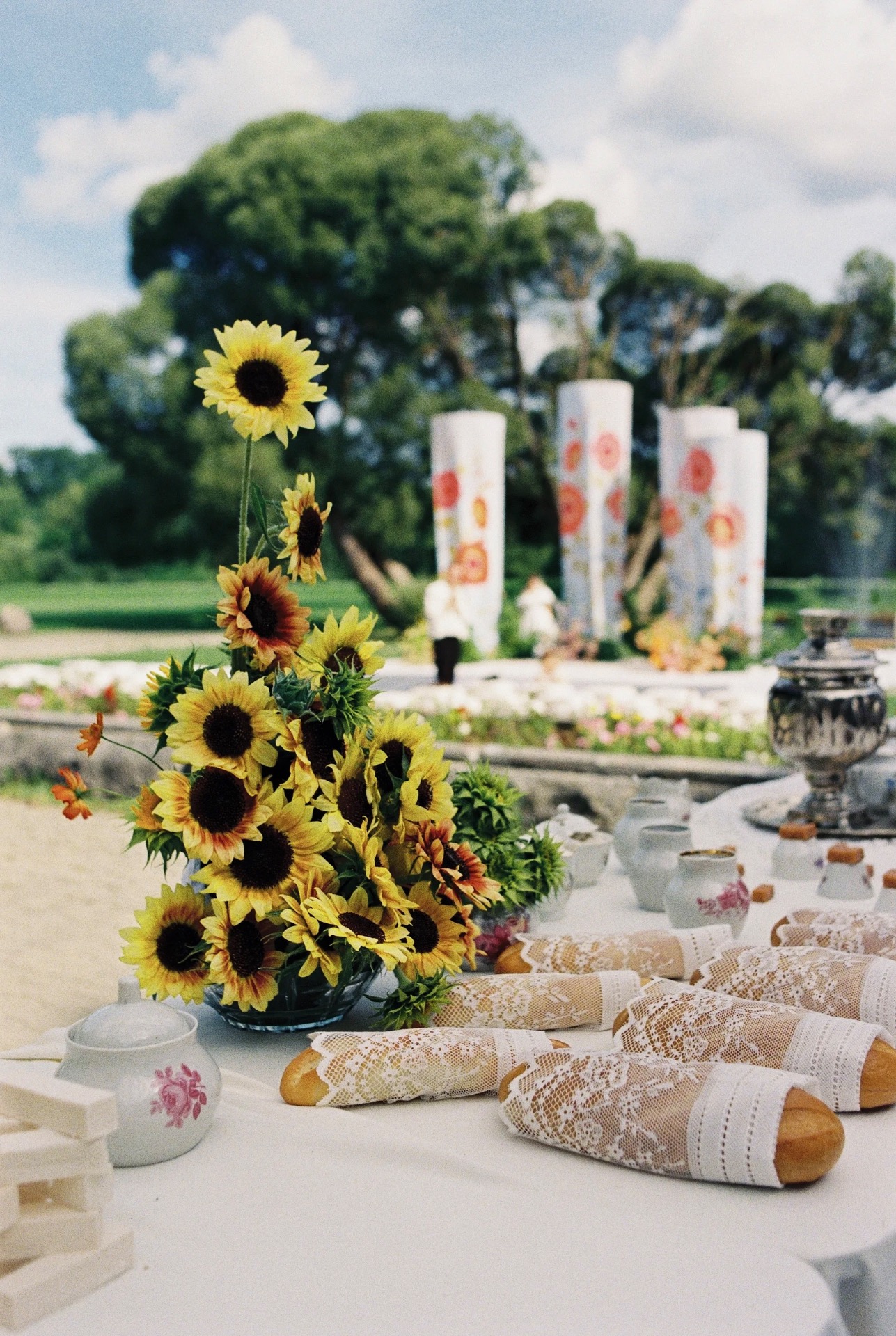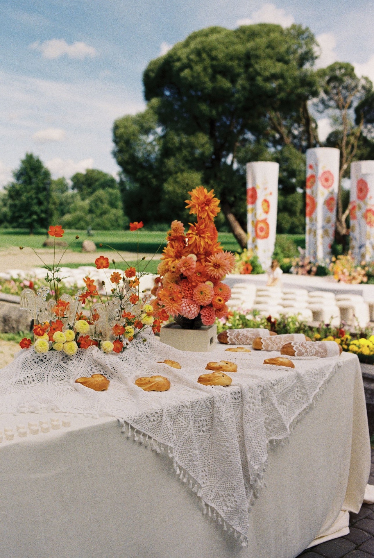 Декор строился вокруг ощущения «тёплого прошлого» — часть деталей собиралась на блошиных рынках, часть создавалась специально для свадьбы. В зоне церемонии гостей встречал сет-дизайн с винтажной посудой и конфетами «Коровка», хрусталём и кружевом, полевыми цветами и матрёшками, деревянными лошадками и петушками на палочках. Каждая деталь создавала уют и атмосферу, в которой хотелось остаться подольше.