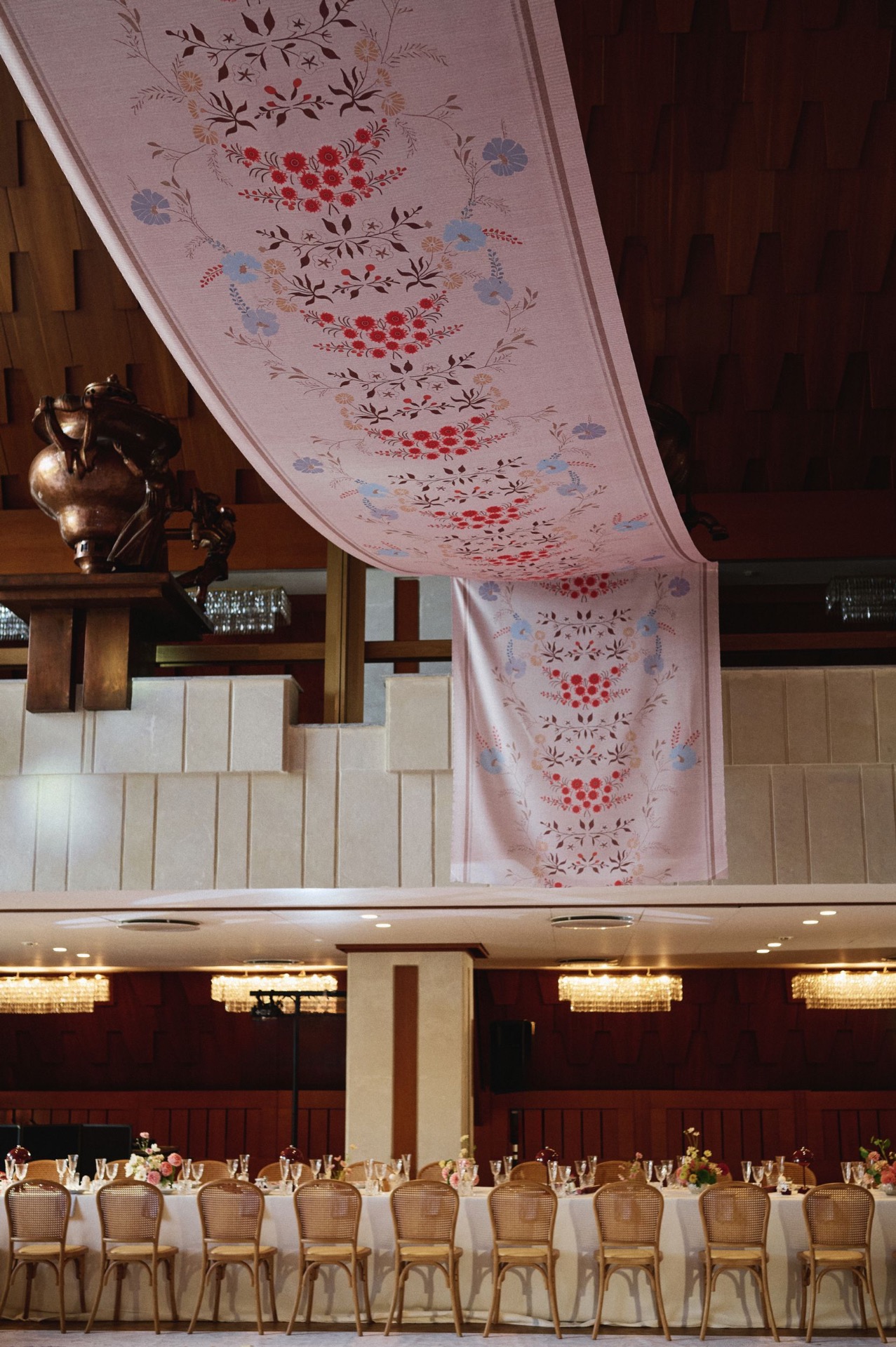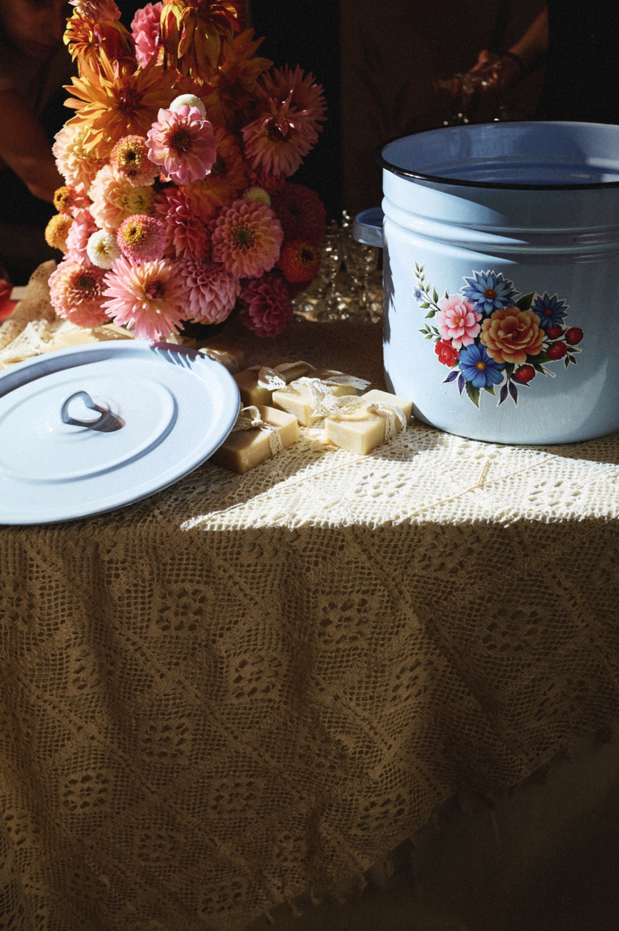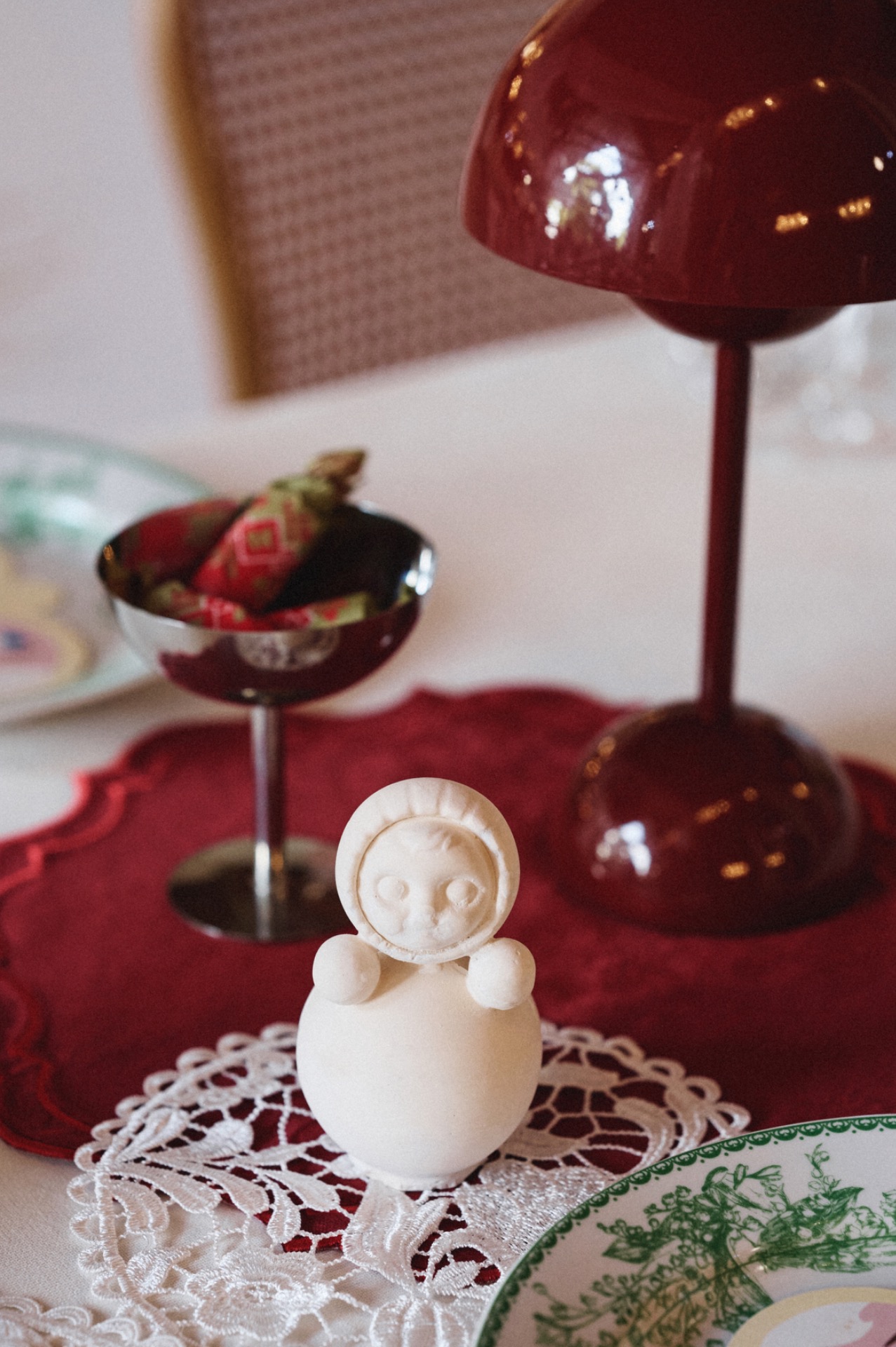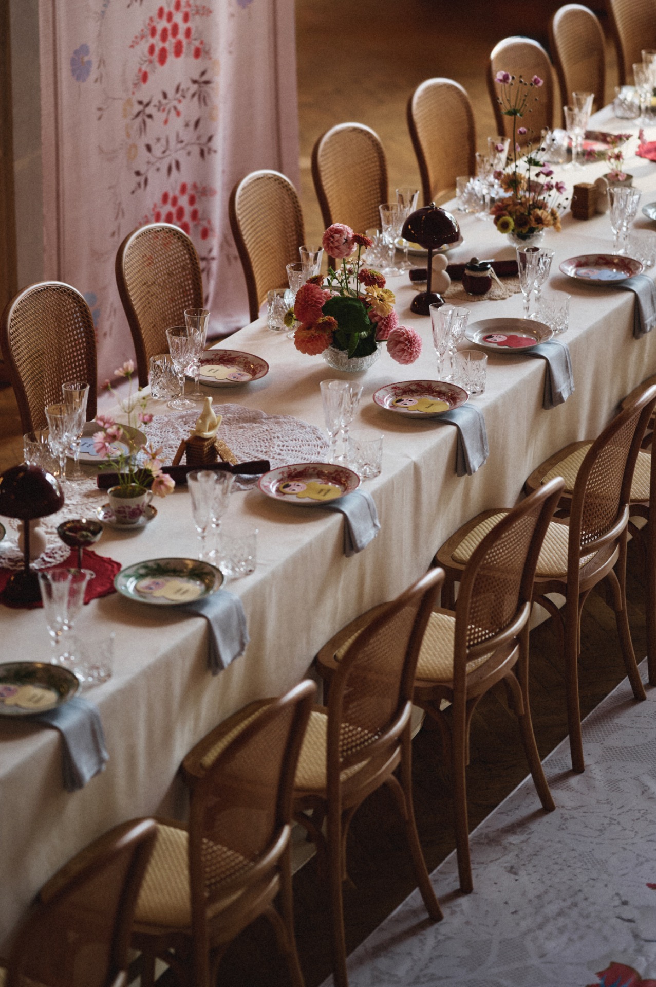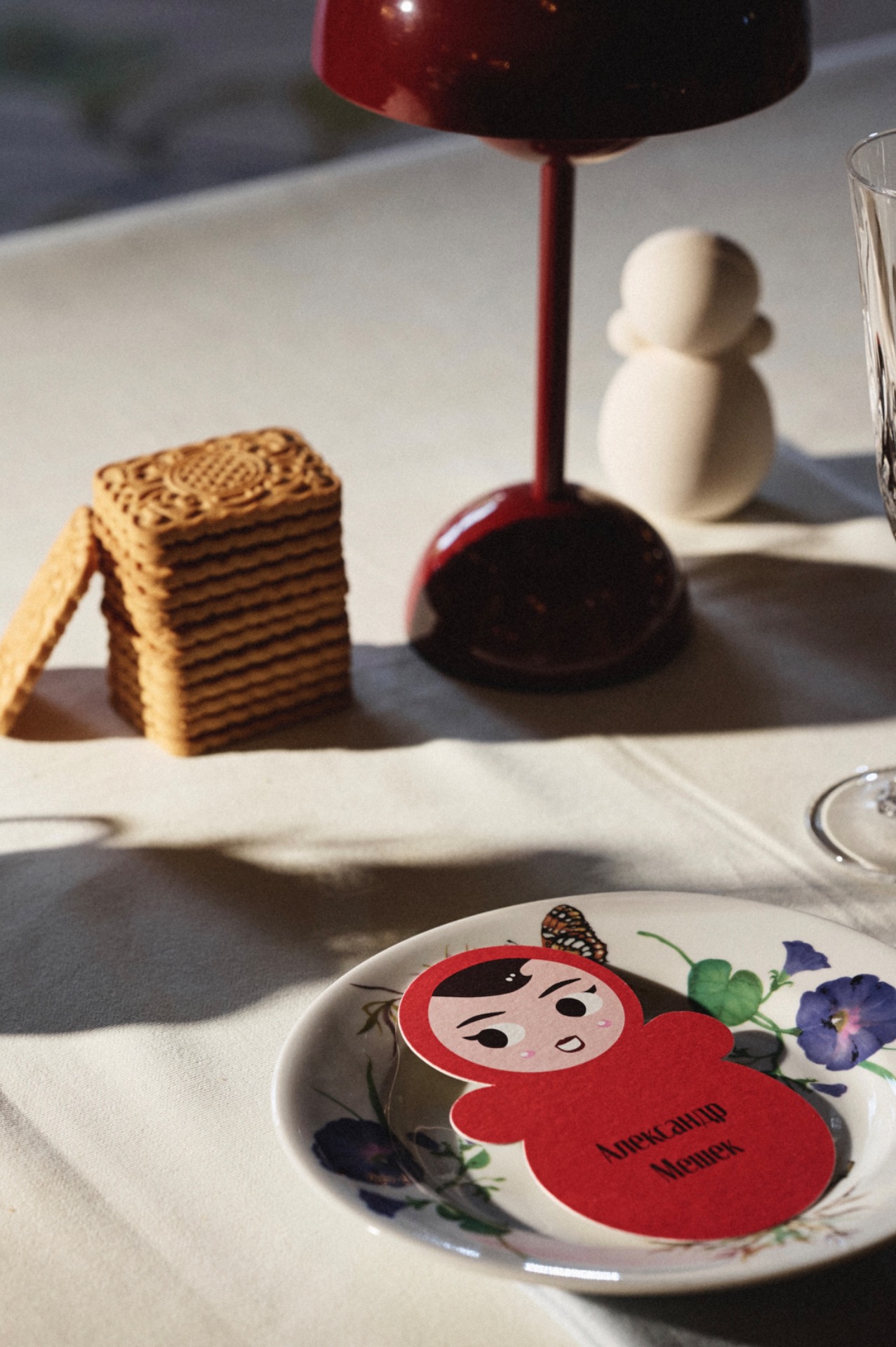 Особую роль на свадьбе сыграла посуда. Женя с Лёшей — большие любители советской эстетики, а у Жени эта любовь ещё и семейная: её бабушка собирала редкие сервизы, и многие из них хранят историю нескольких поколений. Поэтому пара решила самостоятельно собрать коллекцию тарелок для свадьбы, подбирая их в винтажных магазинах. Каждая тарелка стала подарком гостю, а под ней была спрятана памятная надпись с тёплыми словами.