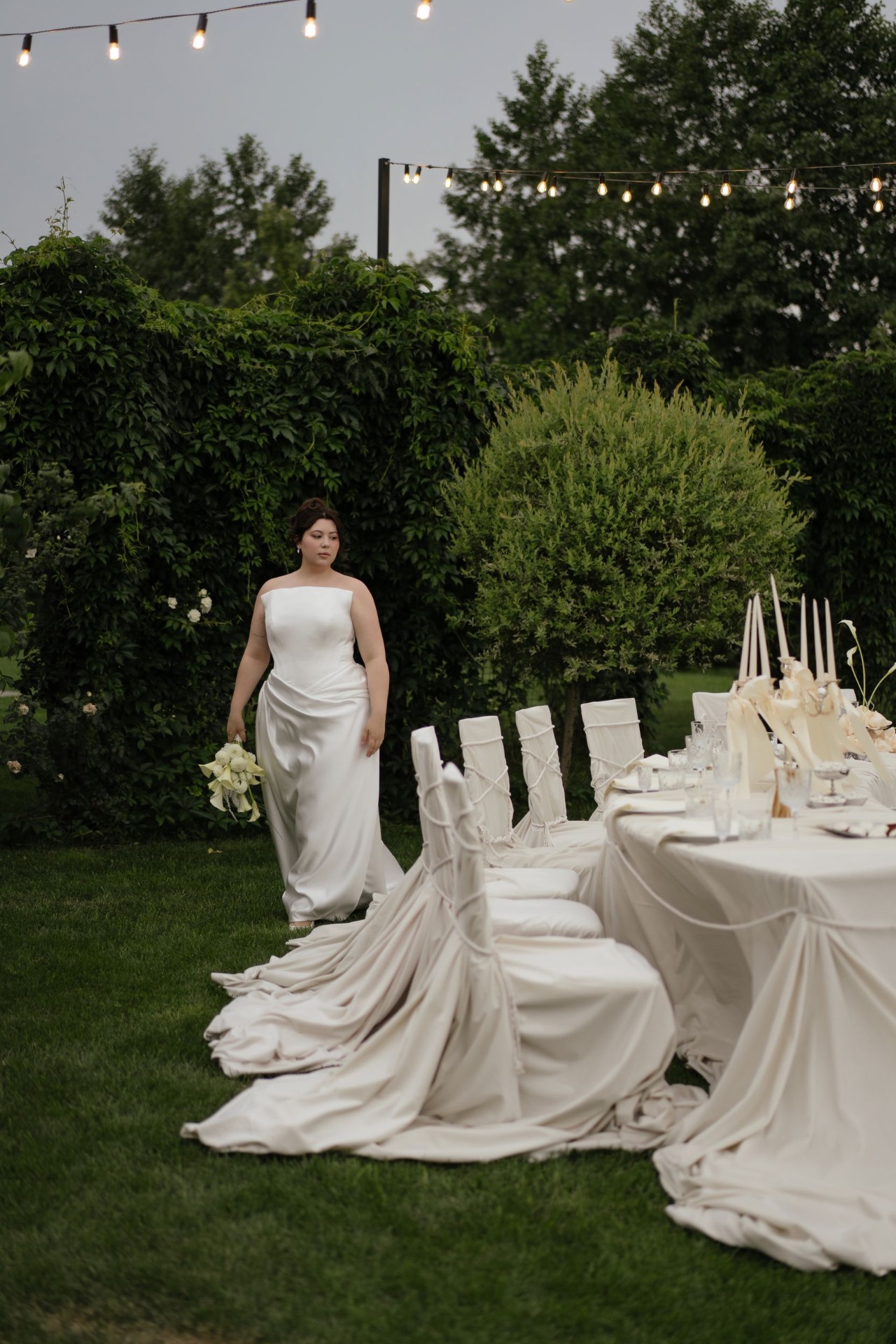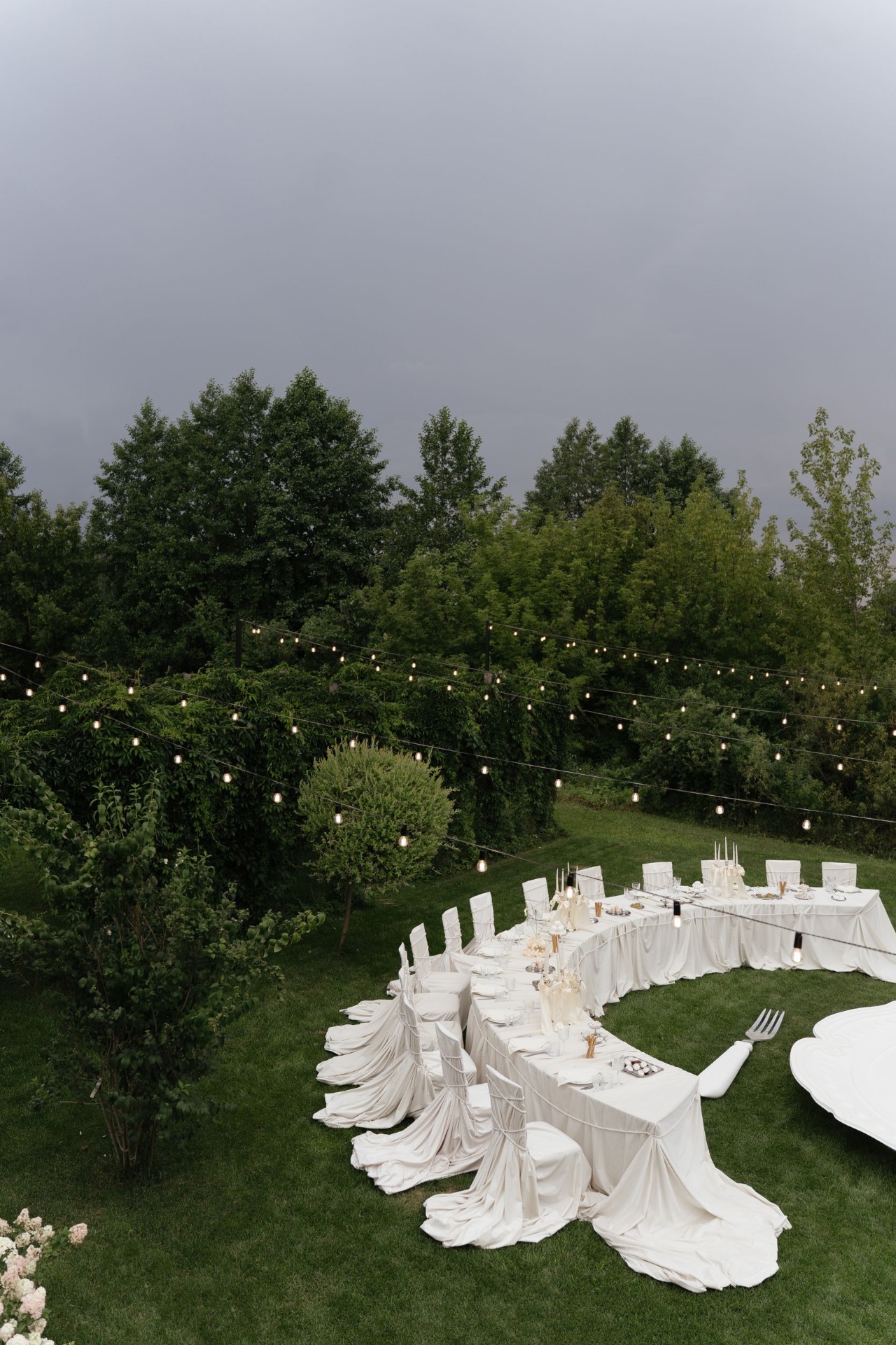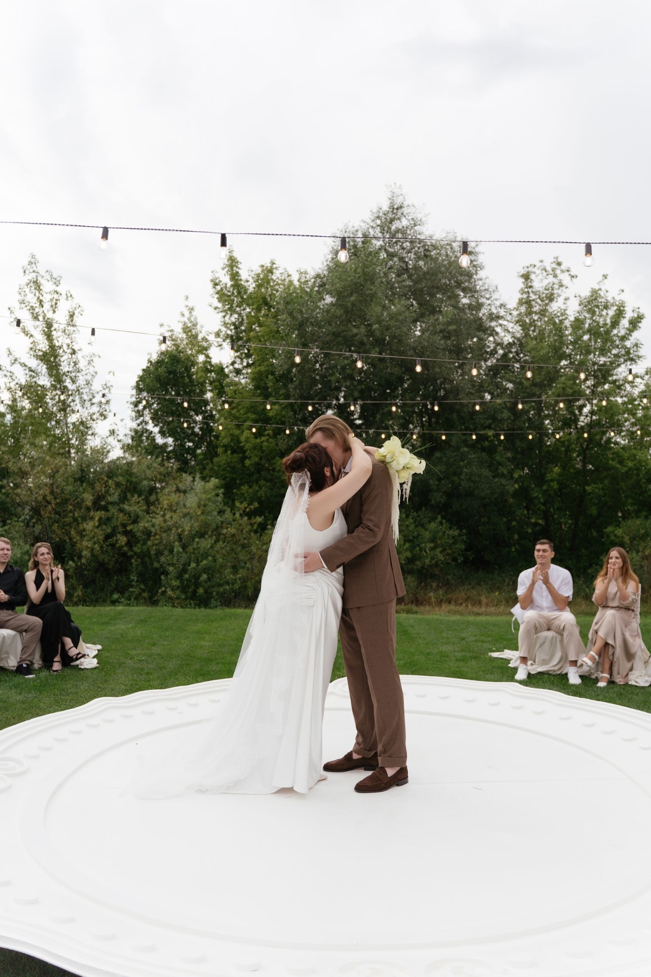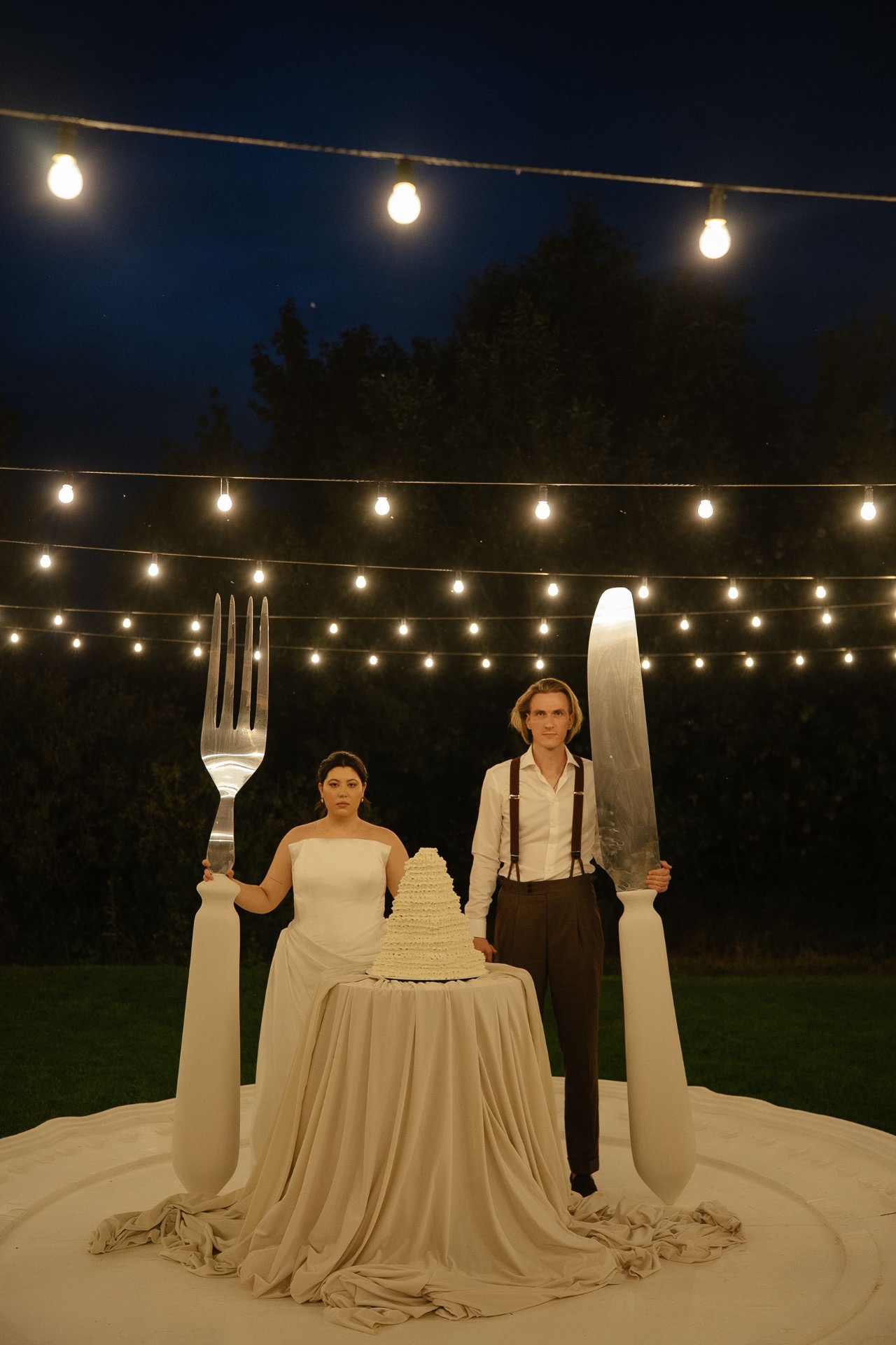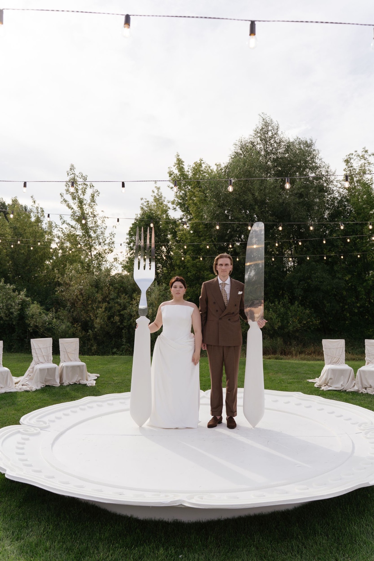 Всё располагалось прямо на газоне. В центре — зона церемонии в виде огромной тарелки с серебряными приборами. Сама церемония, первый танец, подача торта — всё происходило прямо на тарелке. Вокруг полукругом расположились столы гостей, а над газоном протянулись ретро-лампочки.